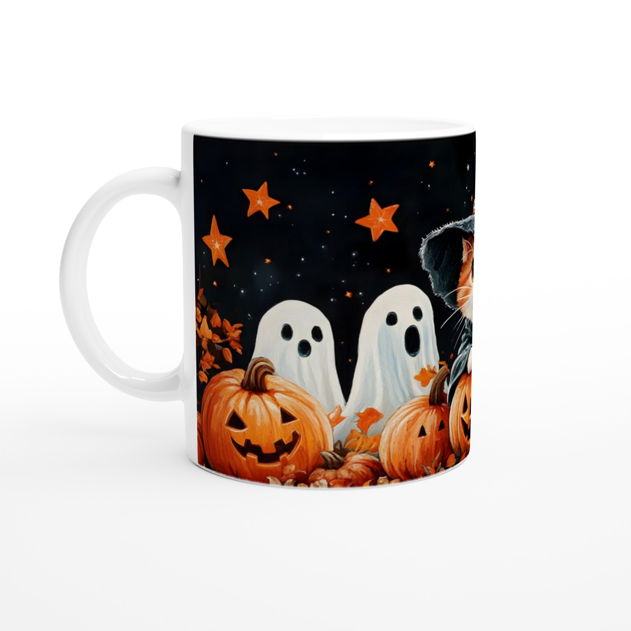 Muggen rymmer 11 oz (ca 3,25 dl), en lagom storlek för både jobb och hemmabruk. Den passar lika bra som en personlig vardagsmugg som en uppskattad present till familj, vänner eller kollegor som älskar katter, Halloween och en touch av mysig magi. Skapa din egen lilla Halloween-stämning – beställ din mugg idag!