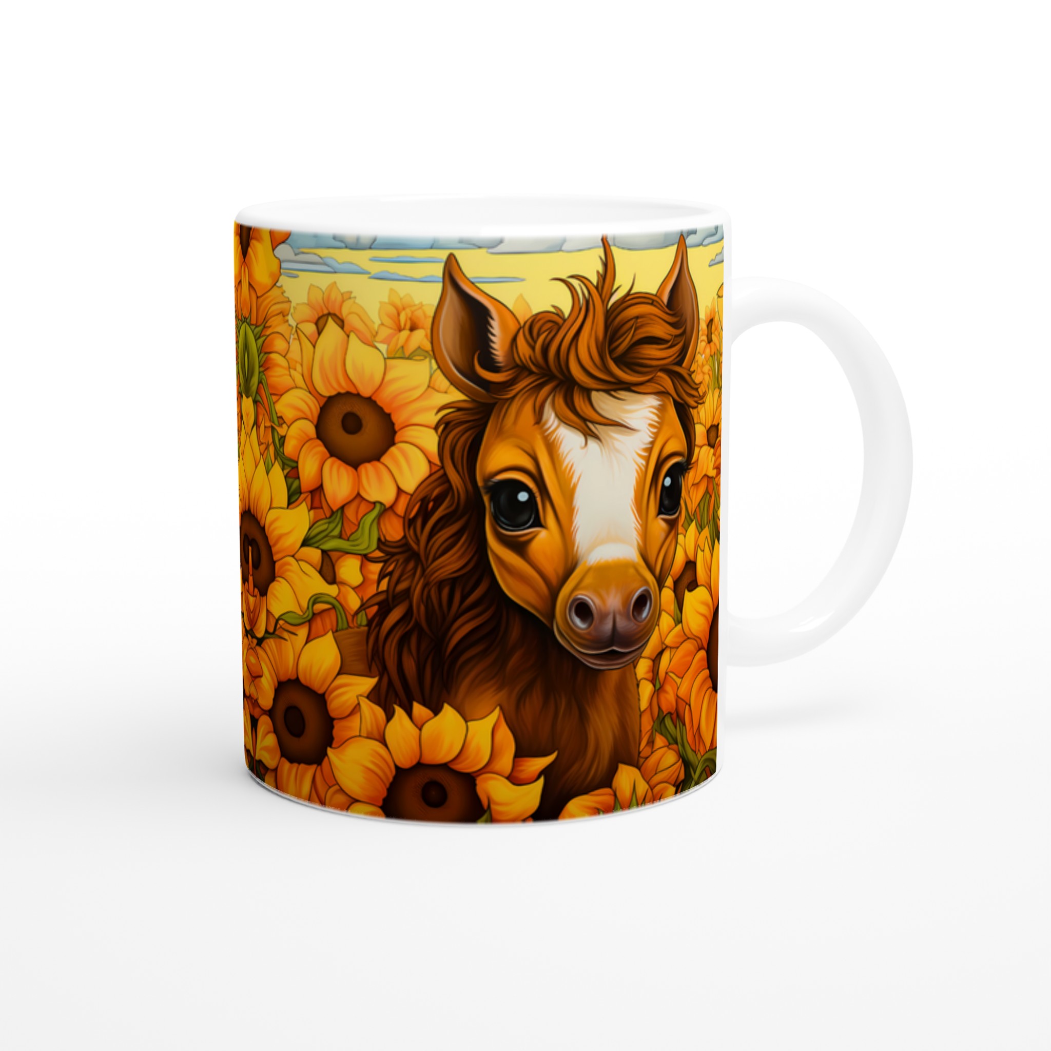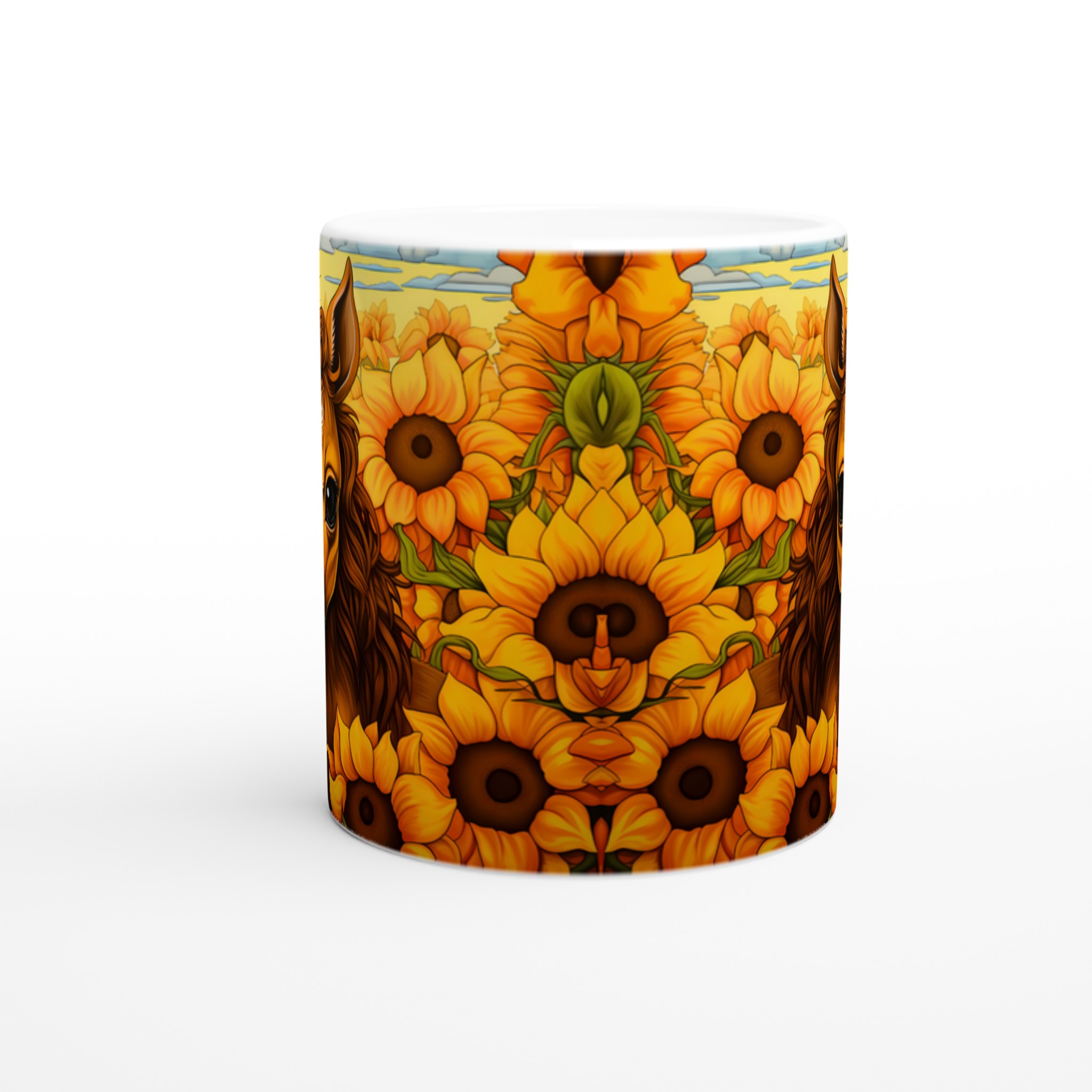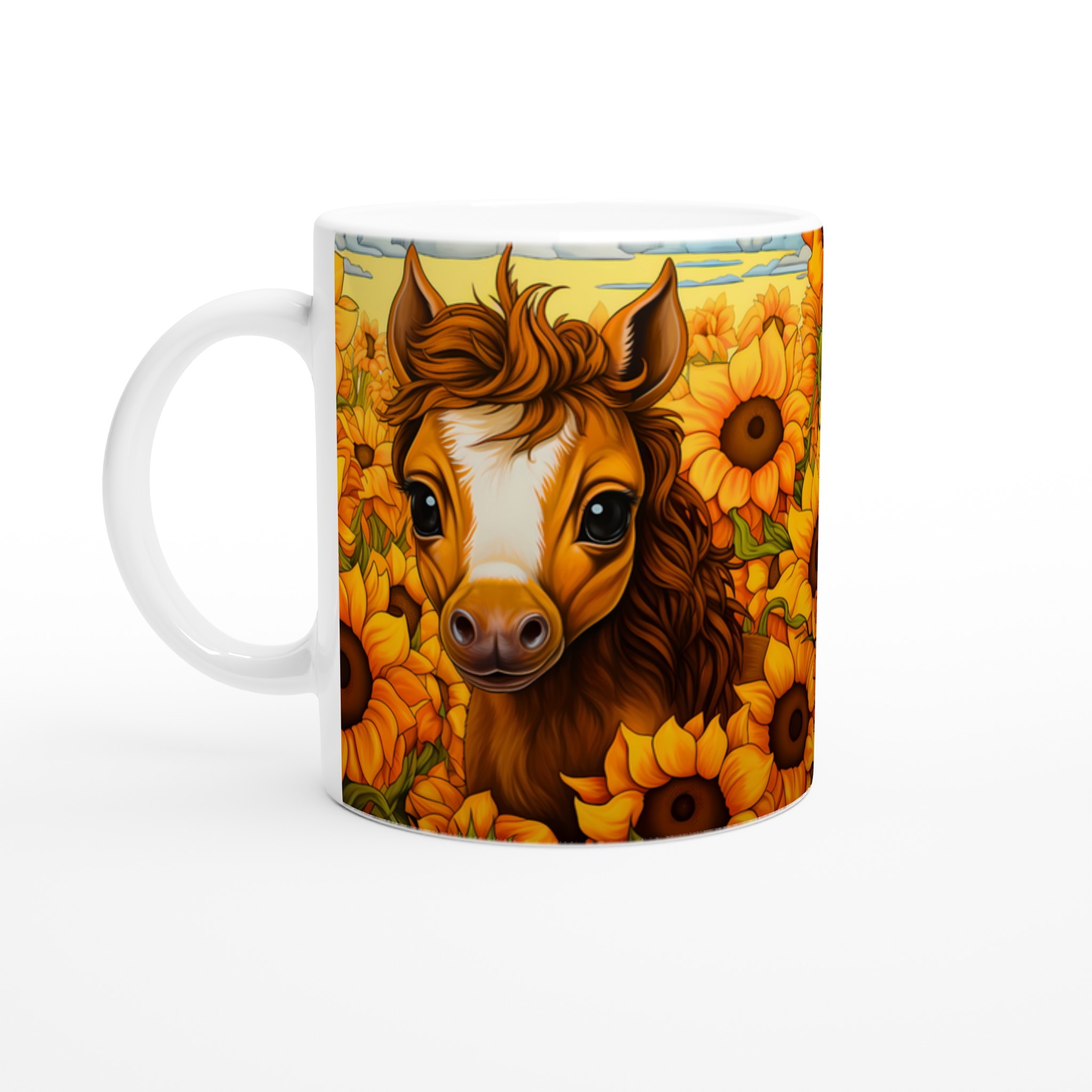 Föreställ dig att starta dagen med en kopp kaffe, omgiven av glädjen från ett solrosfält och sällskap av en bedårande liten häst. Denna stilrena keramiska mugg, prydd med ett charmigt motiv av en nyfiken häst bland solrosor, blir snabbt en vardagsfavorit. Perfekt för morgonkaffet, kvällens varma choklad eller när du bara vill njuta av en kopp te. Den blanka vita ytan gör att trycken framhävs med klara och levande färger, som håller sig fina även efter många turer i mikron och diskmaskinen.