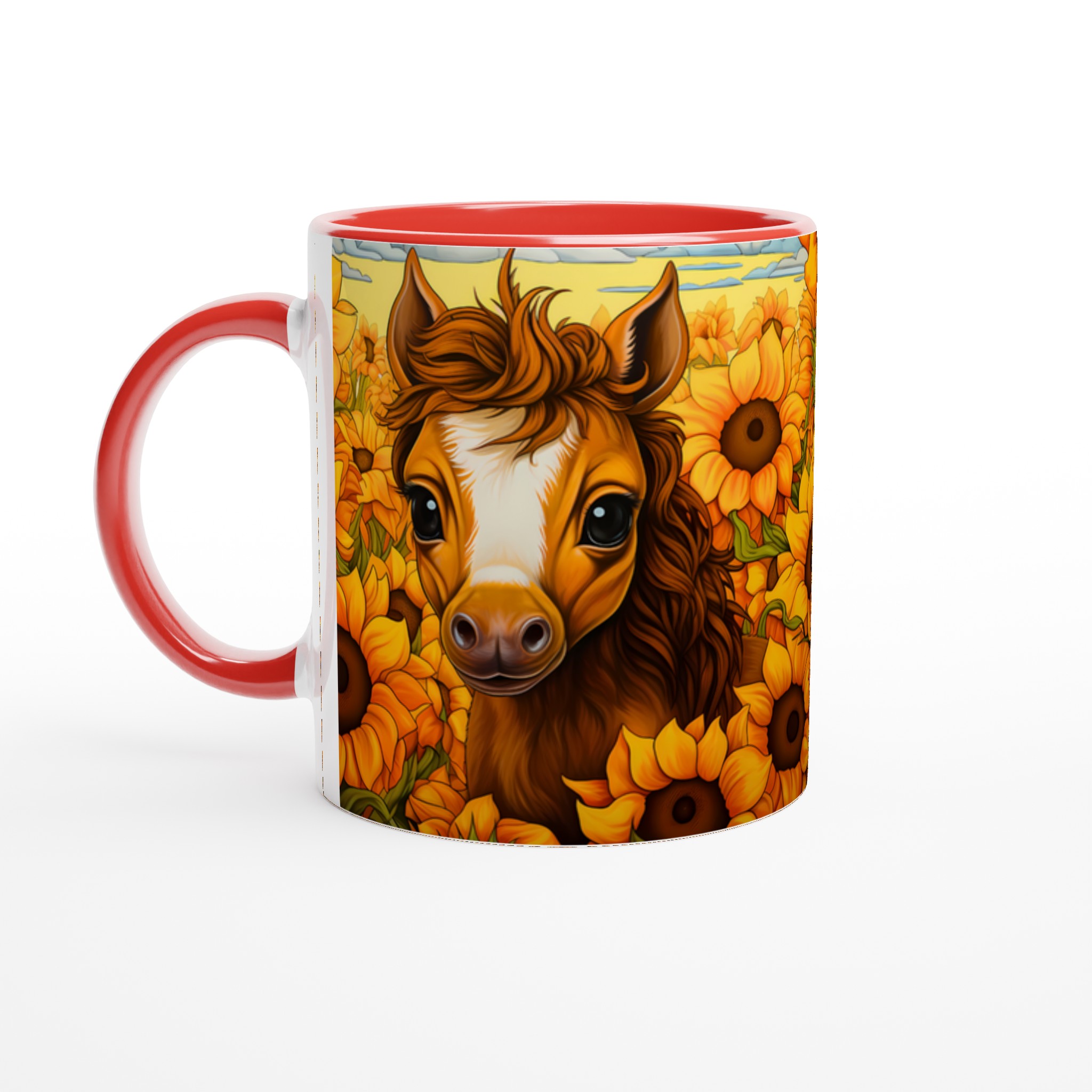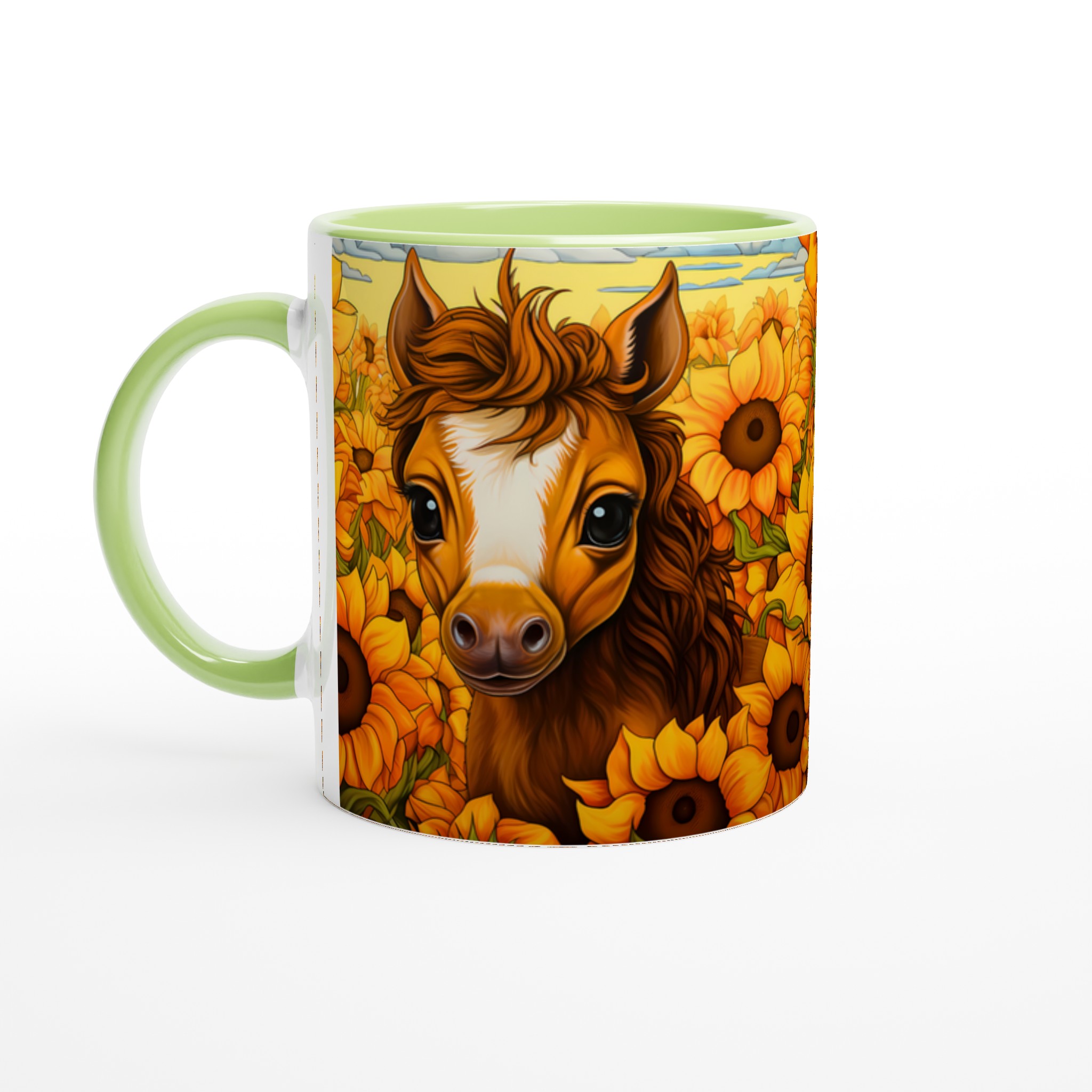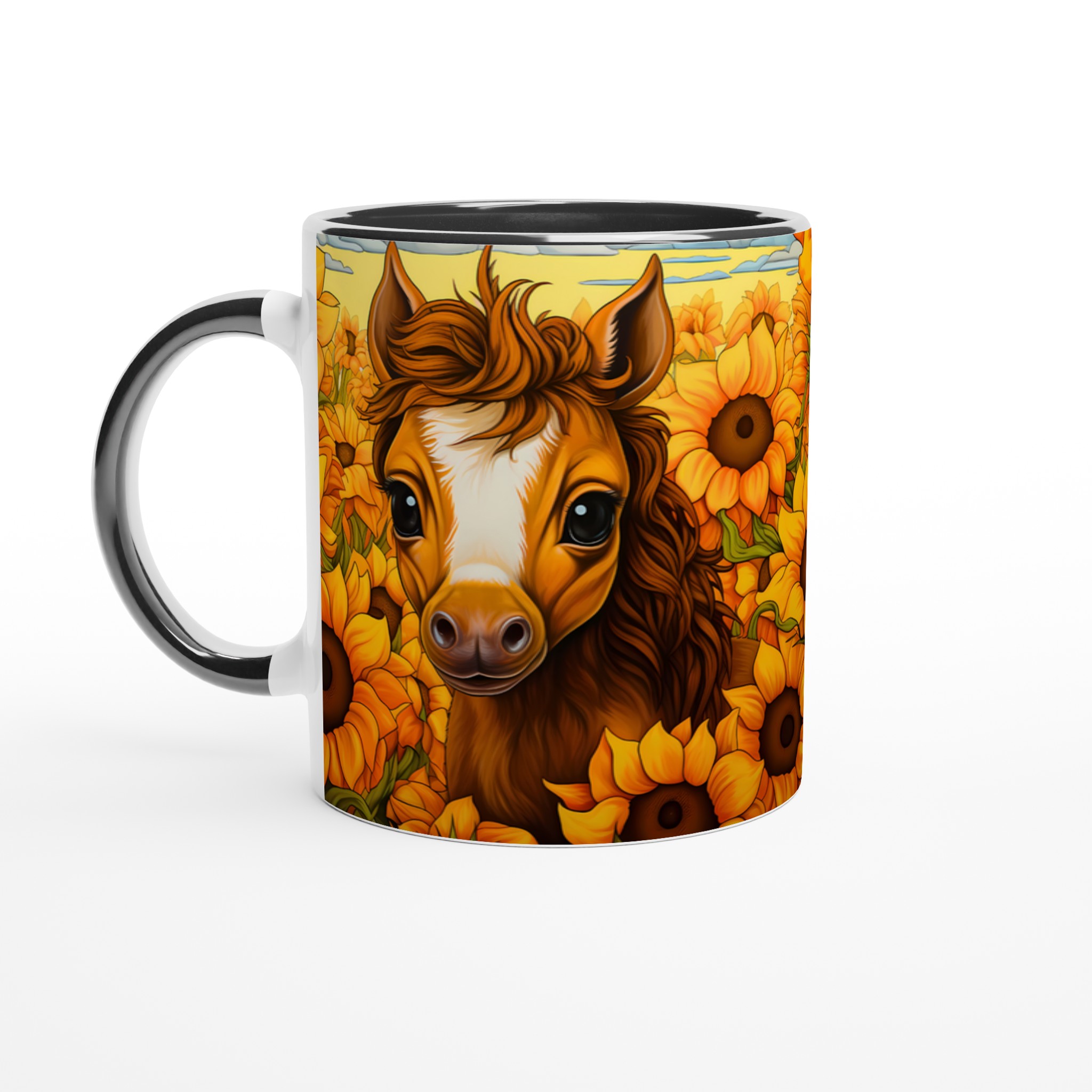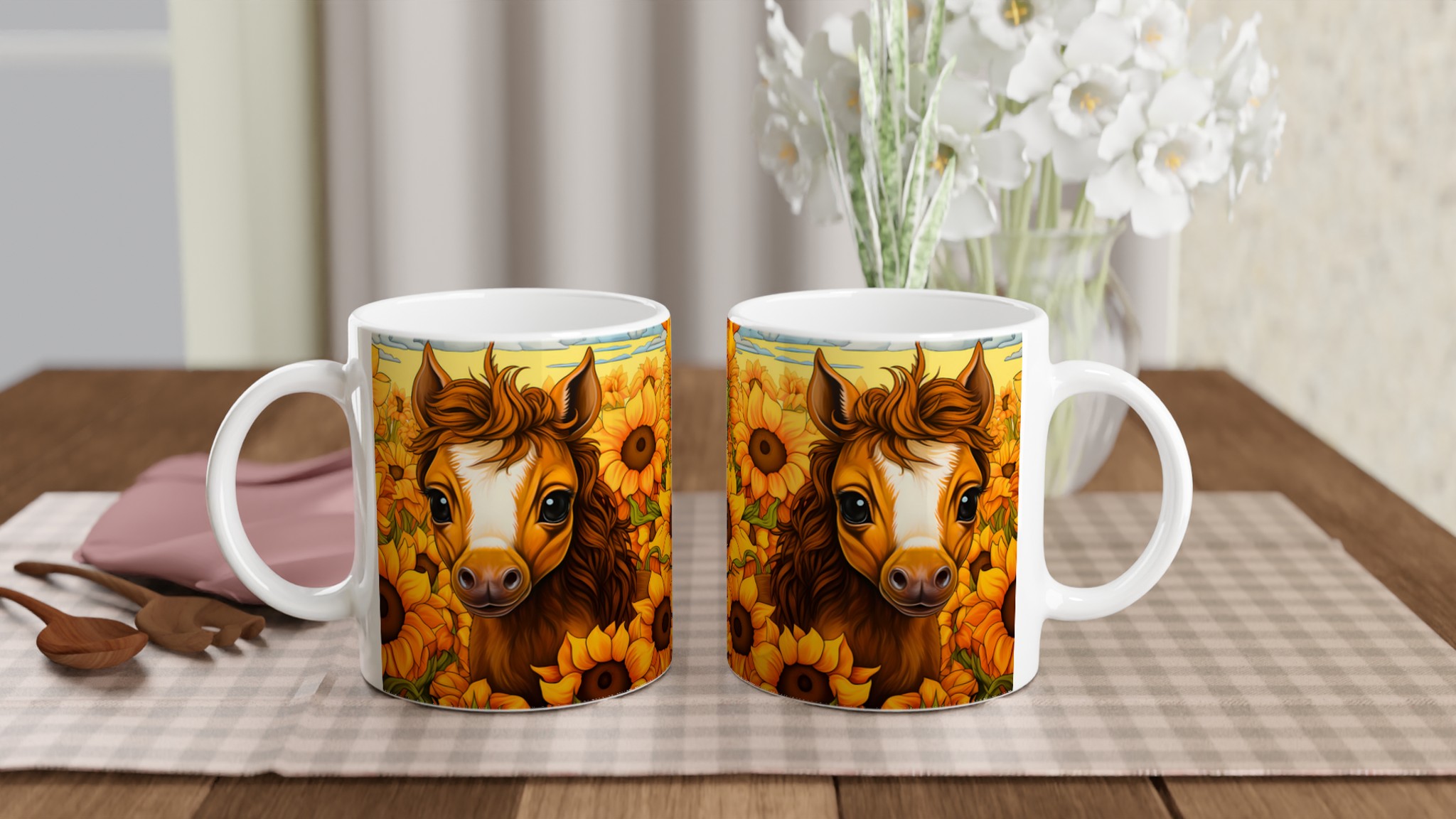 Föreställ dig att starta dagen med en kopp kaffe, omgiven av glädjen från ett solrosfält och sällskap av en bedårande liten häst. Denna stilrena keramiska mugg, prydd med ett charmigt motiv av en nyfiken häst bland solrosor, blir snabbt en vardagsfavorit. Perfekt för morgonkaffet, kvällens varma choklad eller när du bara vill njuta av en kopp te. Den blanka vita ytan gör att trycken framhävs med klara och levande färger, som håller sig fina även efter många turer i mikron och diskmaskinen.