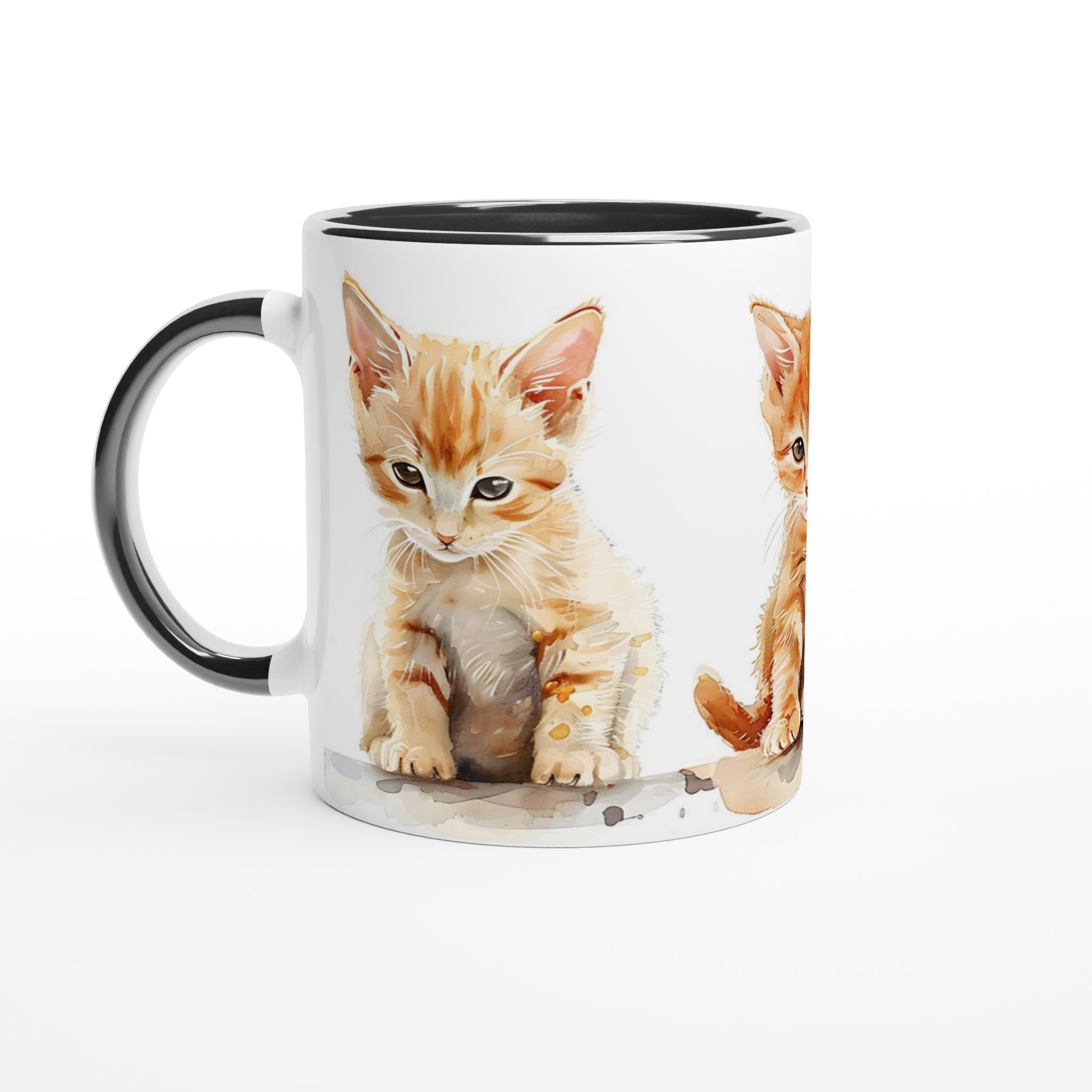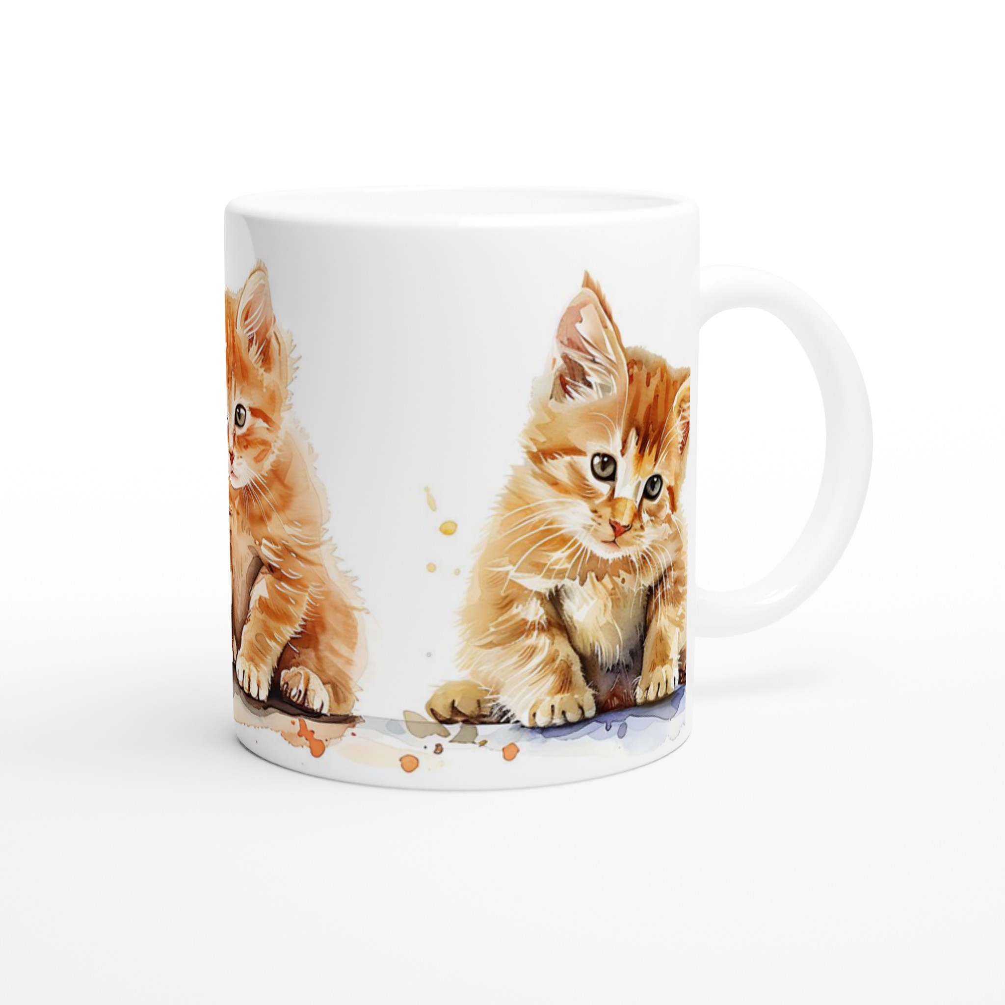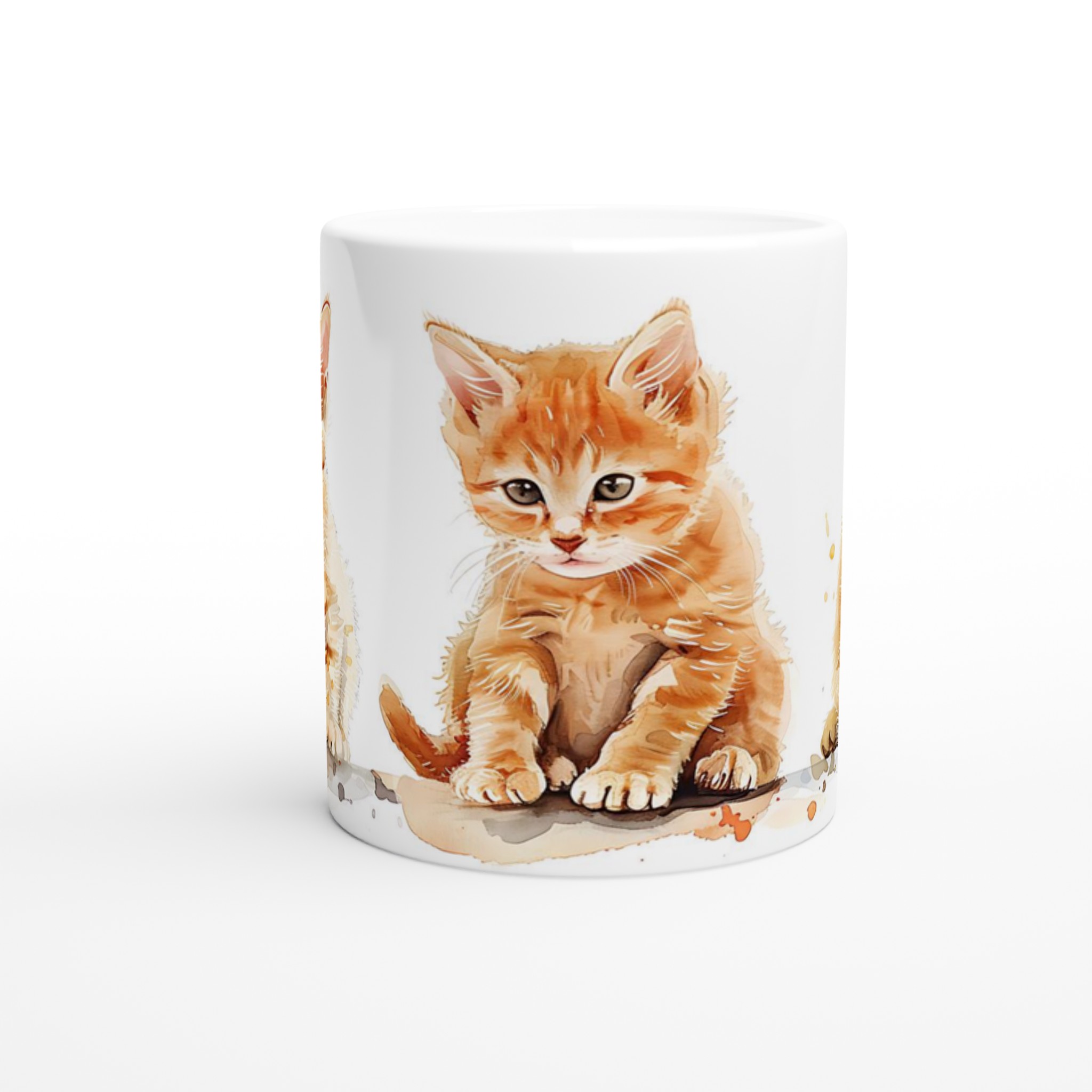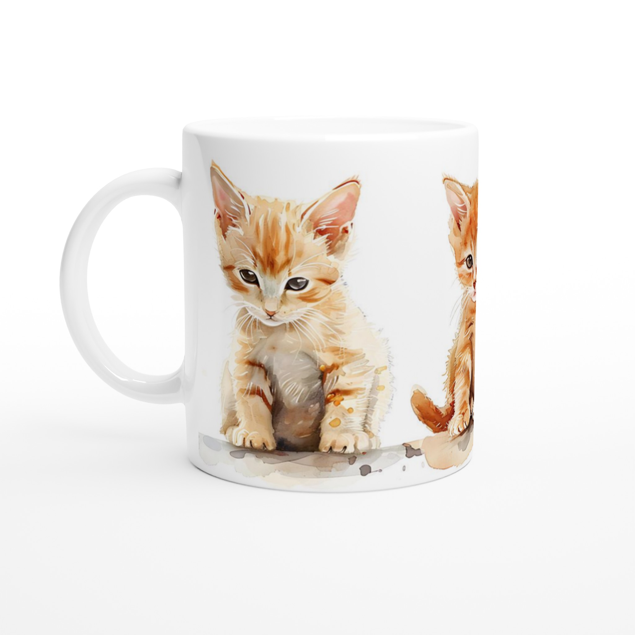 Den här stilrena keramiska muggen, prydd med en förtrollande akvarellillustration av tre söta kattungar, blir snabbt en vardagsfavorit. De lekfulla orangea nyanserna och de uttrycksfulla ögonen ger varje klunk en extra dos glädje. Perfekt för morgonkaffet, kvällens varma choklad eller när du bara vill njuta av en kopp te. Den blanka vita ytan gör att trycken framhävs med klara och levande färger, som håller sig fina även efter många turer i mikron och diskmaskinen.
