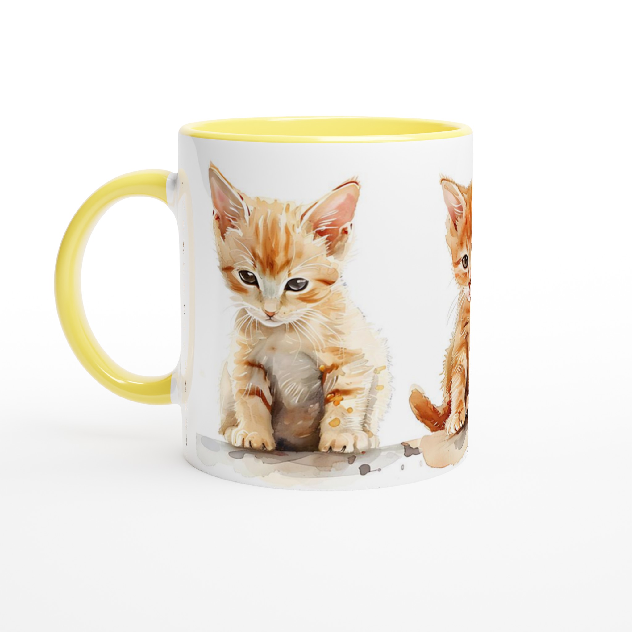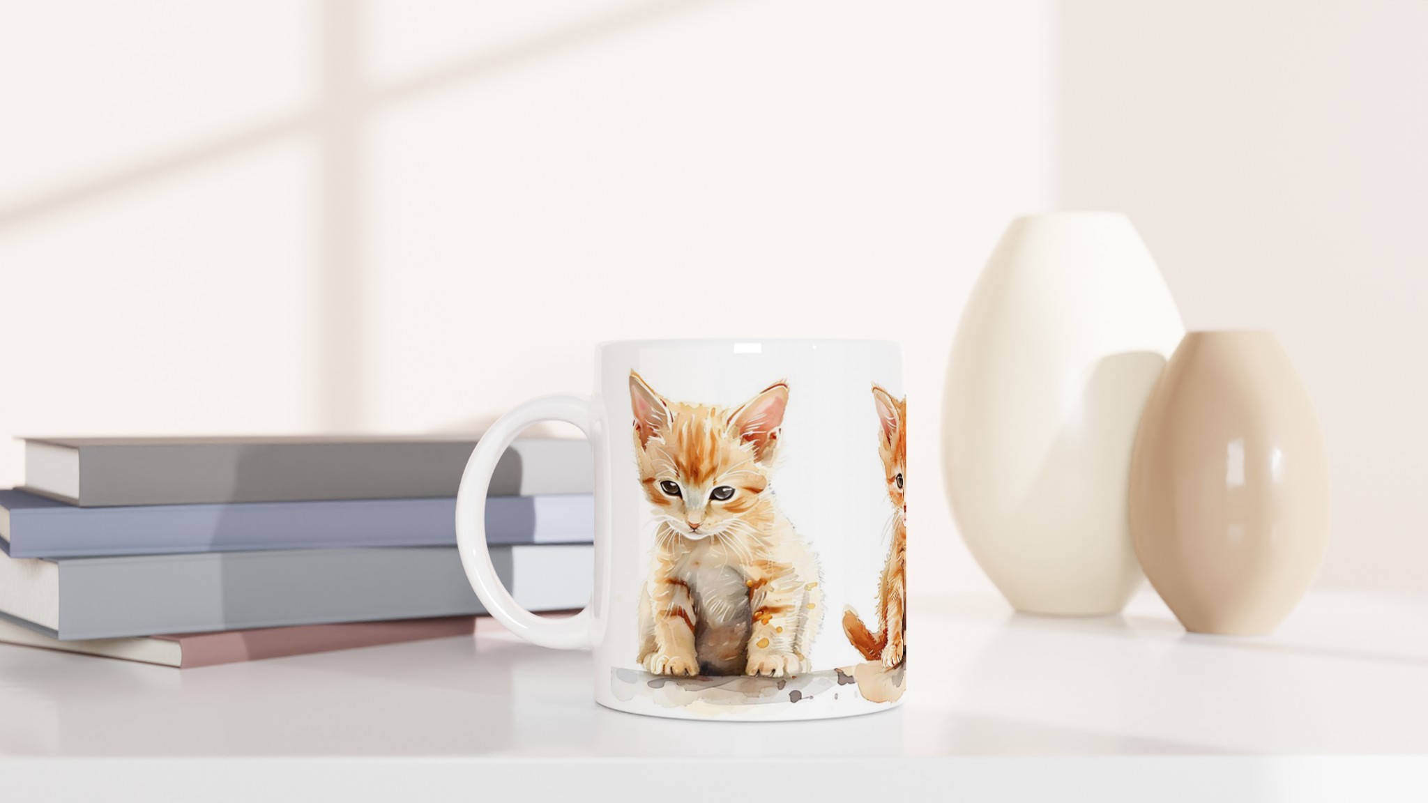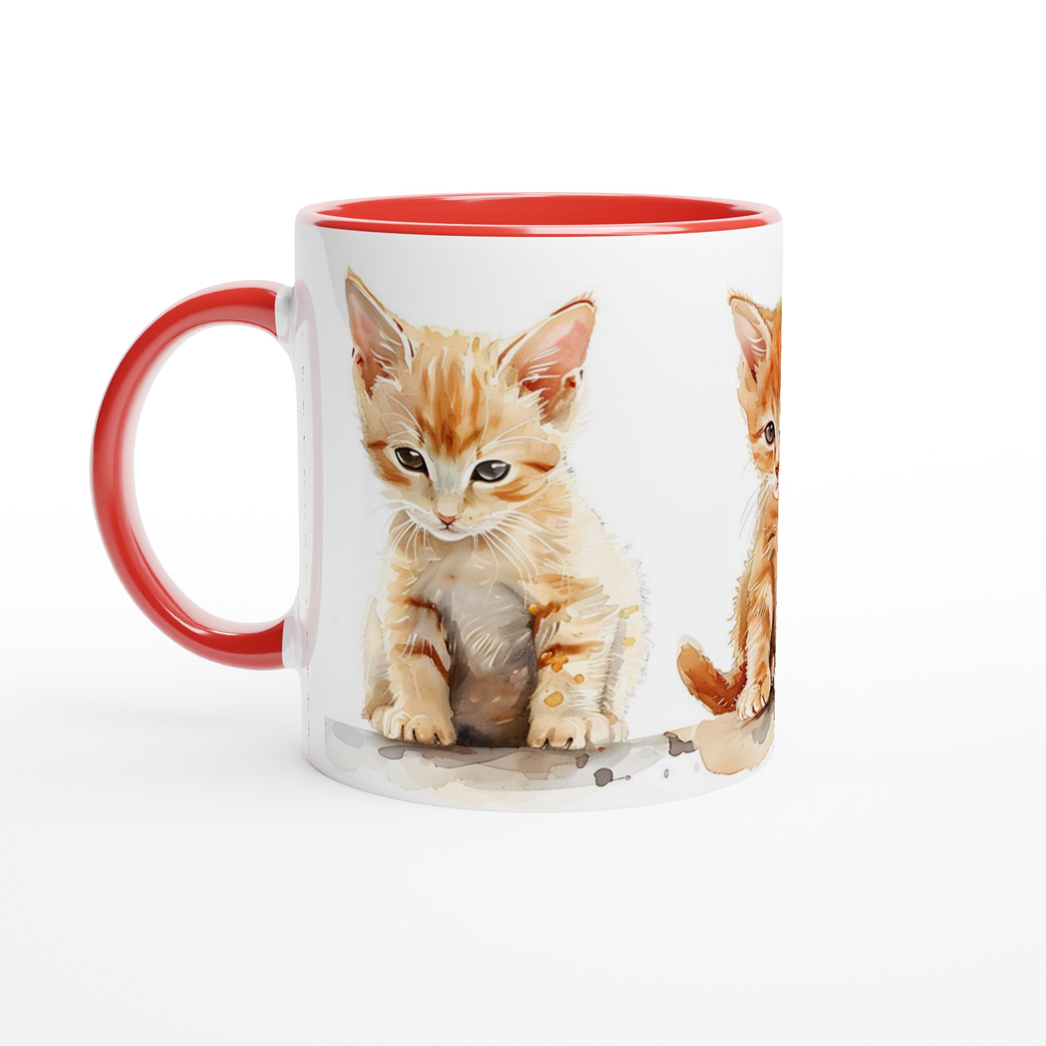 Den här stilrena keramiska muggen, prydd med en förtrollande akvarellillustration av tre söta kattungar, blir snabbt en vardagsfavorit. De lekfulla orangea nyanserna och de uttrycksfulla ögonen ger varje klunk en extra dos glädje. Perfekt för morgonkaffet, kvällens varma choklad eller när du bara vill njuta av en kopp te. Den blanka vita ytan gör att trycken framhävs med klara och levande färger, som håller sig fina även efter många turer i mikron och diskmaskinen.