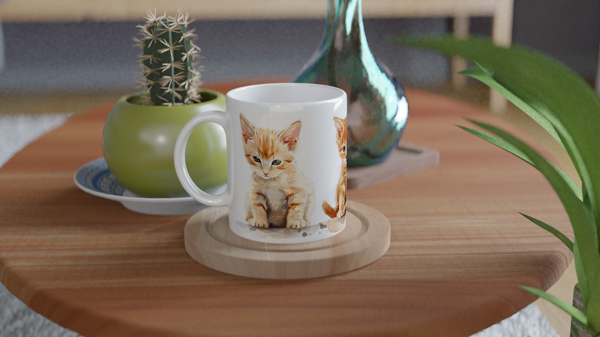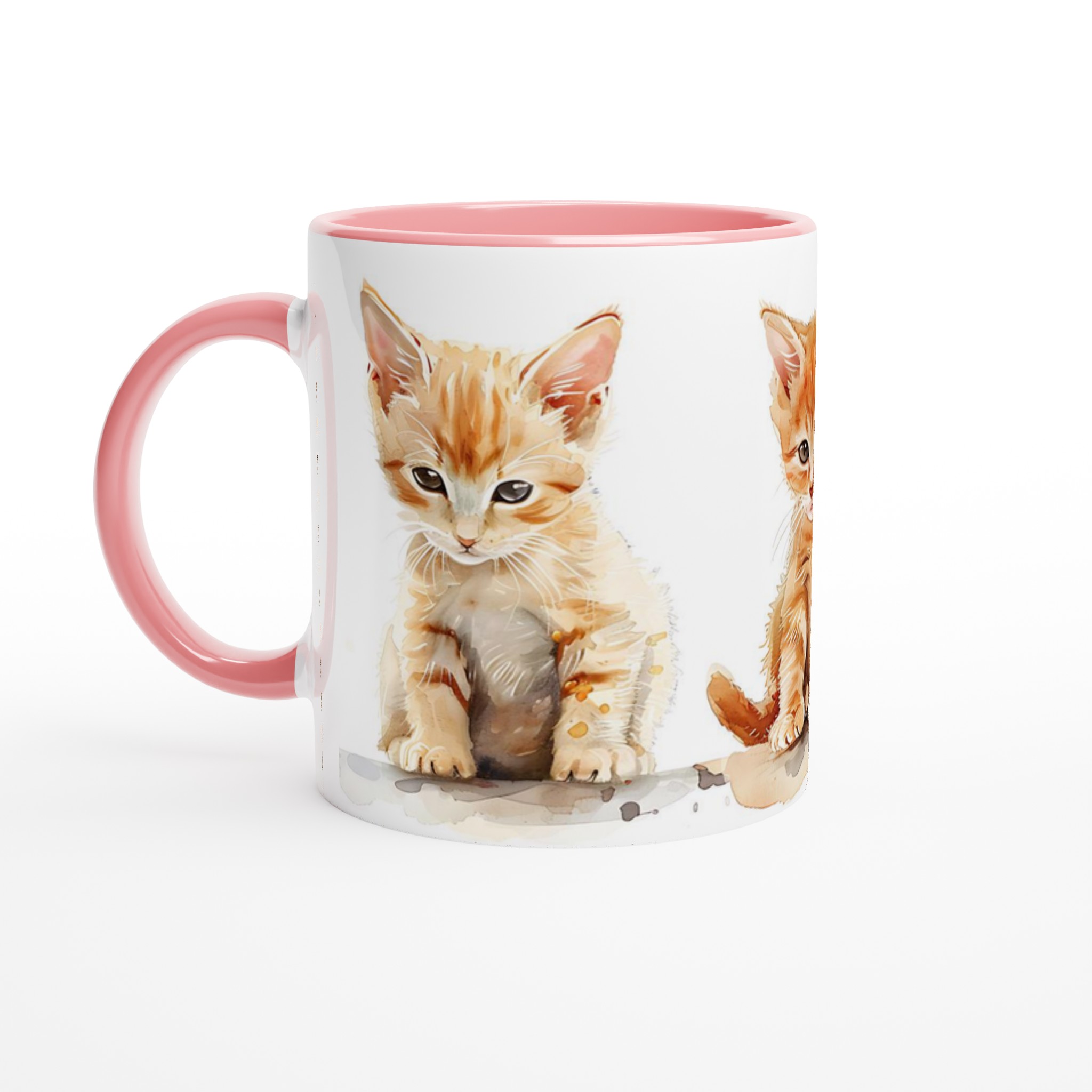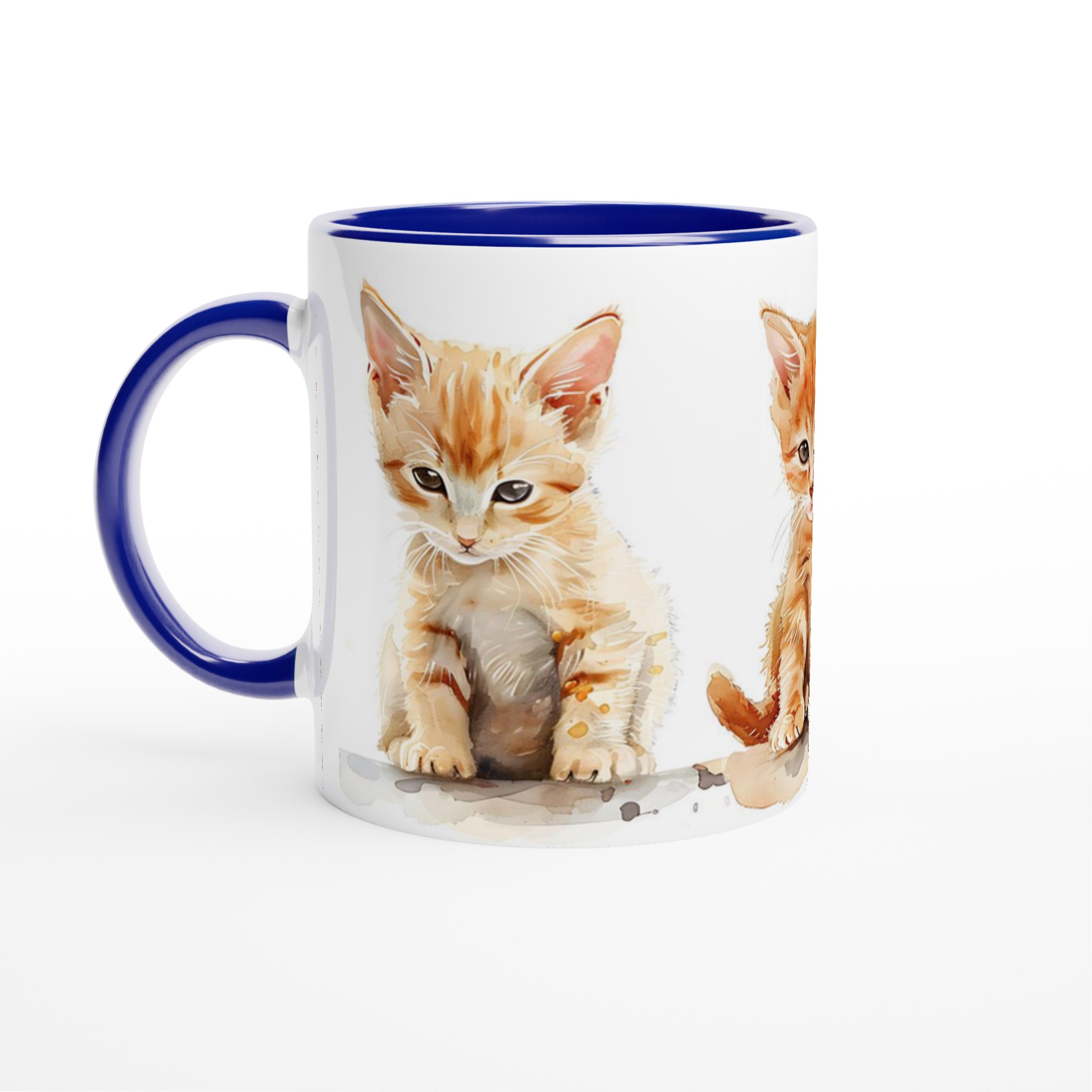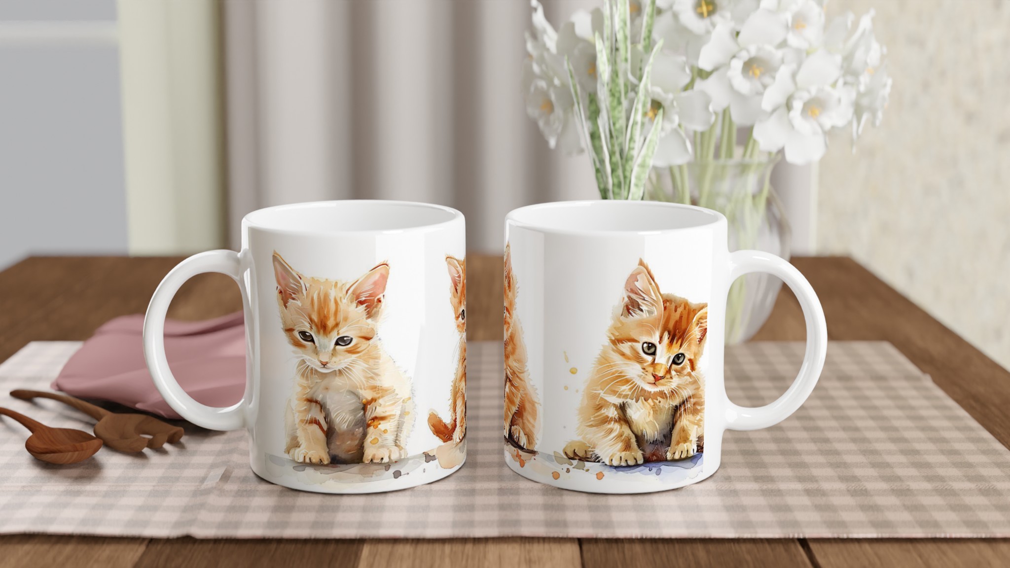 Den här stilrena keramiska muggen, prydd med en förtrollande akvarellillustration av tre söta kattungar, blir snabbt en vardagsfavorit. De lekfulla orangea nyanserna och de uttrycksfulla ögonen ger varje klunk en extra dos glädje. Perfekt för morgonkaffet, kvällens varma choklad eller när du bara vill njuta av en kopp te. Den blanka vita ytan gör att trycken framhävs med klara och levande färger, som håller sig fina även efter många turer i mikron och diskmaskinen.