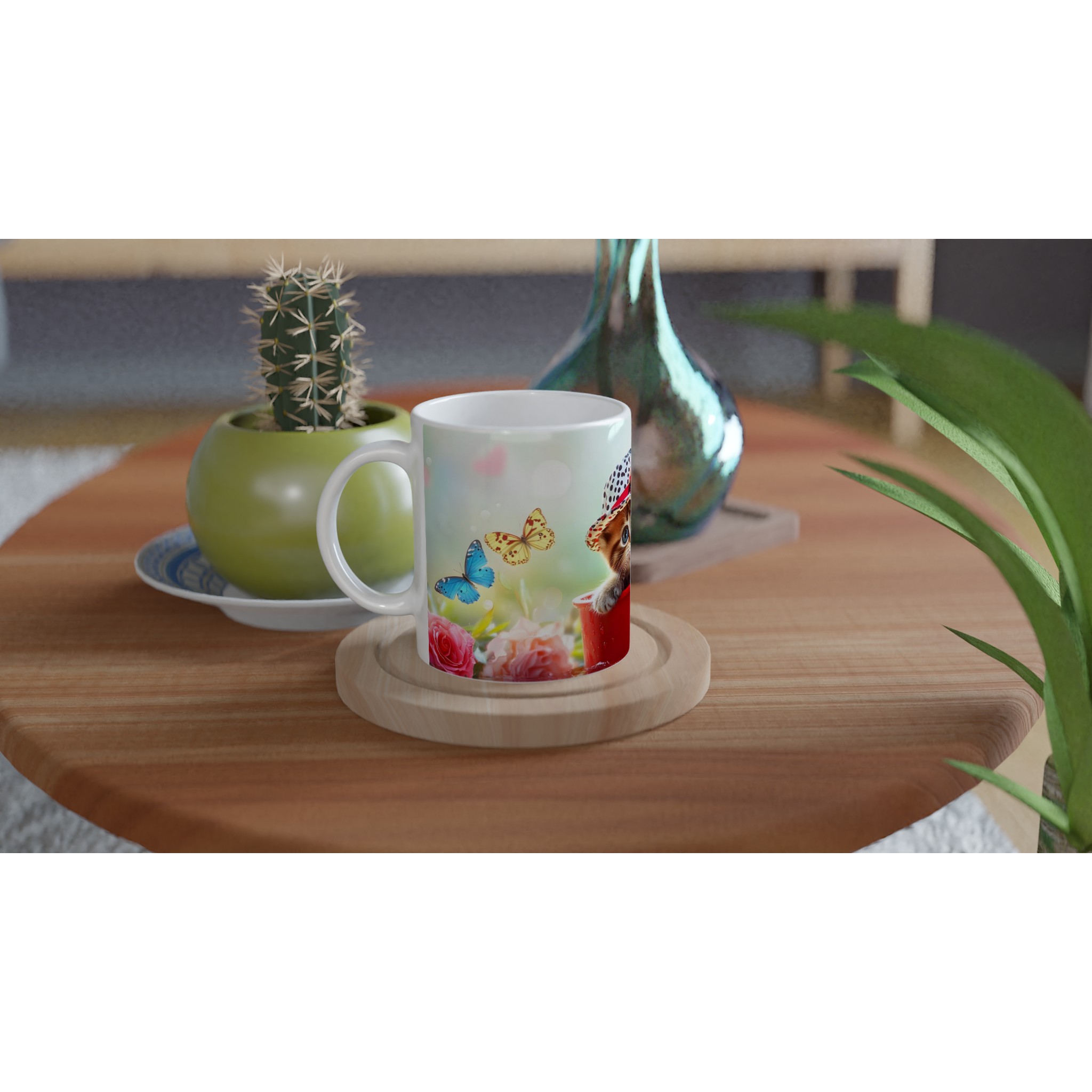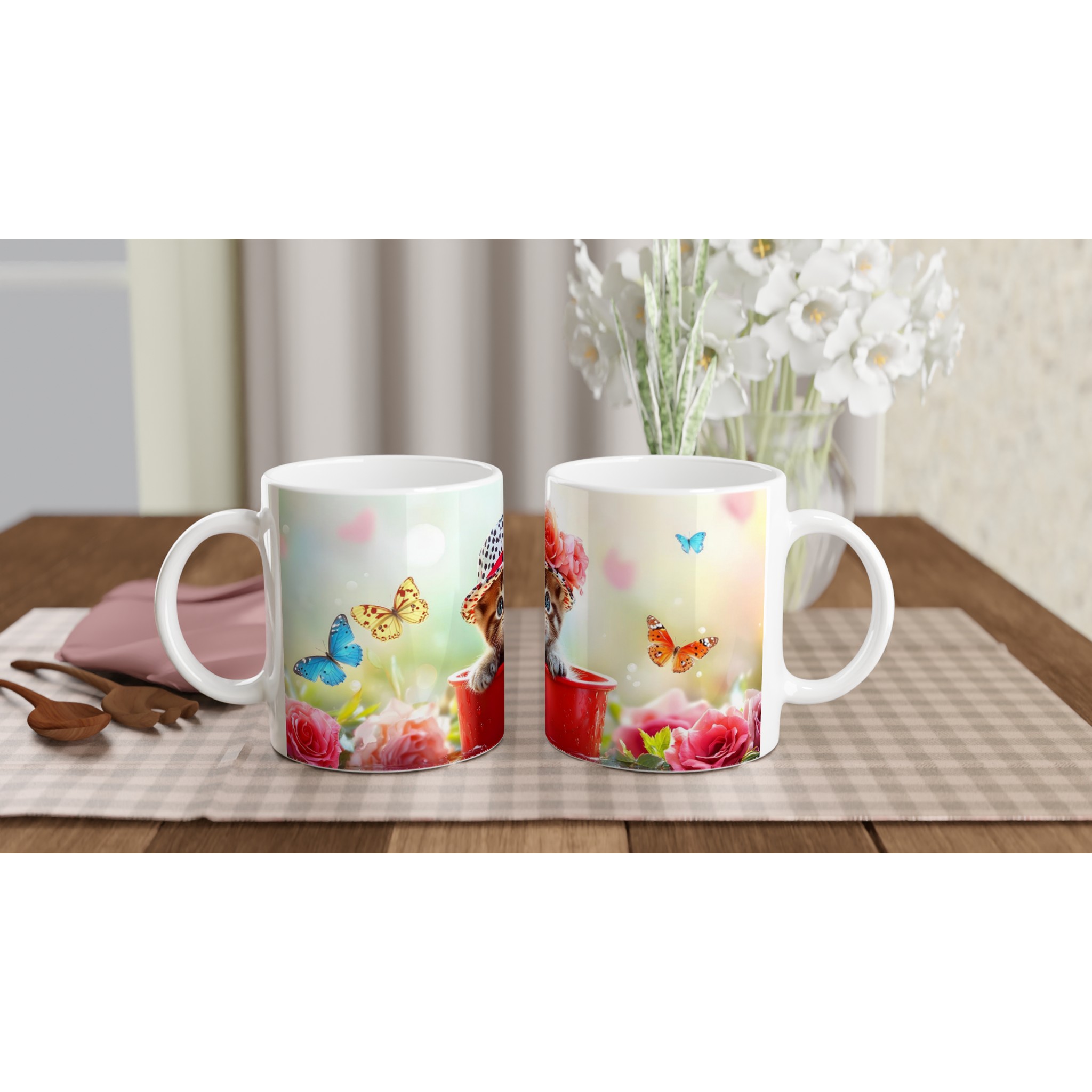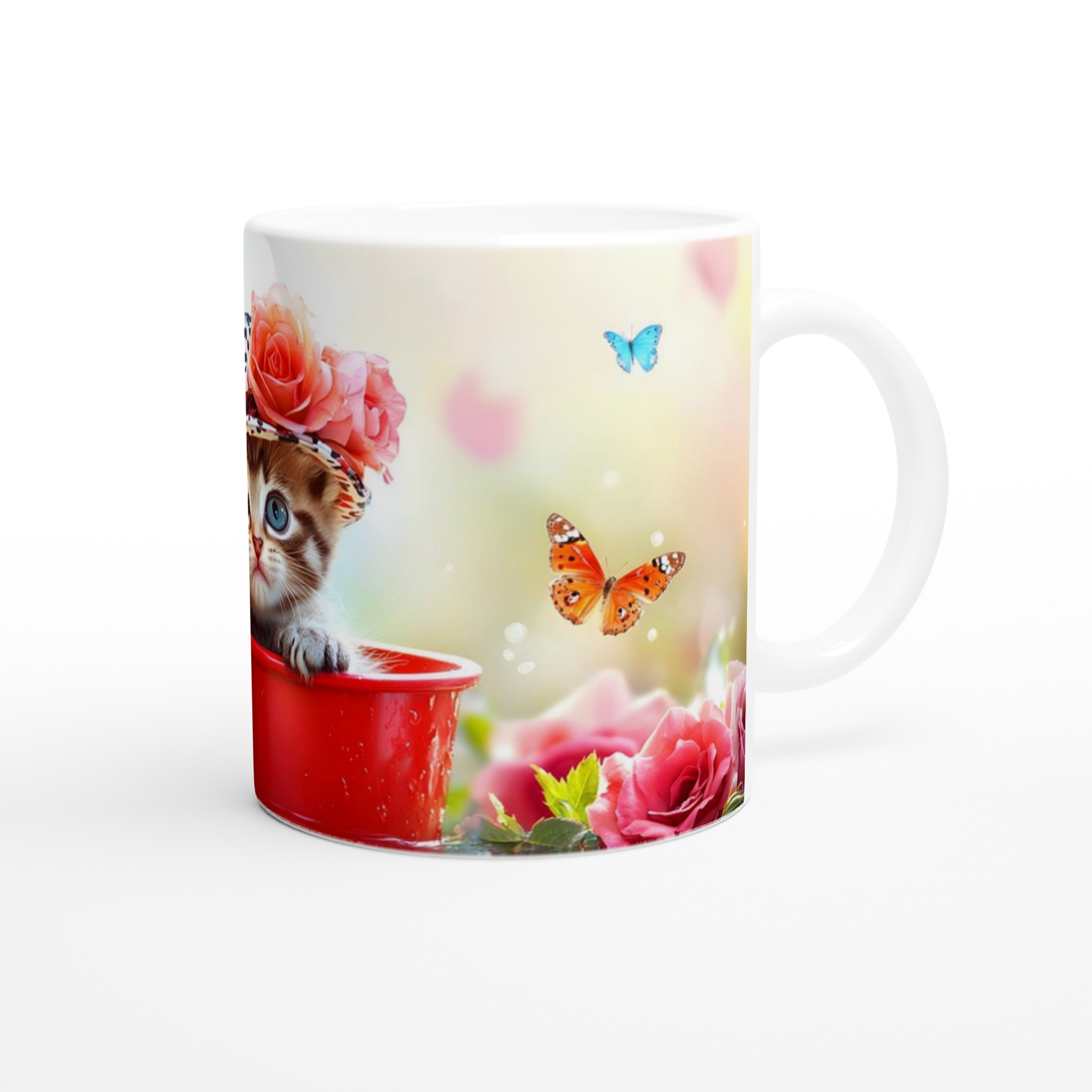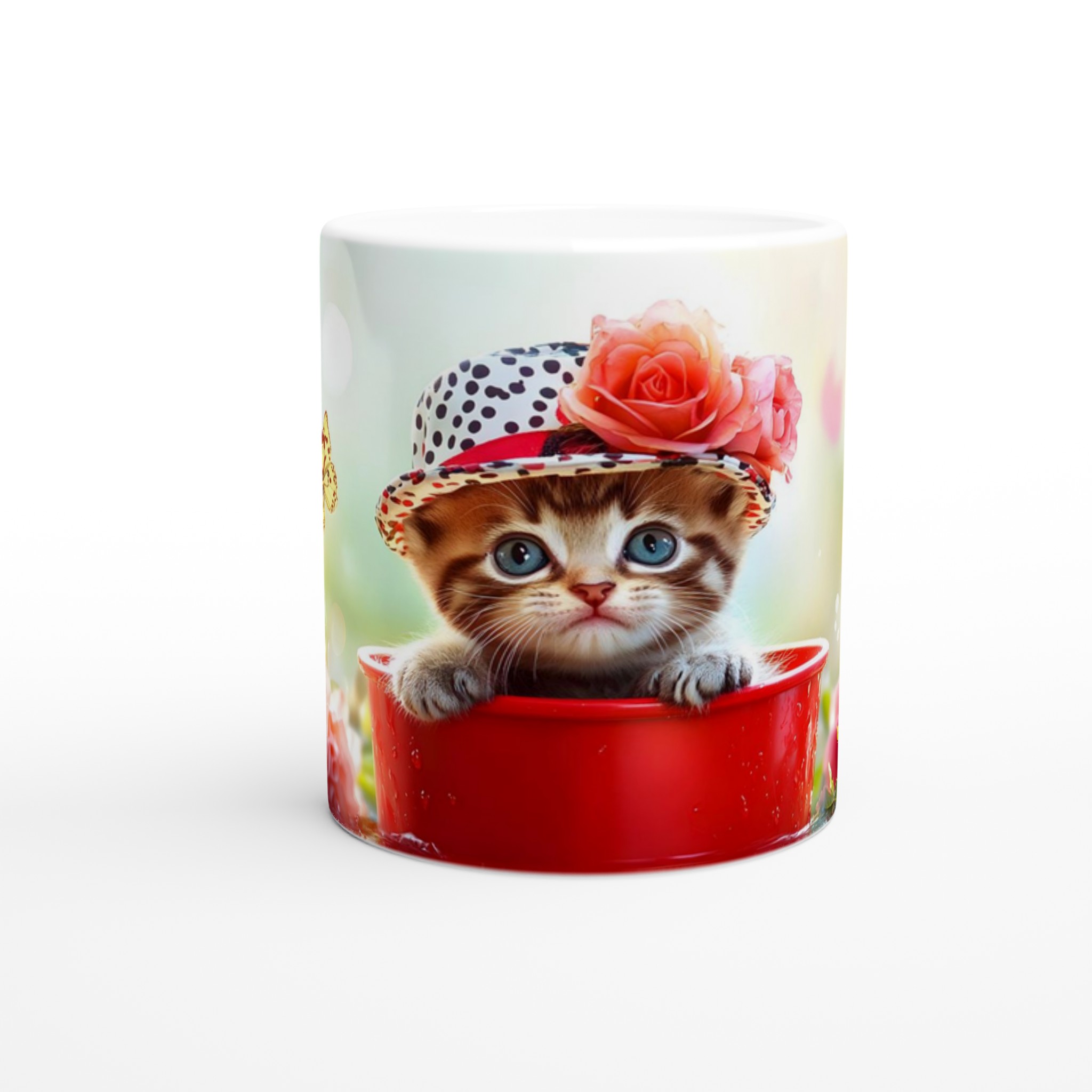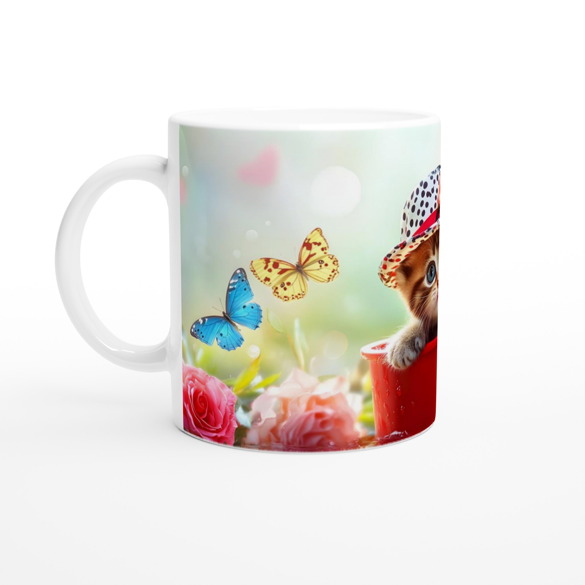 Fånga hjärtan med vår bedårande keramikmugg med en förtrollande kattunge i en chic hatt, omgiven av lekfulla fjärilar och ljuvliga rosor! Denna stilrena och vackra keramikmugg är perfekt för alla dagens stunder – morgonkaffet, en värmande kopp te eller en härlig varm choklad. Den blanka vita ytan gör att trycken framträder klart och färgstarkt, vilket gör muggen till en riktig favorit i vardagen. Varje sip blir en liten stund av glädje, oavsett om du är en hängiven kattägare eller letar efter den perfekta presenten till någon som älskar söta motiv.