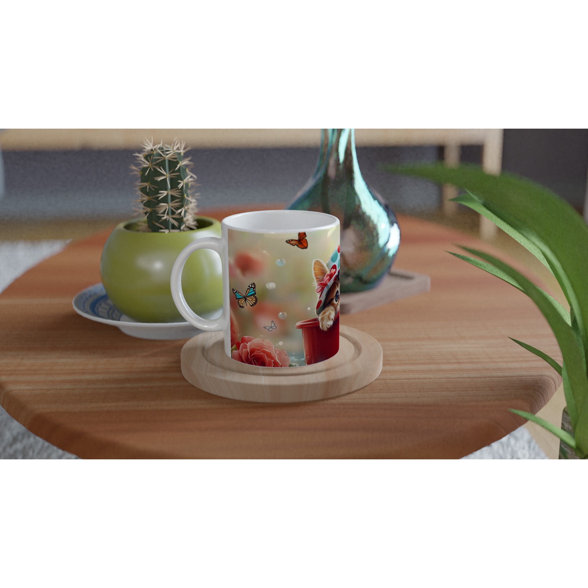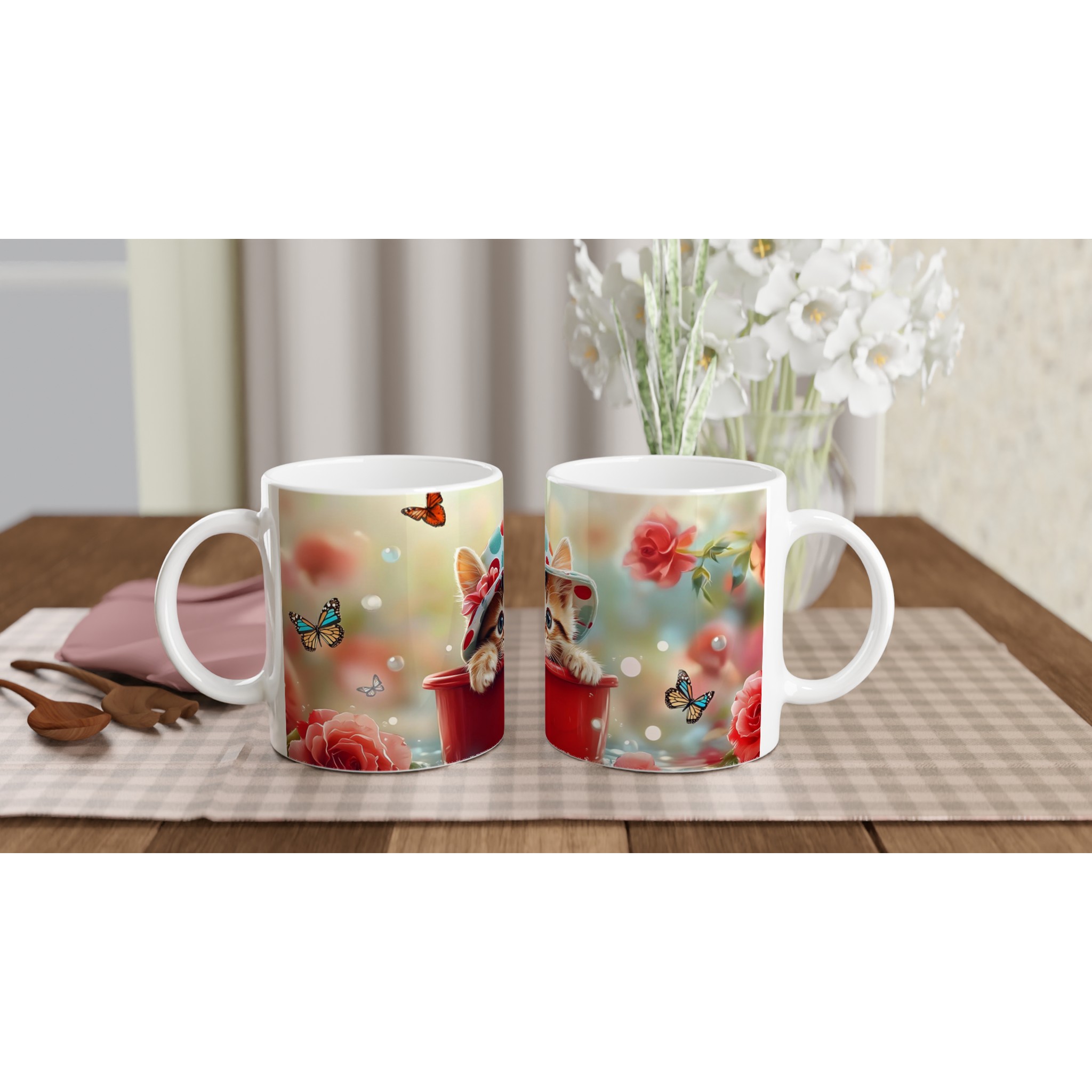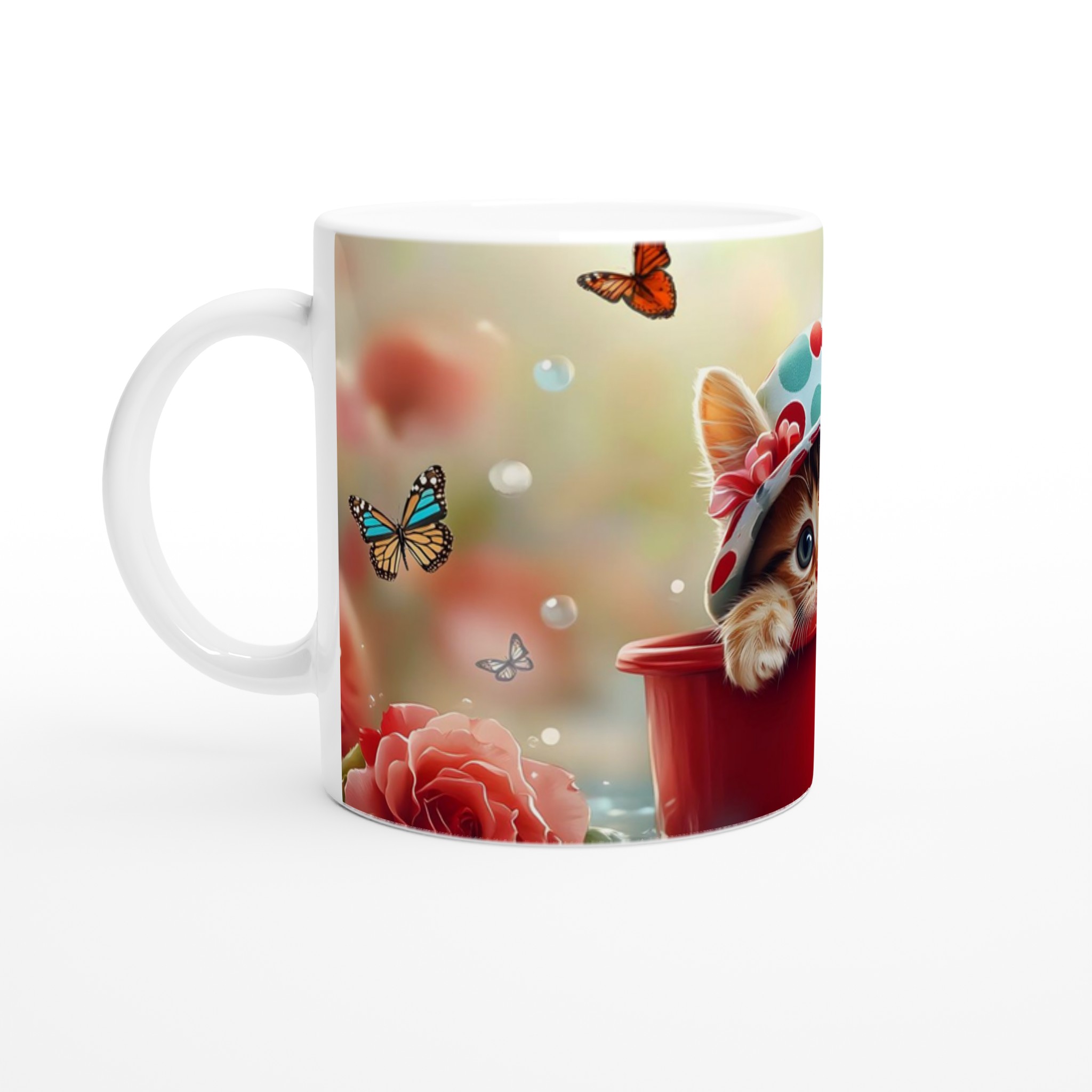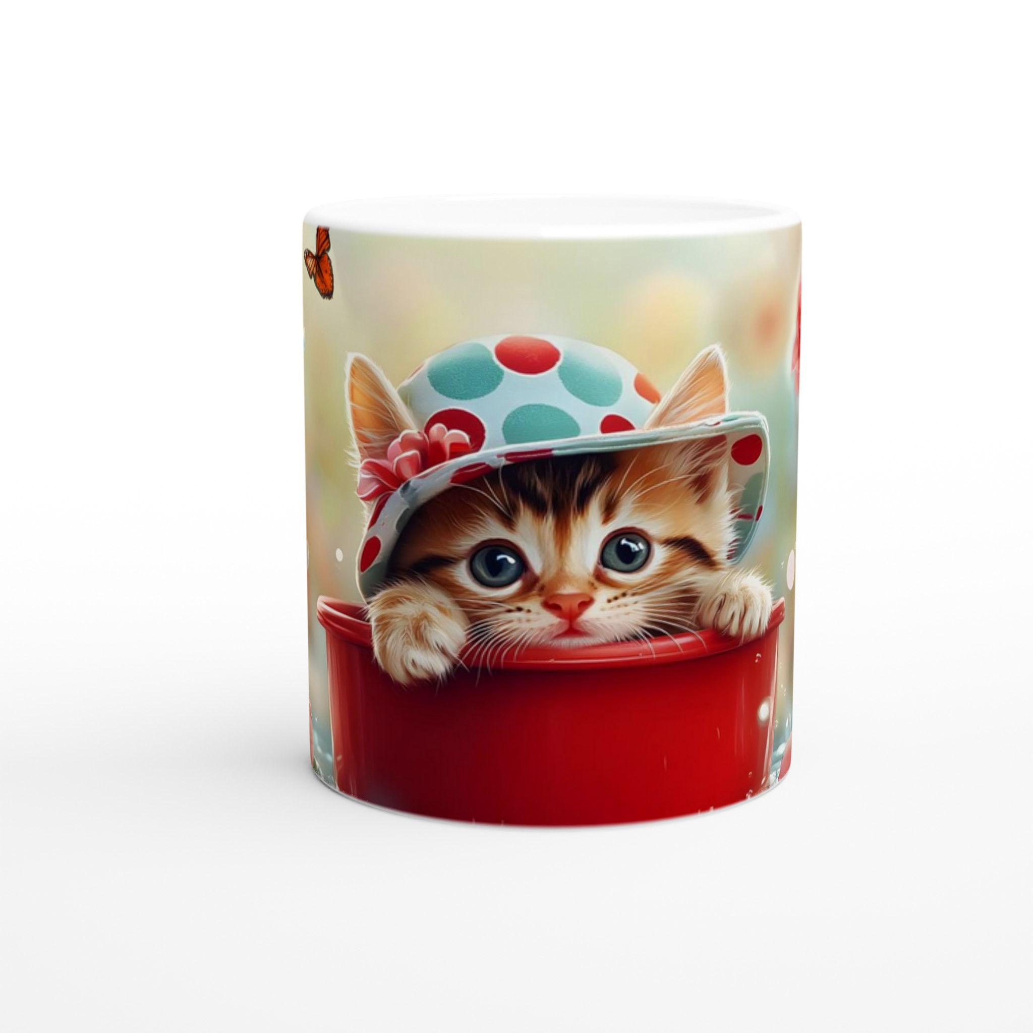 Förgyll din dag med denna oemotståndligt söta keramikmugg, prydd med en lekfull kattunge i hatt omgiven av fjärilar och blommor. Denna mugg är perfekt för alla dagens stunder – morgonkaffet, en värmande kopp te eller en härlig varm choklad. Det livfulla trycket på den blanka vita ytan ger varje fika en extra dos av glädje och charm.