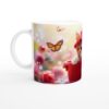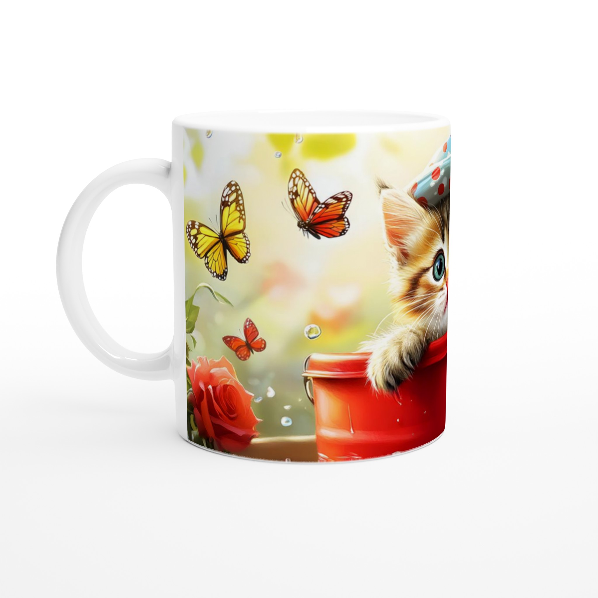 Denna förtrollande keramikmugg fångar hjärtat med sin bedårande design av en charmig kattunge i en prickig hatt, omgiven av livliga fjärilar och vackra rosor. Den är mer än bara en mugg; det är en daglig dos av glädje, perfekt för alla dagens stunder – morgonkaffet, en värmande kopp te eller en härlig varm choklad. Den blanka vita ytan gör att det underbara trycket framträder klart och färgstarkt, vilket gör muggen till en riktig favorit i vardagen för alla katt- och djurälskare.