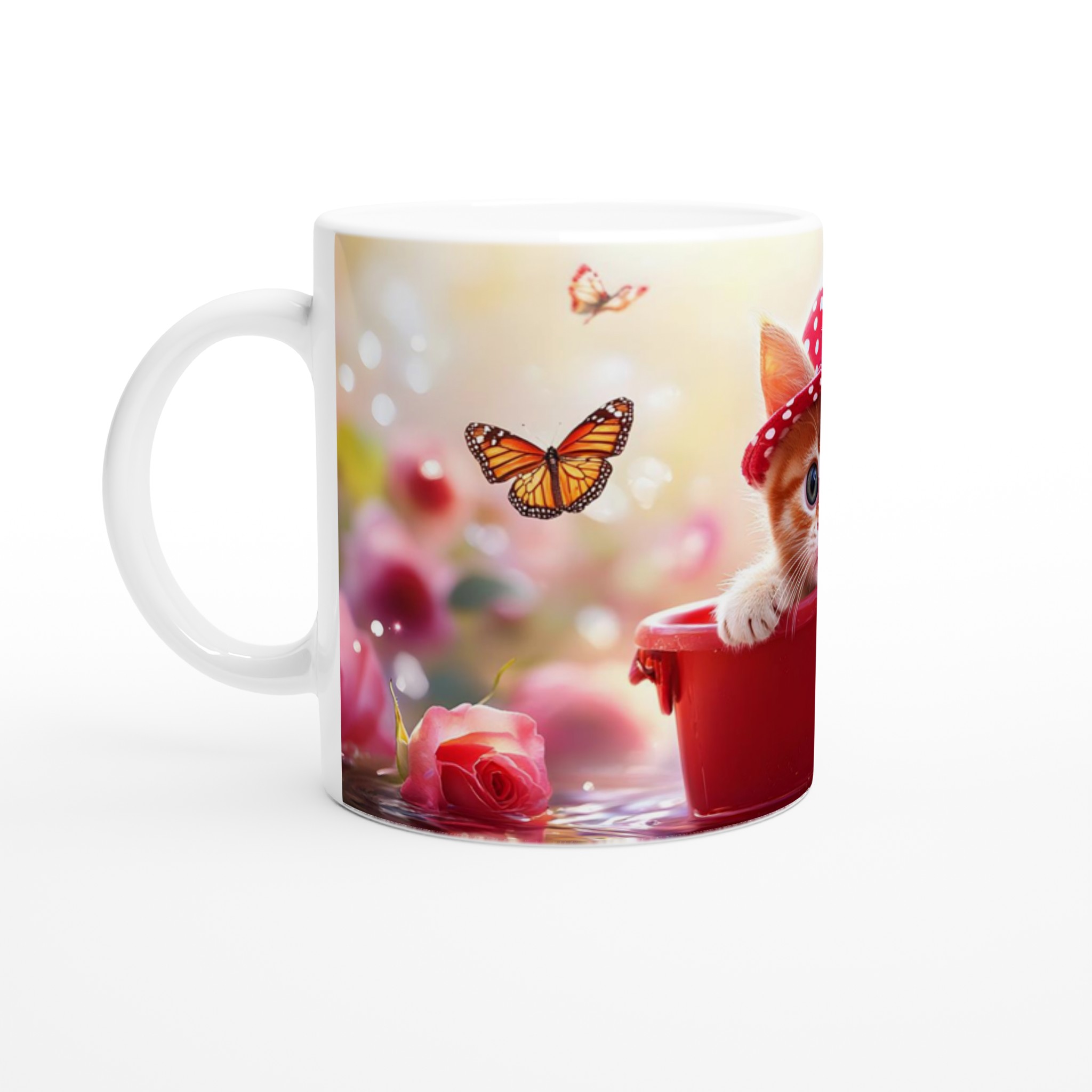 Föreställ dig att starta dagen med en mugg som sprudlar av charm! Denna bedårande keramiska mugg fångar den oemotståndliga glädjen hos en söt kattunge klädd i en prickig hatt, omgiven av lekfulla fjärilar och drömska rosor. Det är den perfekta dagliga påminnelsen om livets små, underbara ögonblick, perfekt för både kattälskare och de som uppskattar en touch av fantasi i vardagen.