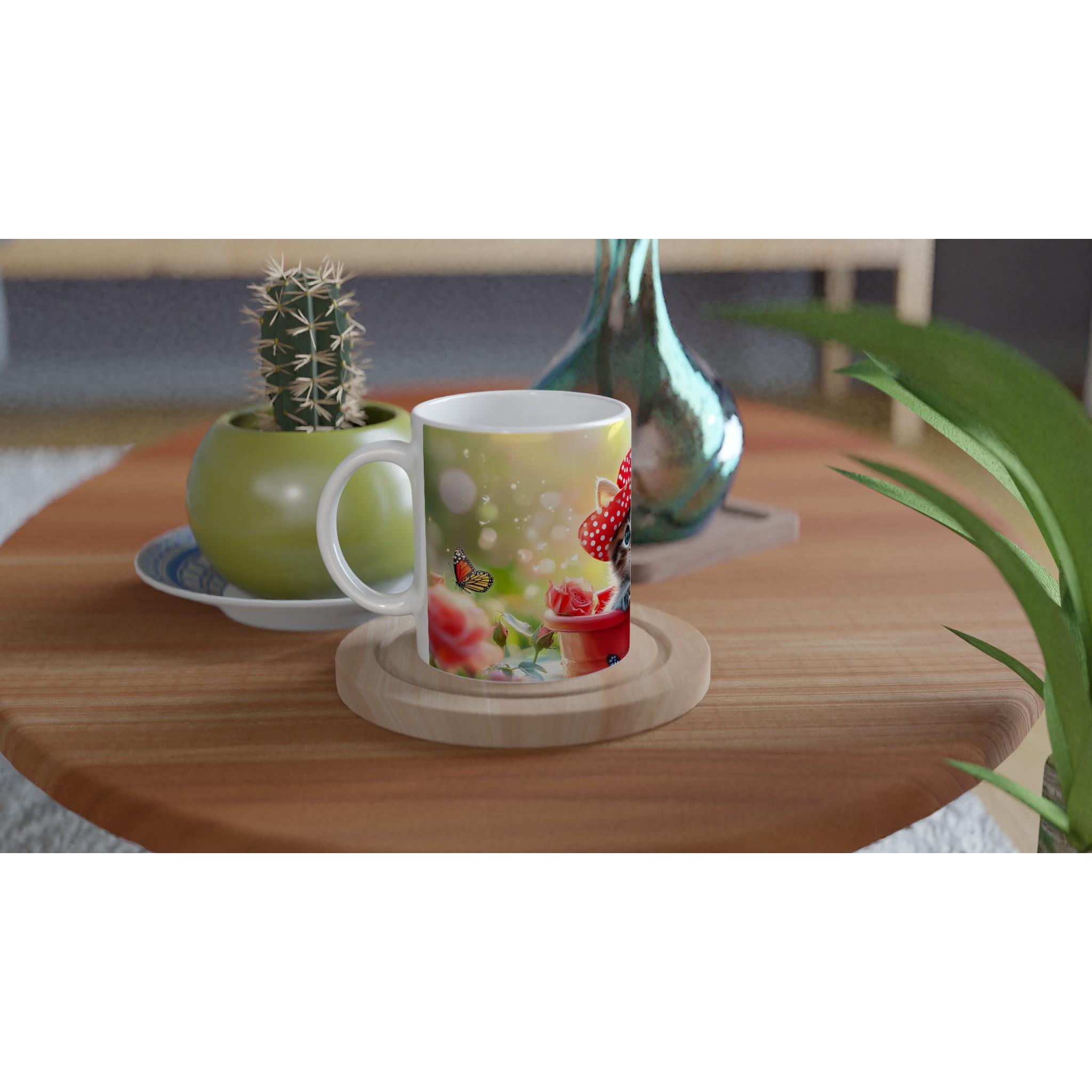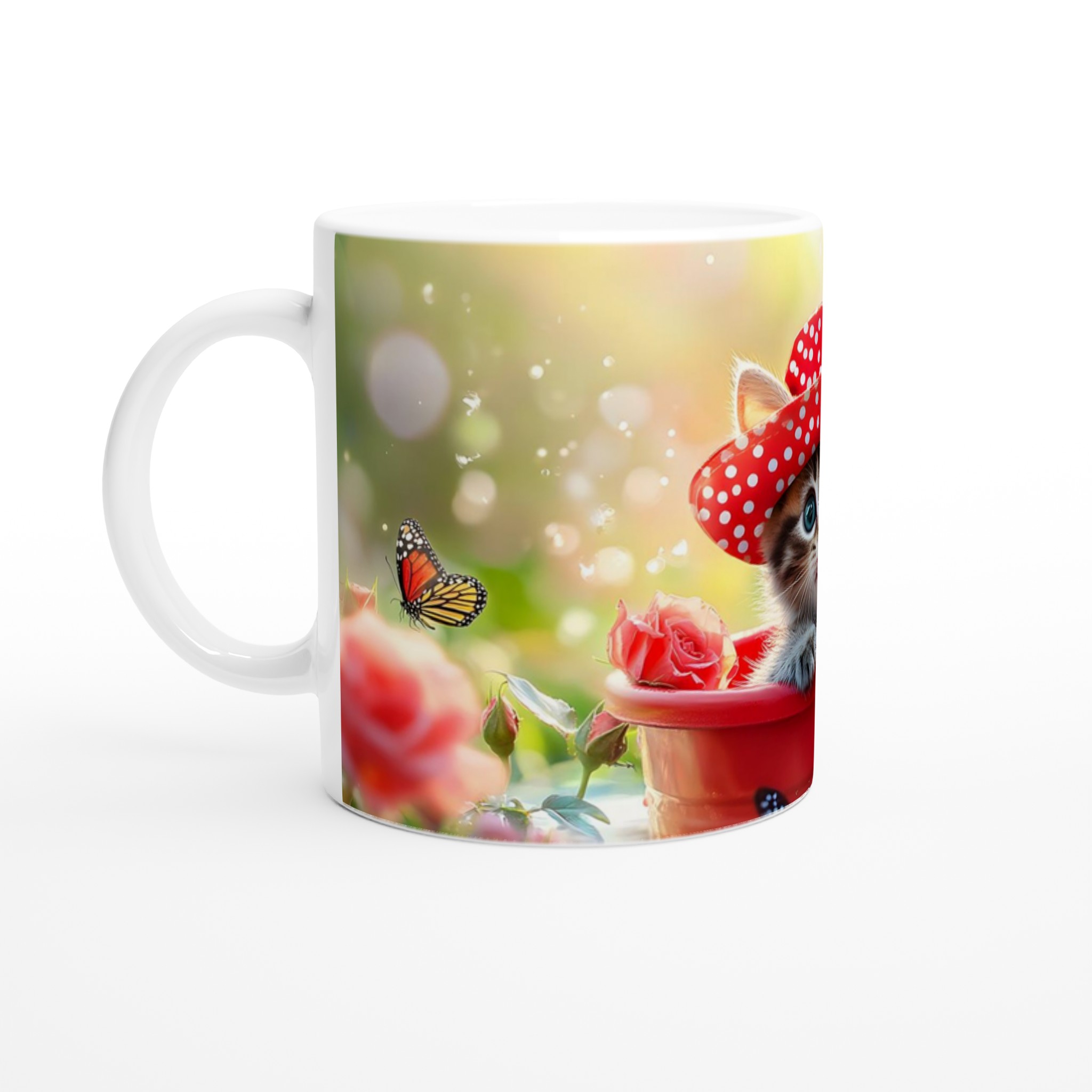 Förgyll varje morgon eller fikastund med vår förtrollande keramikmugg, prydd med en oemotståndligt söt kattunge i en lekfull röd svamphatt. Denna mugg fångar en magisk sommardag med en bedårande kattunge omgiven av blommande rosor och fjärilar som dansar i solskenet. Det är den perfekta presenten för kattälskare och alla som uppskattar en touch av charm och glädje i vardagen.
