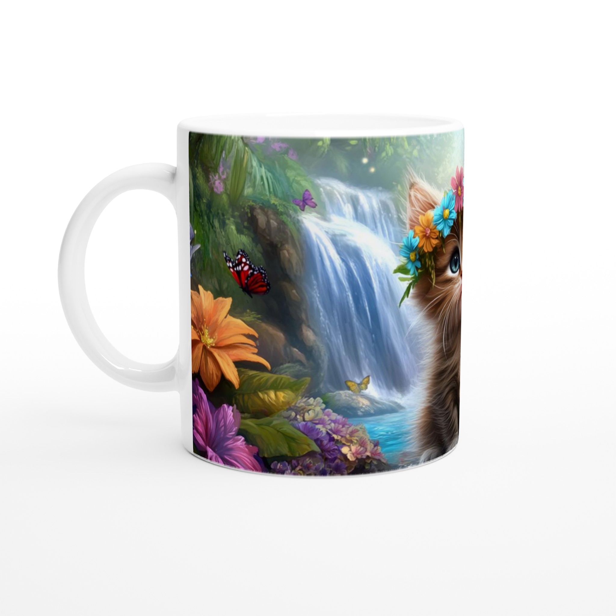 Låt dig förtrollas av denna underbara keramikmugg, prydd med en oemotståndlig kattunge som bär en blomsterkrans, omgiven av en skimrande vattenfallsoas. Denna charmiga design förvandlar varje sipp till en stund av glädje och lugn, perfekt för dig som älskar djur och en touch av magi i vardagen. Den blanka vita ytan gör att kattungens uttryck och de livfulla färgerna i illustrationen framträder med enastående klarhet, vilket gör muggen till en riktig favorit i vardagen.