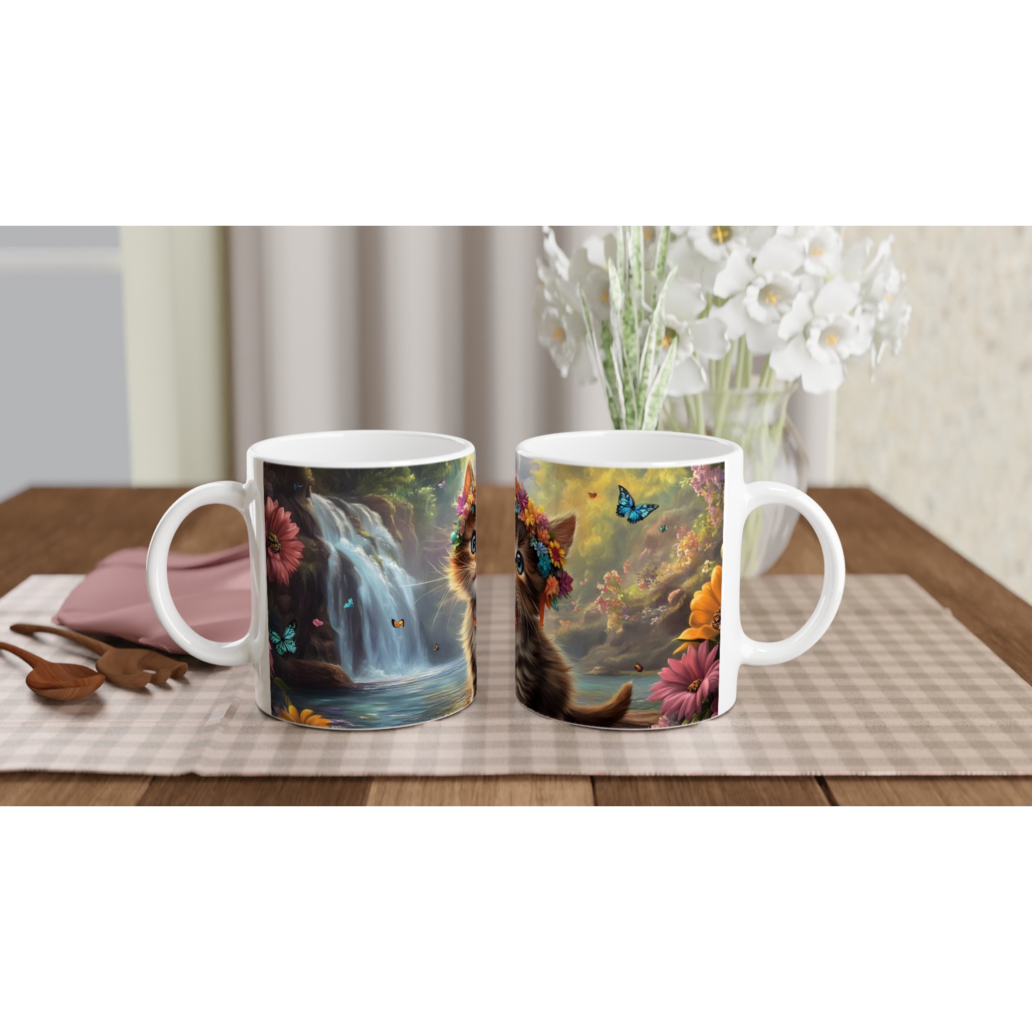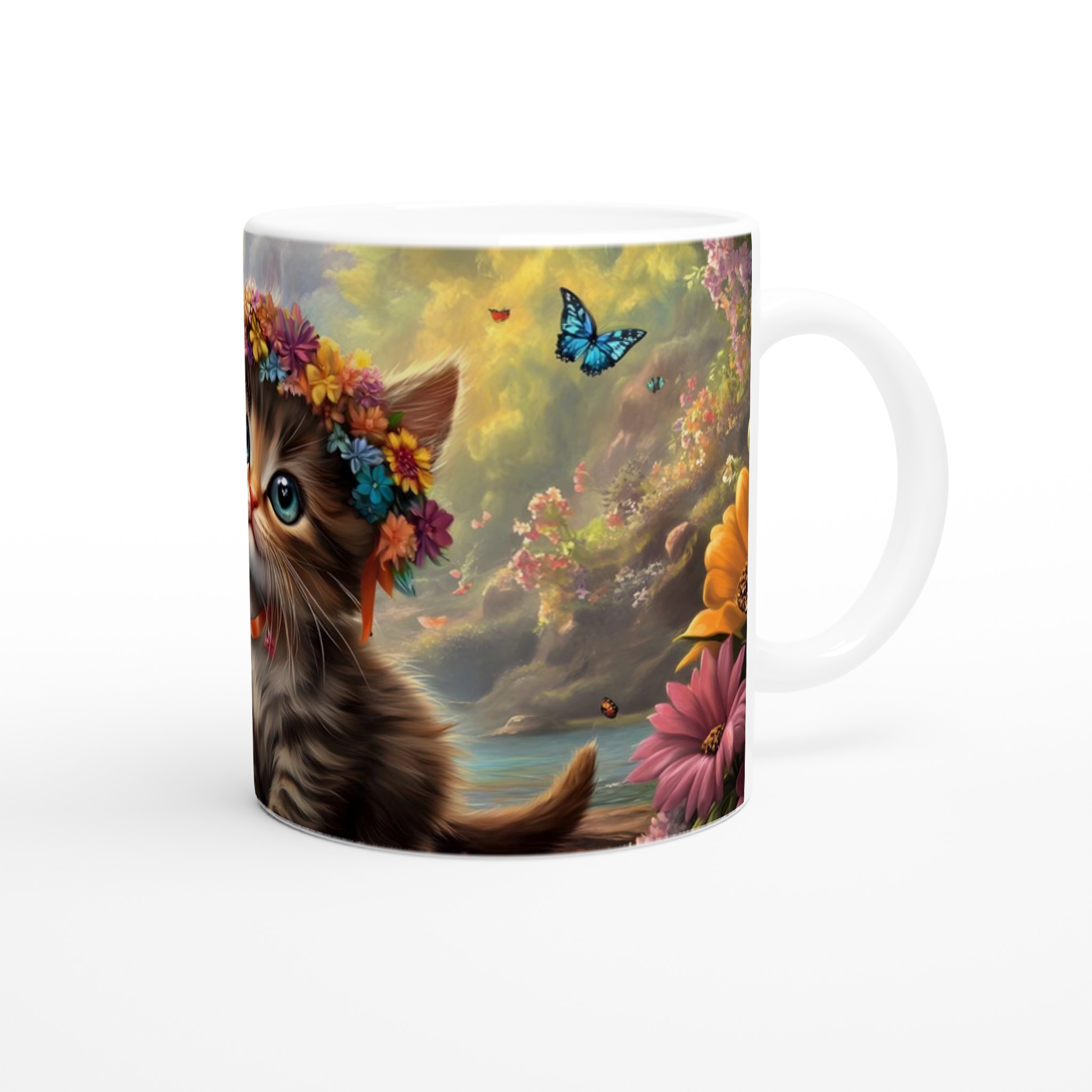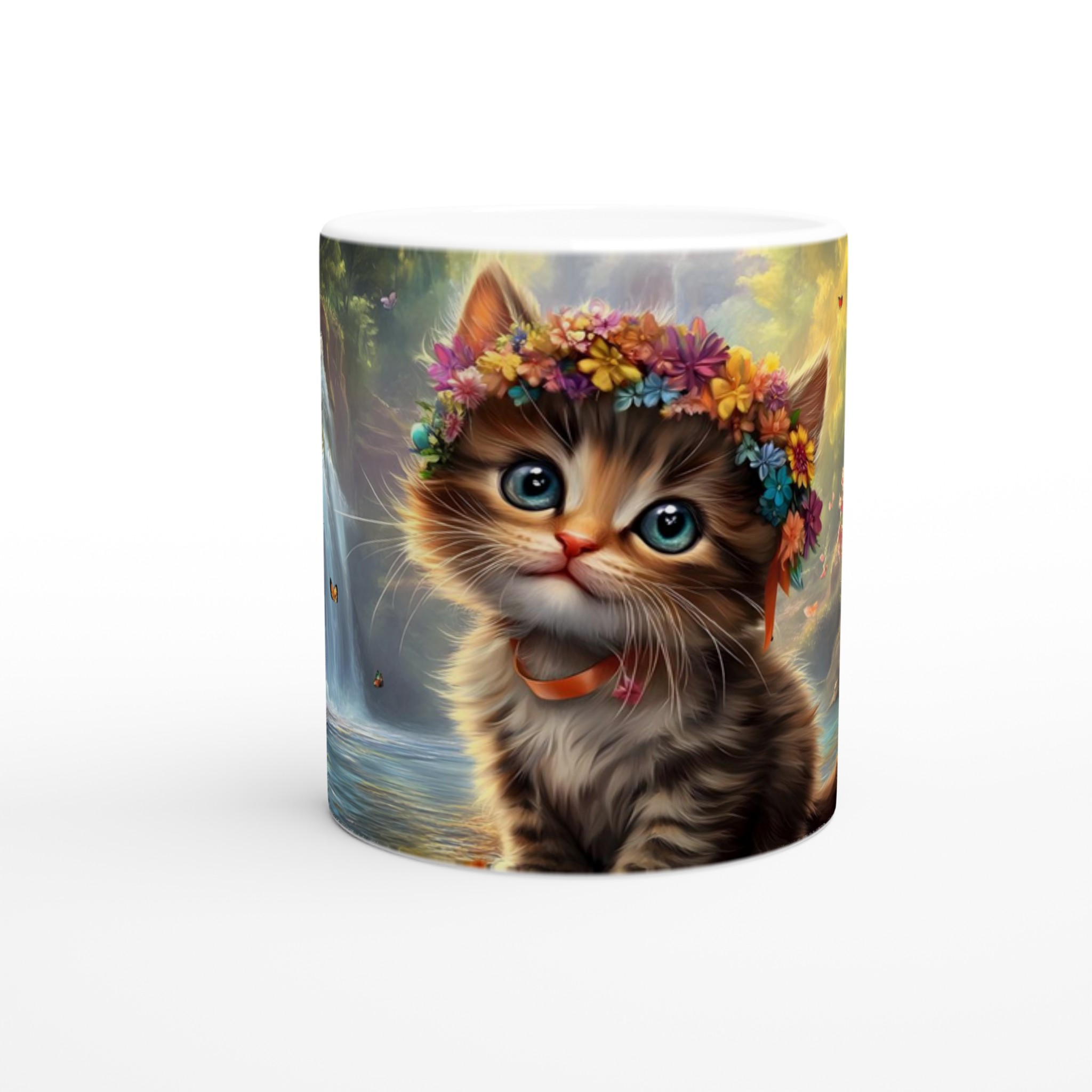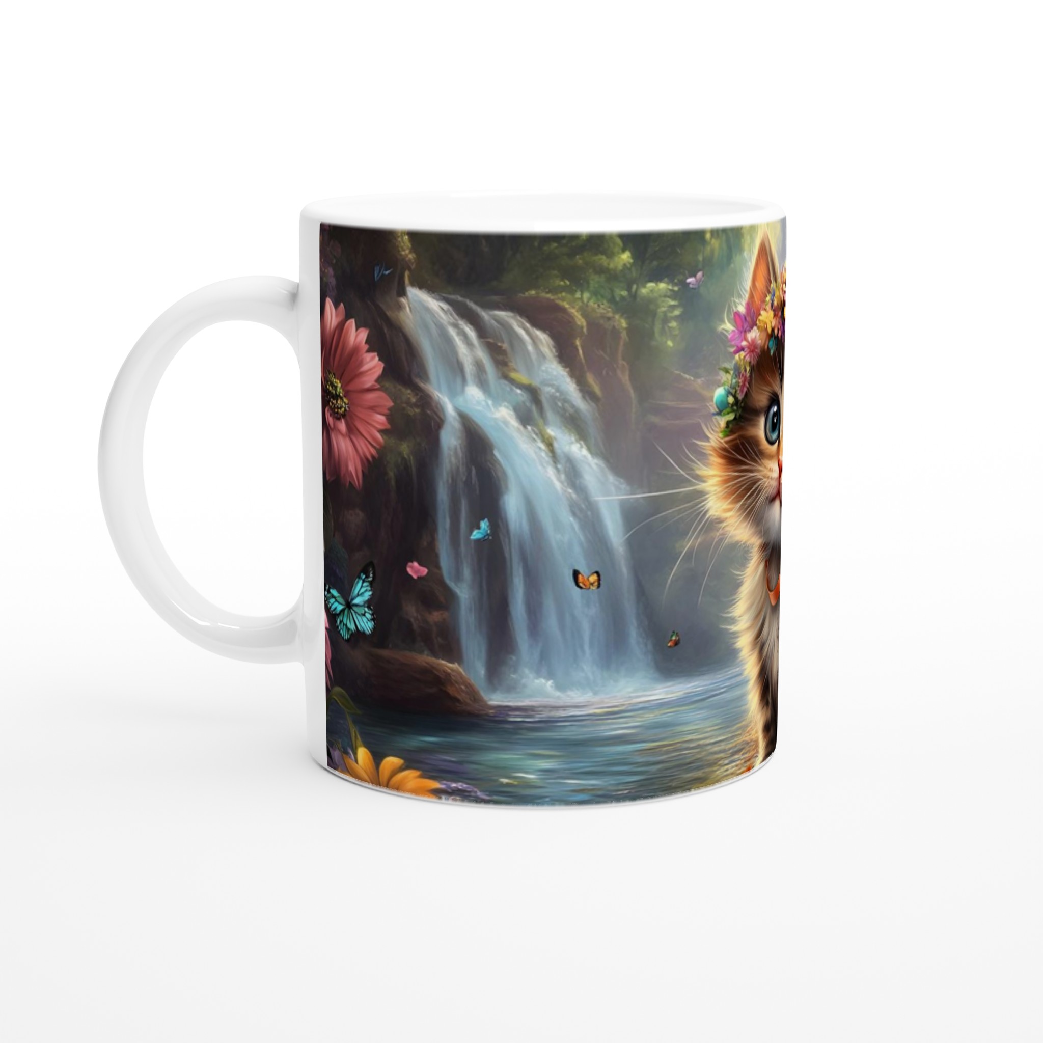 Föreställ dig att du sippar på din favoritdryck, omgiven av en förtrollad skog där en bedårande kattunge med glittrande ögon och en livfull blomsterkrans välkomnar dig till en värld av lugn och glädje. Denna mugg fångar den magiska känslan perfekt med sin fantastiska design som för tankarna till soliga dagar vid vattenfall och lekfulla fjärilar. Varje klunk blir en liten flykt till naturens under och kattungens oskyldiga charm.