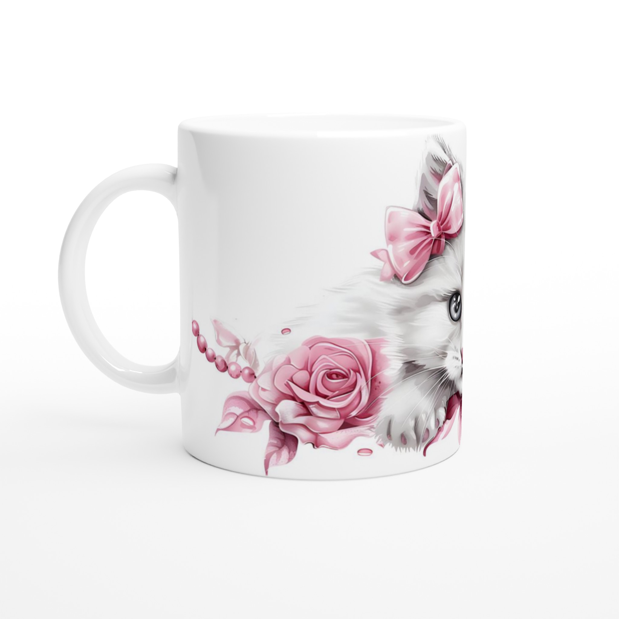 Fånga charmen med denna bedårande keramiska mugg, prydd med en ljuvlig kattunge omgiven av romantiska rosa rosor och pärlor. Dess drömska motiv och mjuka färgpalett skapar en känsla av lugn och glädje, perfekt för att förgylla din fikastund eller som en hjärtevärmande present till någon speciell. Varje detalj i trycket är levande och färgstark, vilket gör denna mugg till en riktig ögonfröjd i vardagen.