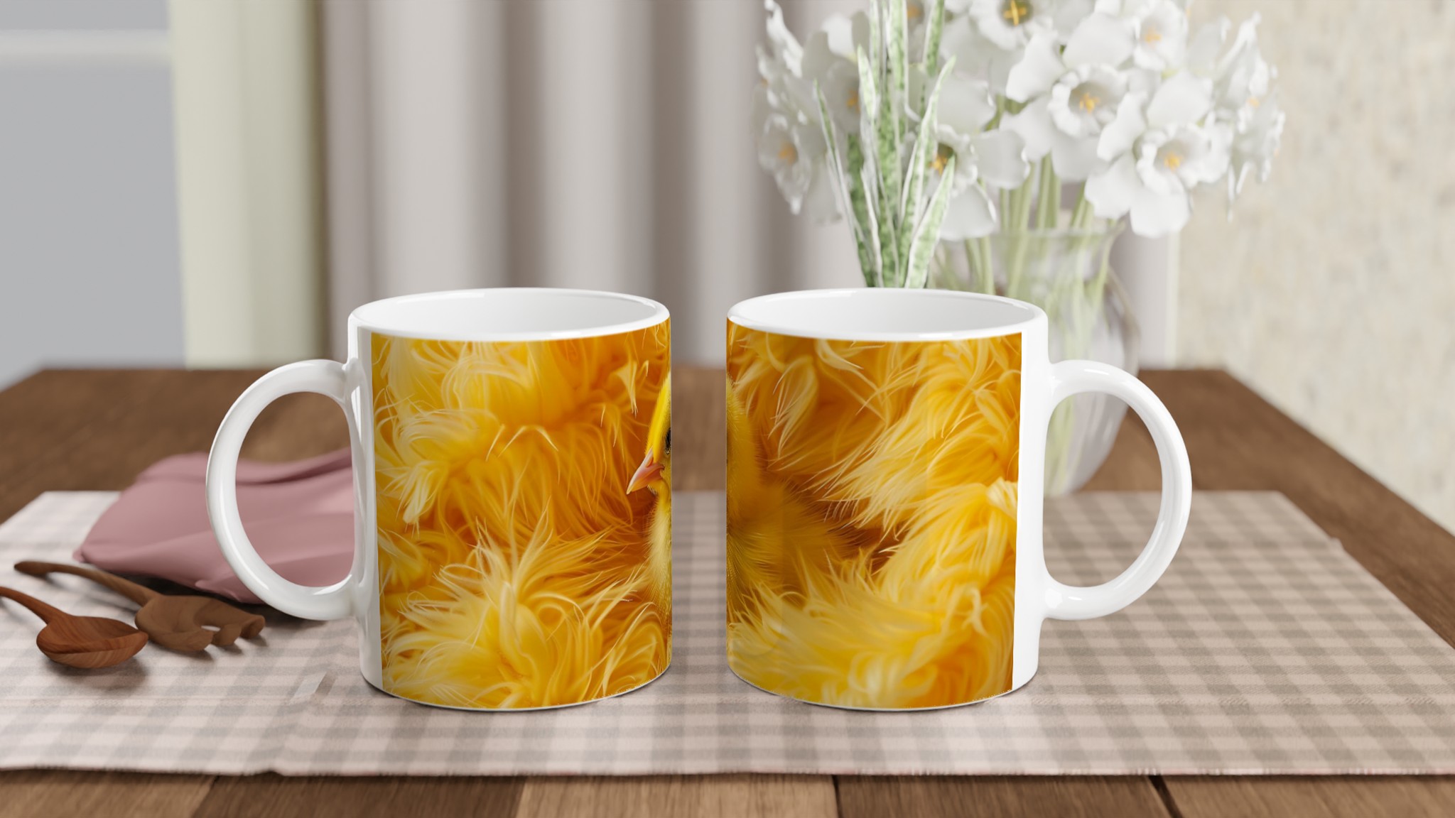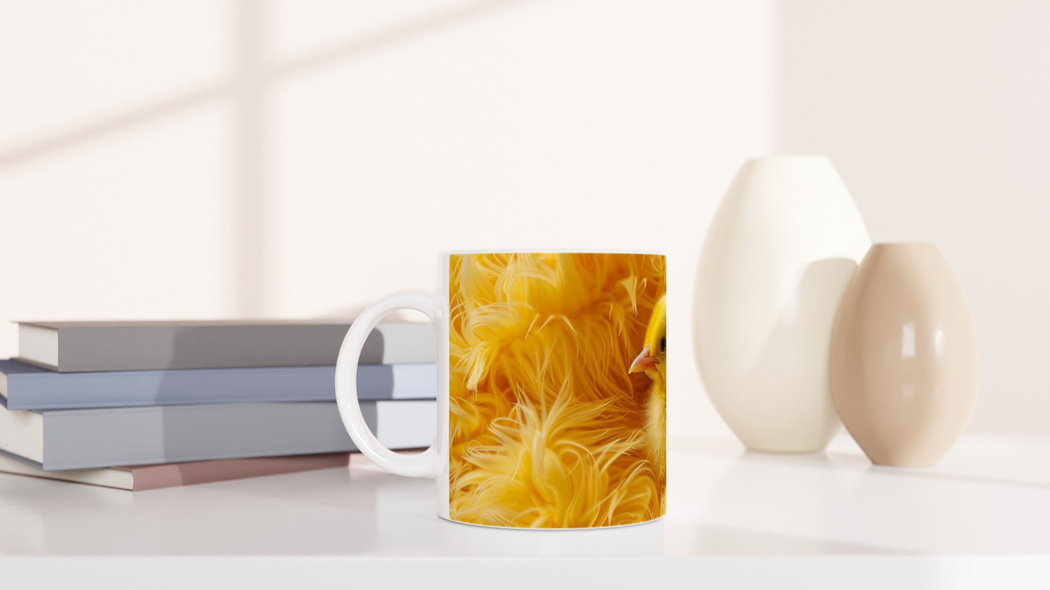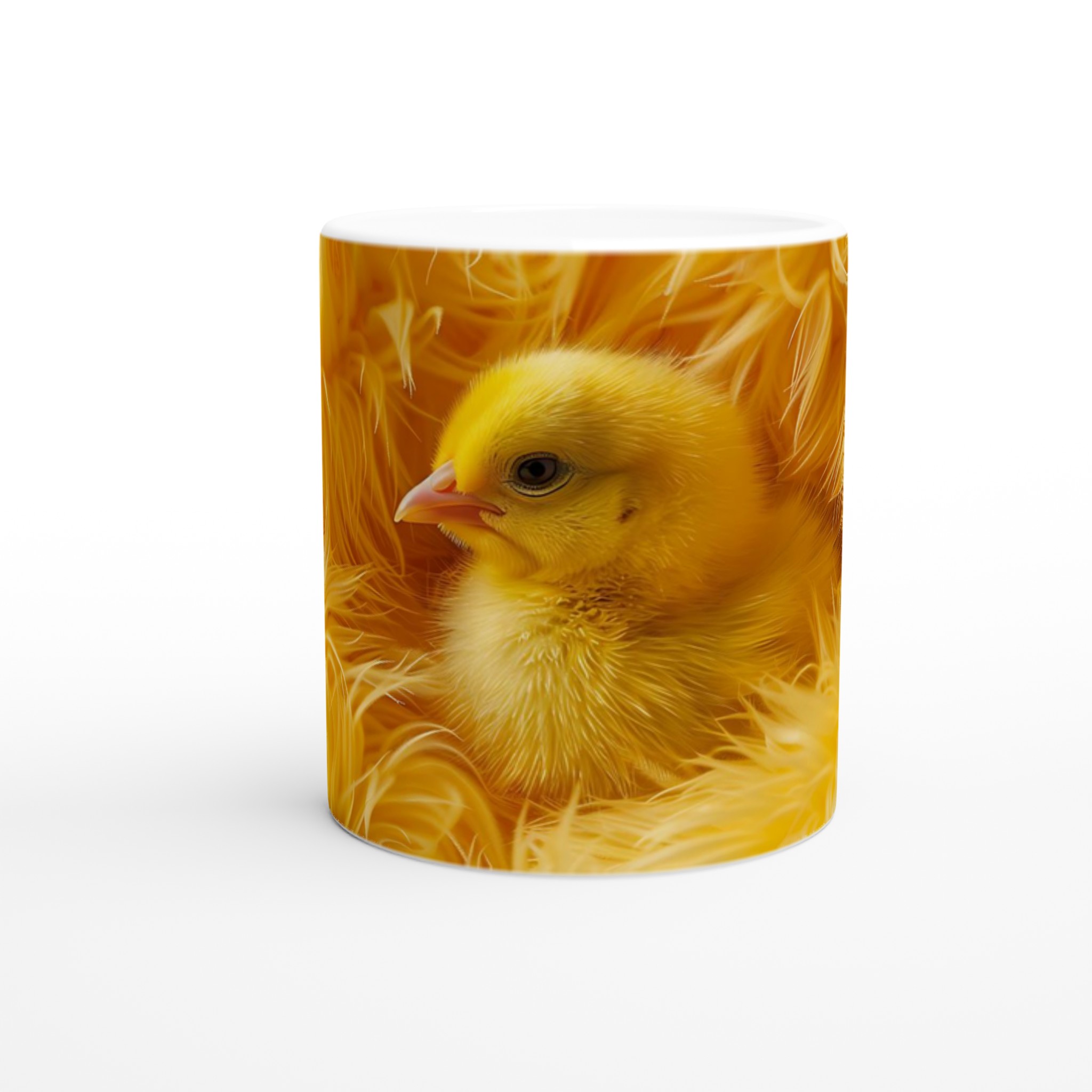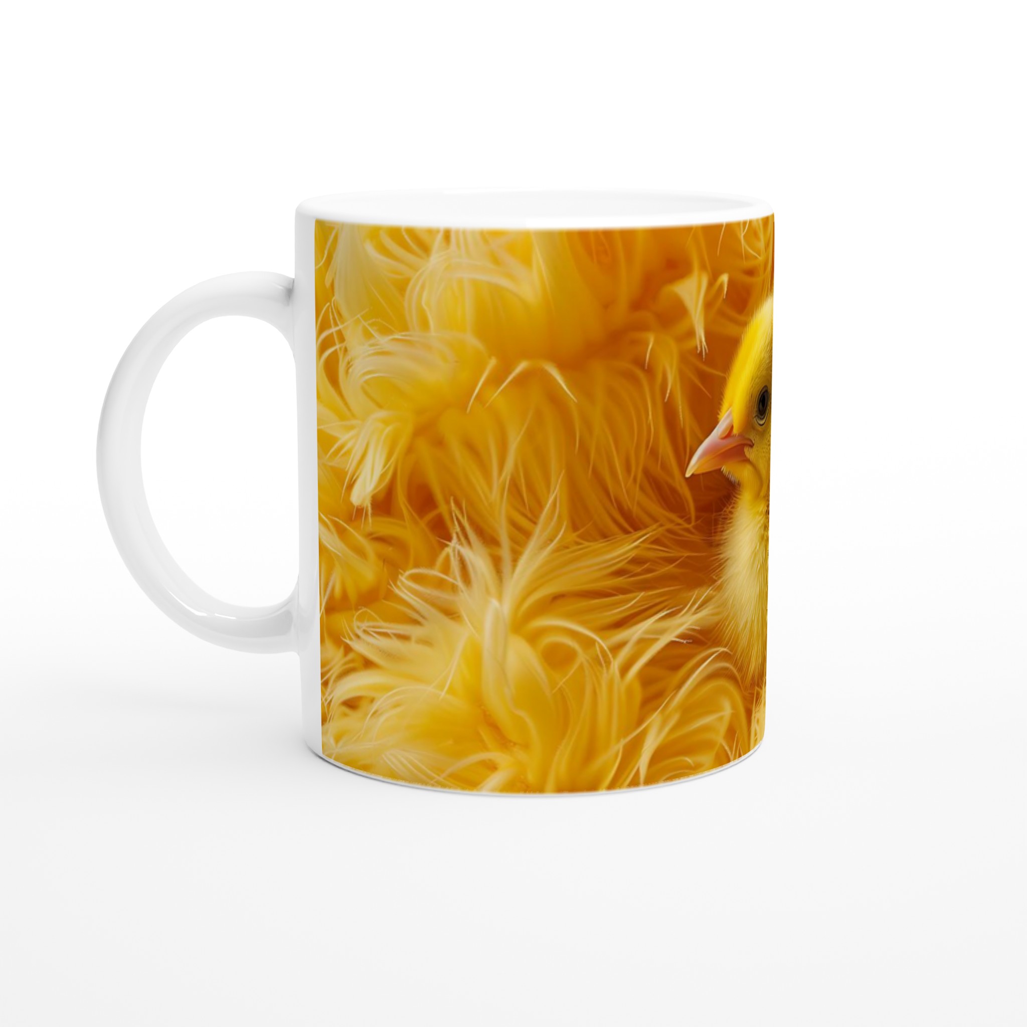 Denna charmiga keramiska mugg, prydd med en bedårande kyckling bland mjuka gula fjädrar, blir snabbt en favorit. Perfekt för morgonkaffet, kvällens varma choklad, eller när du bara vill njuta av en kopp te i gott sällskap. Den blanka ytan lyfter fram det söta motivet med klara och levande färger, som håller sig fina även efter många turer i mikron och diskmaskinen.