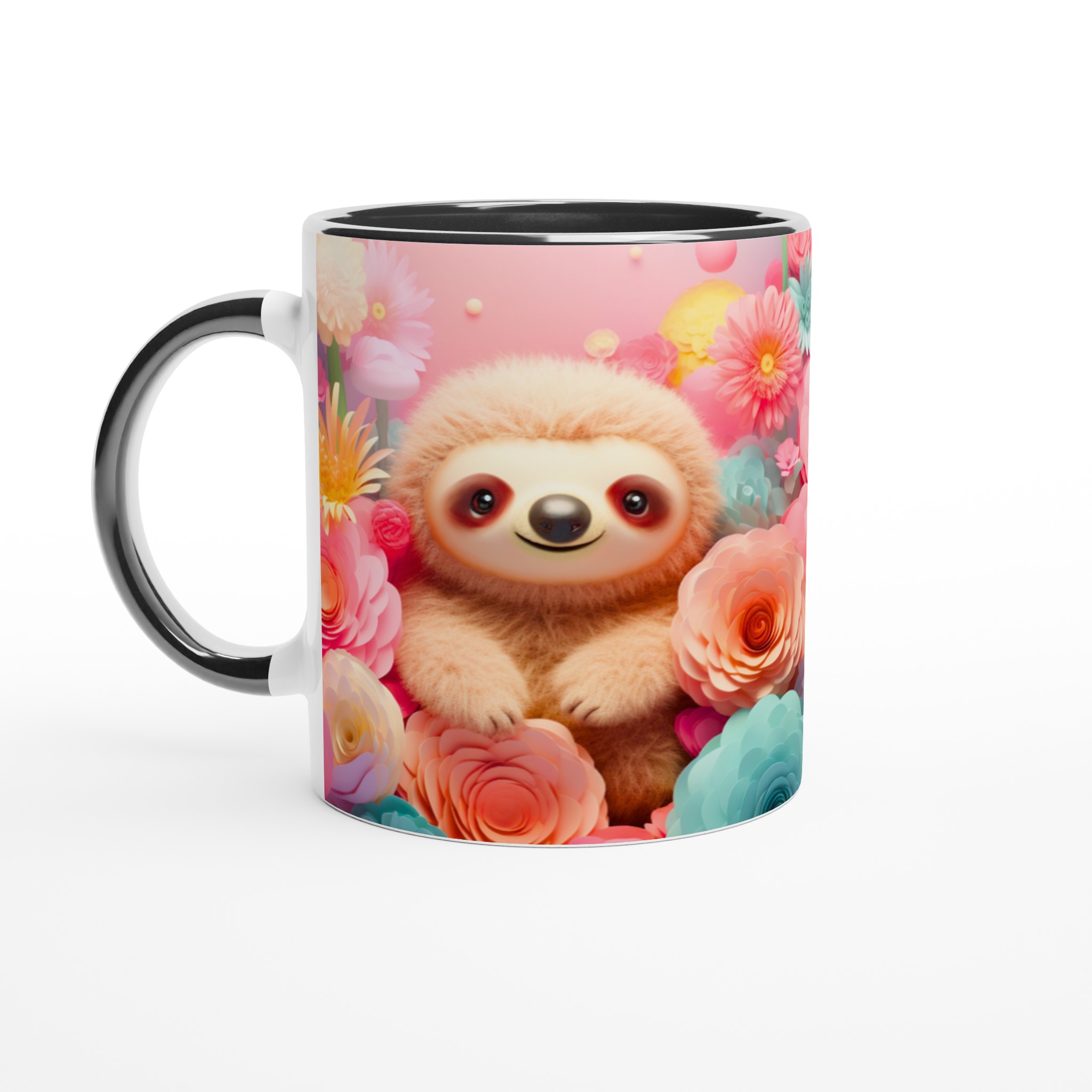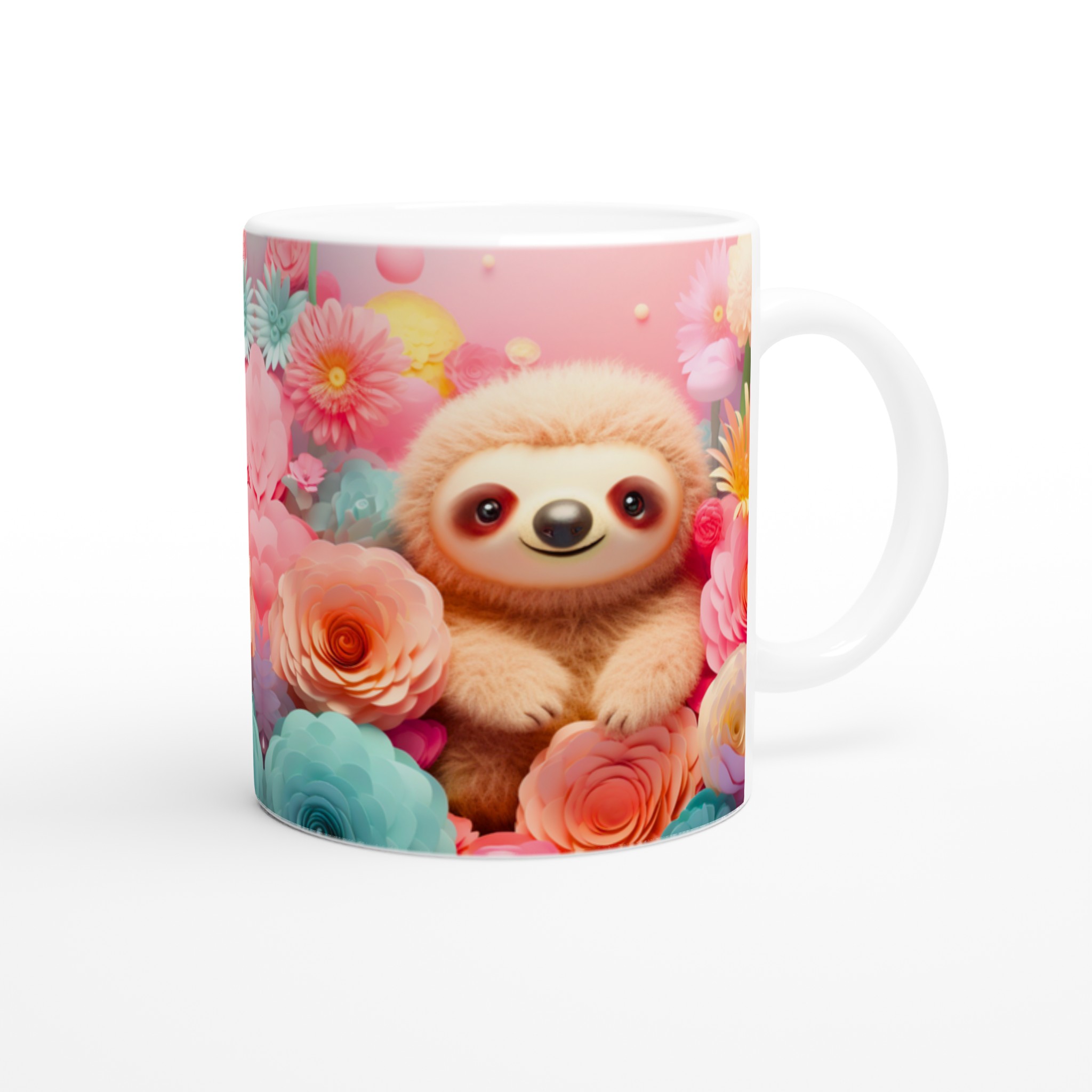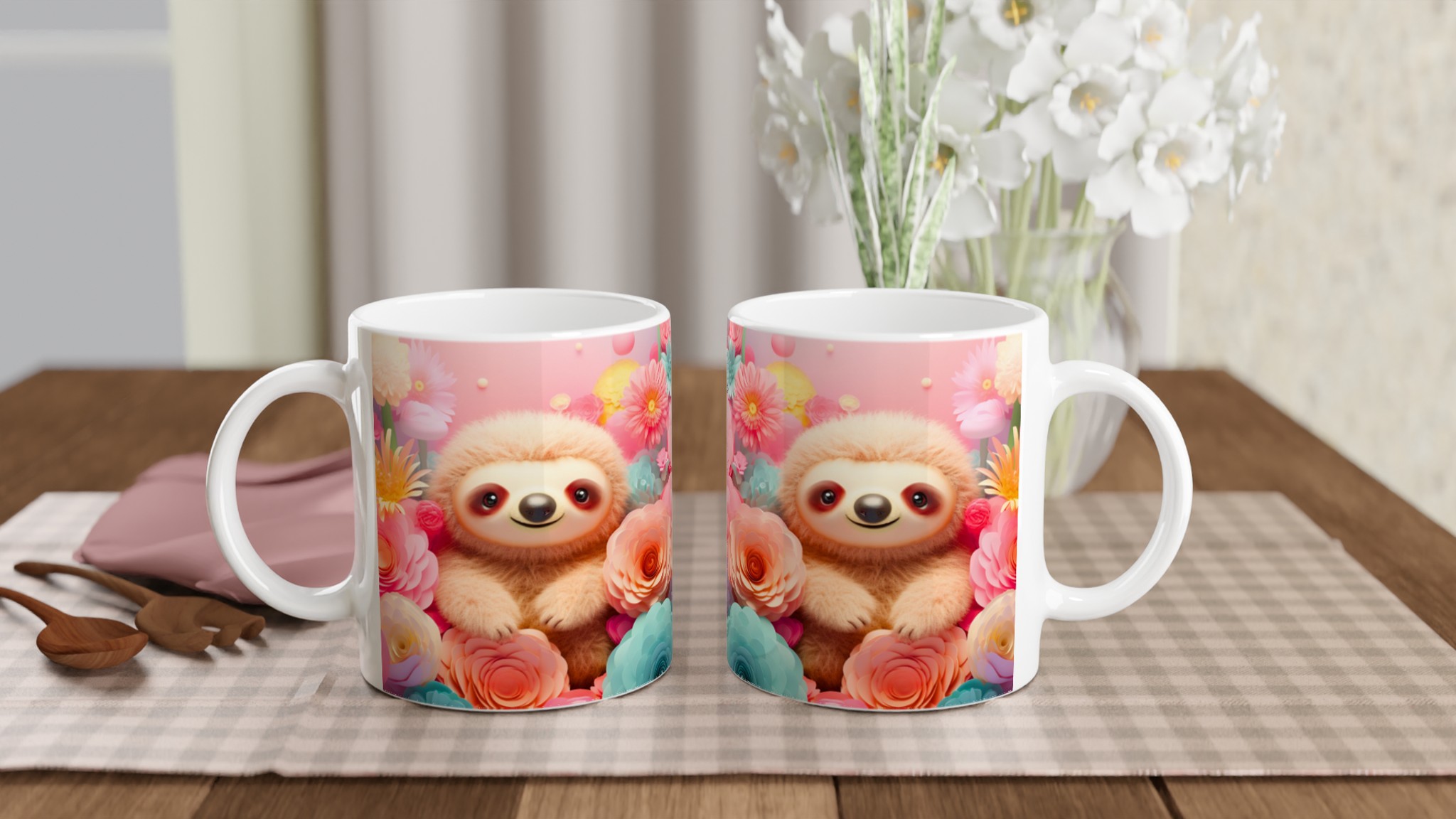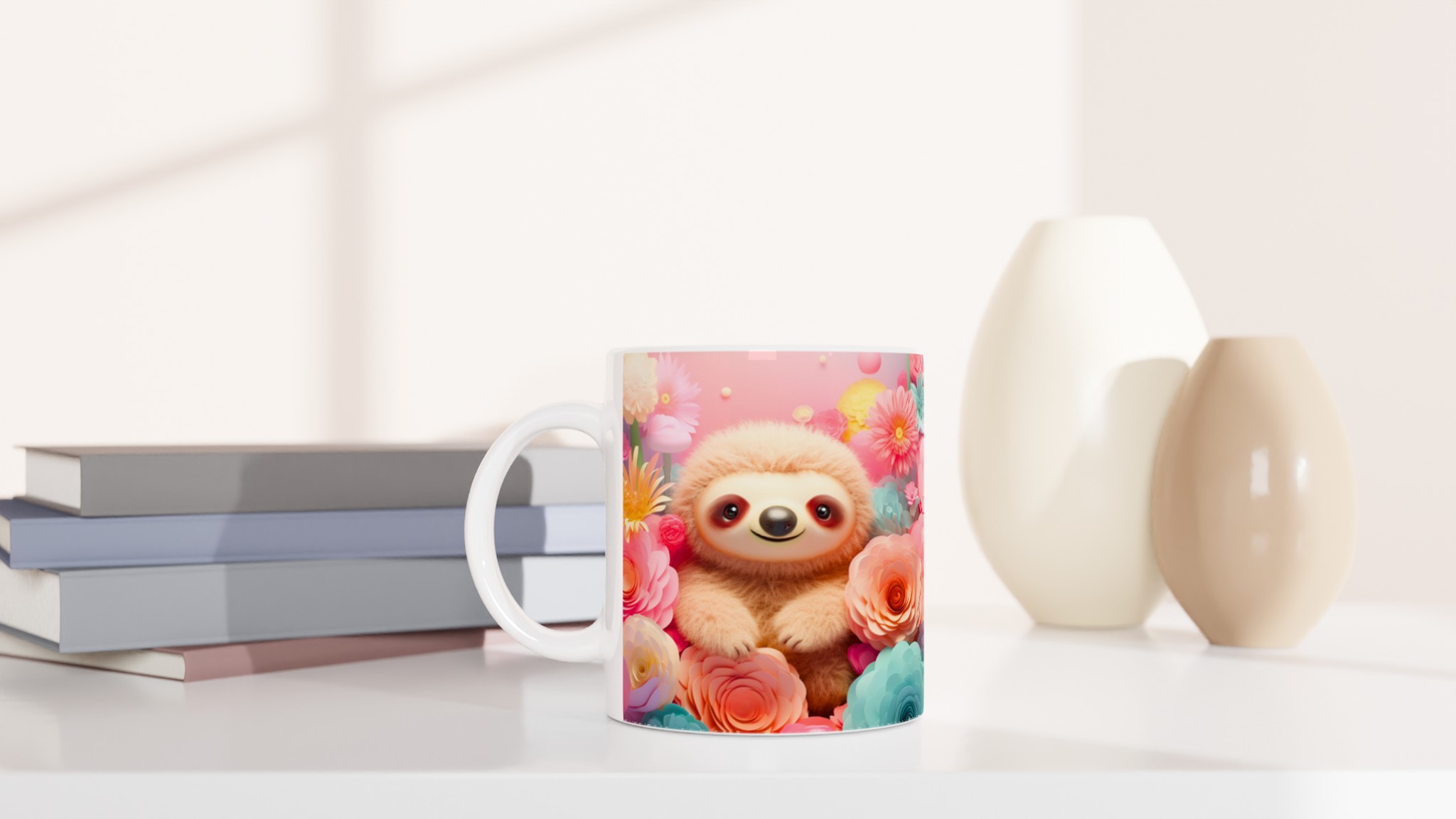 Vakna upp med ett leende med denna bedårande keramiska mugg, prydd med en söt och lugn liten lättja omgiven av pastellfärgade blommor. Denna mugg är designad för att sprida glädje och blir snabbt en vardagsfavorit. Perfekt för morgonkaffet, kvällens varma choklad eller när du bara vill njuta av en kopp te. Den blanka vita ytan gör att trycken framhävs med klara och levande färger, som håller sig fina även efter många turer i mikron och diskmaskinen.