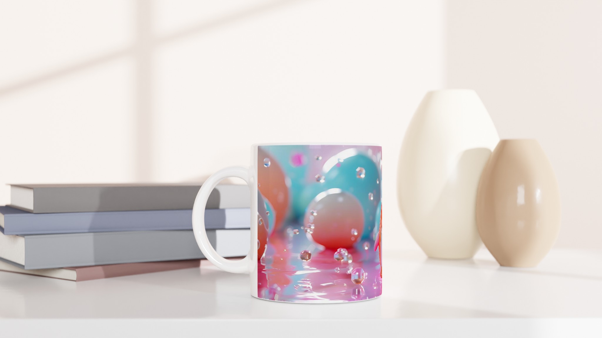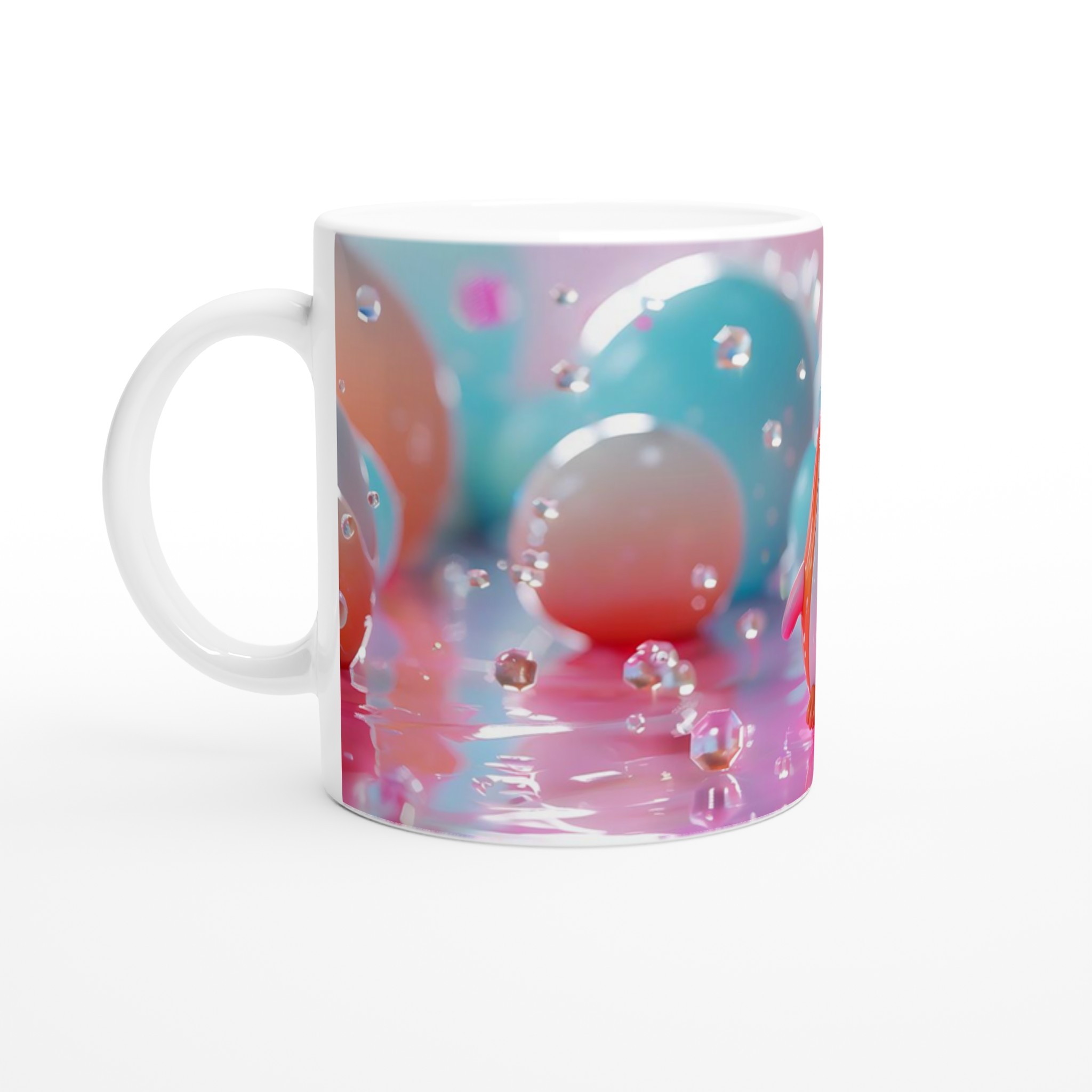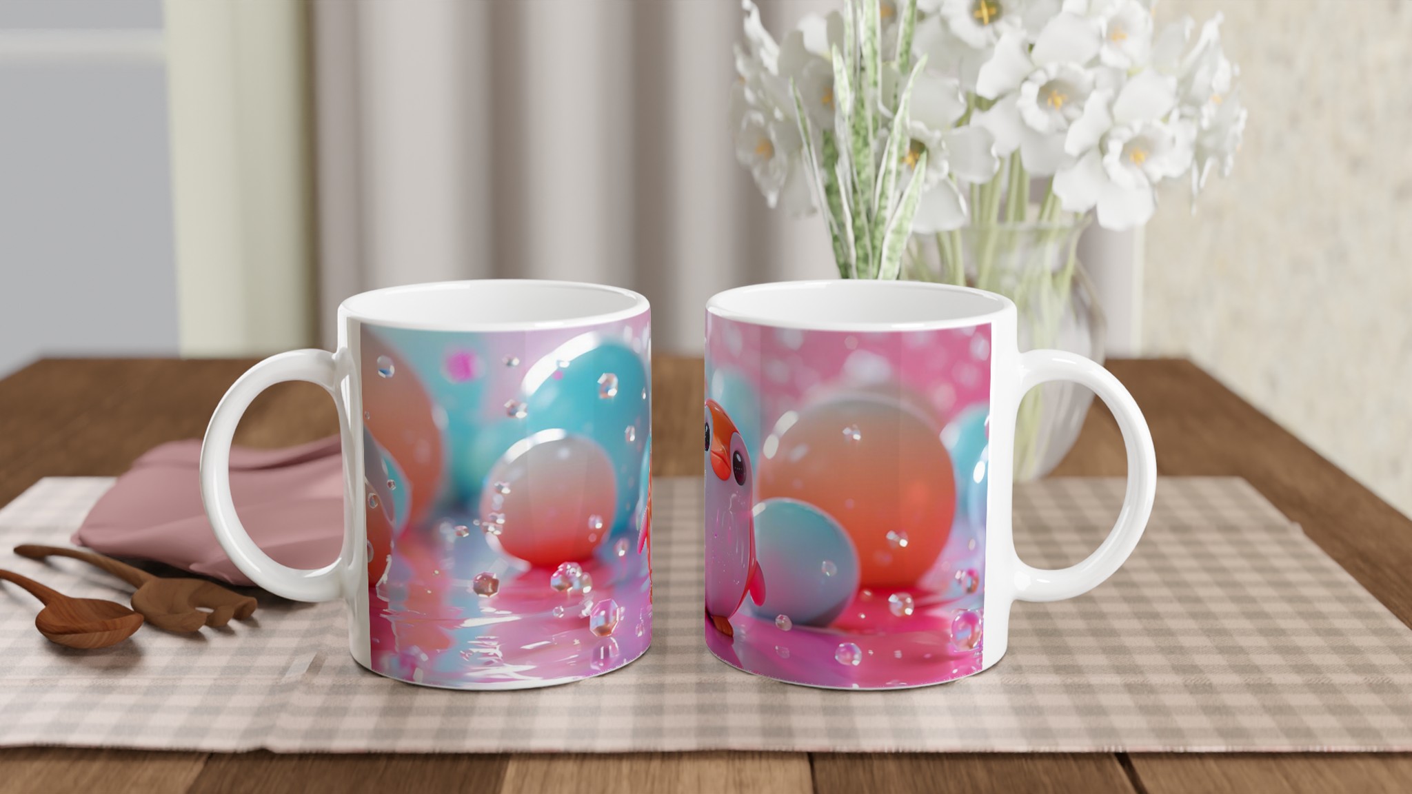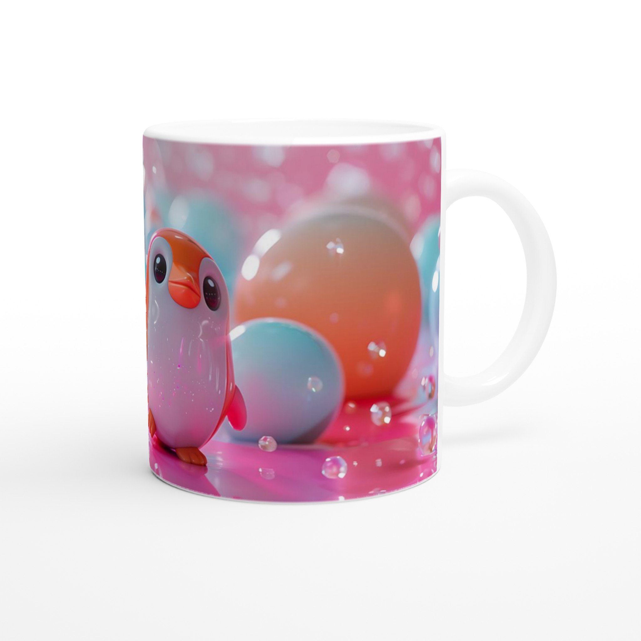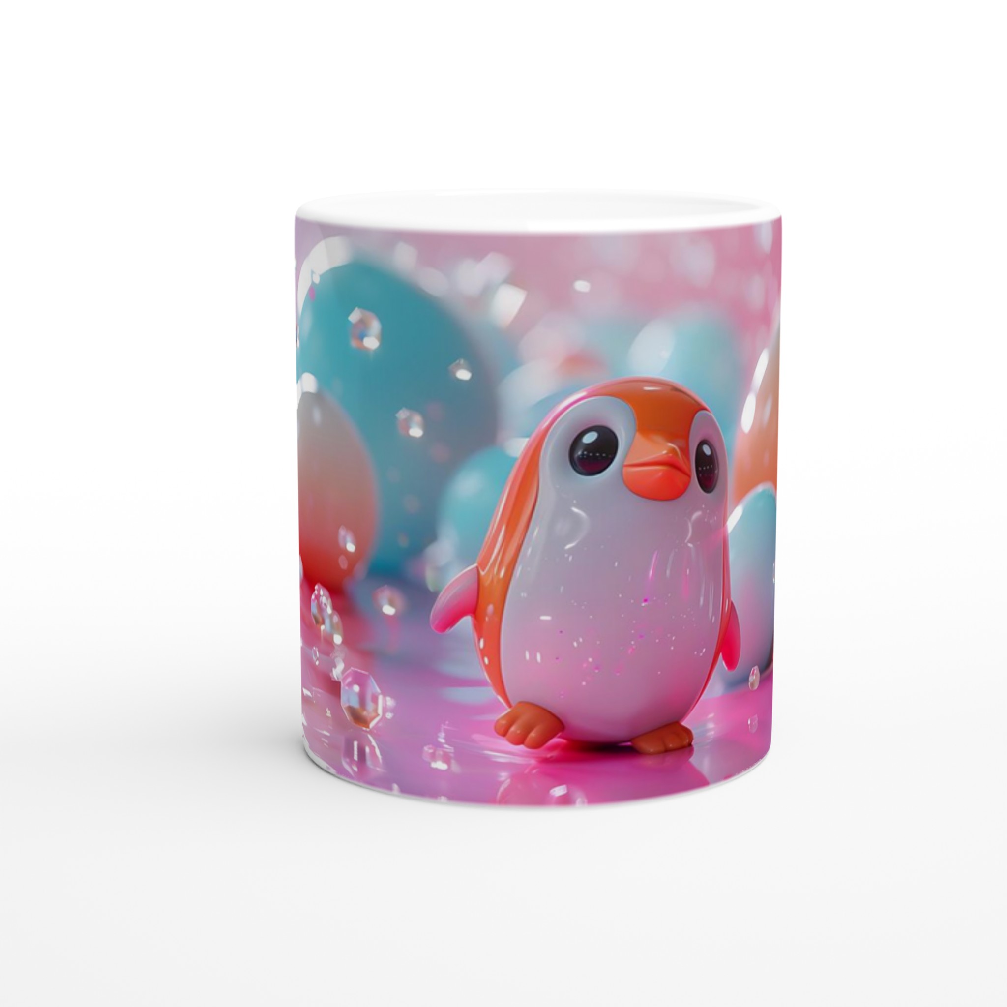 Förvandla varje fikastund till en lekfull upplevelse med vår söta keramiska mugg, prydd med en bedårande leksakspingvin i ett drömskt pastellunderland. Denna mugg är designad för att sprida glädje och blir snabbt en vardagsfavorit, perfekt för ditt morgonkaffe, kvällens varma choklad eller en lugn stund med te. Den blanka vita ytan låter det charmiga pingvinmotivet framhävas med klara och levande färger, som behåller sin lyster även efter otaliga turer i mikron och diskmaskinen.