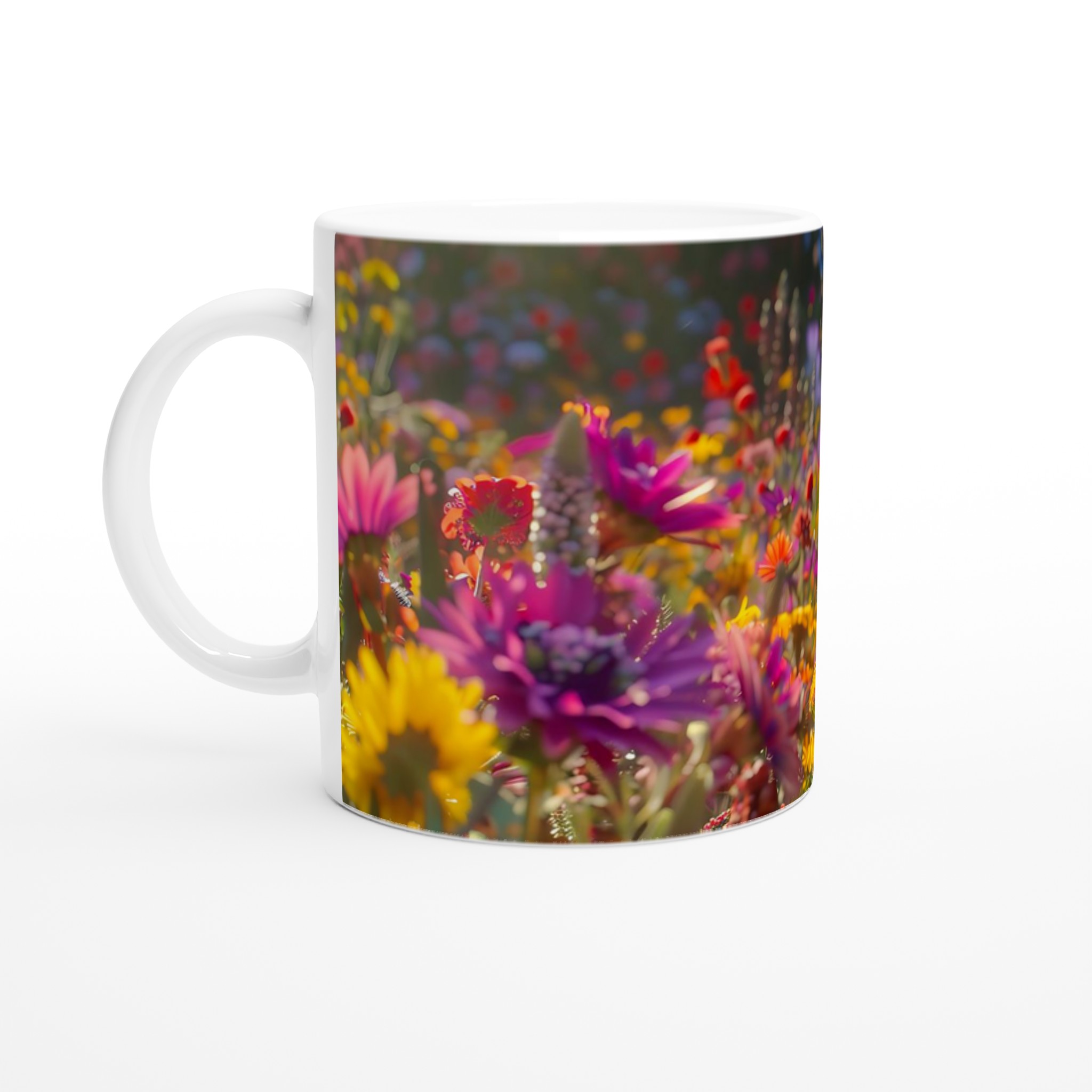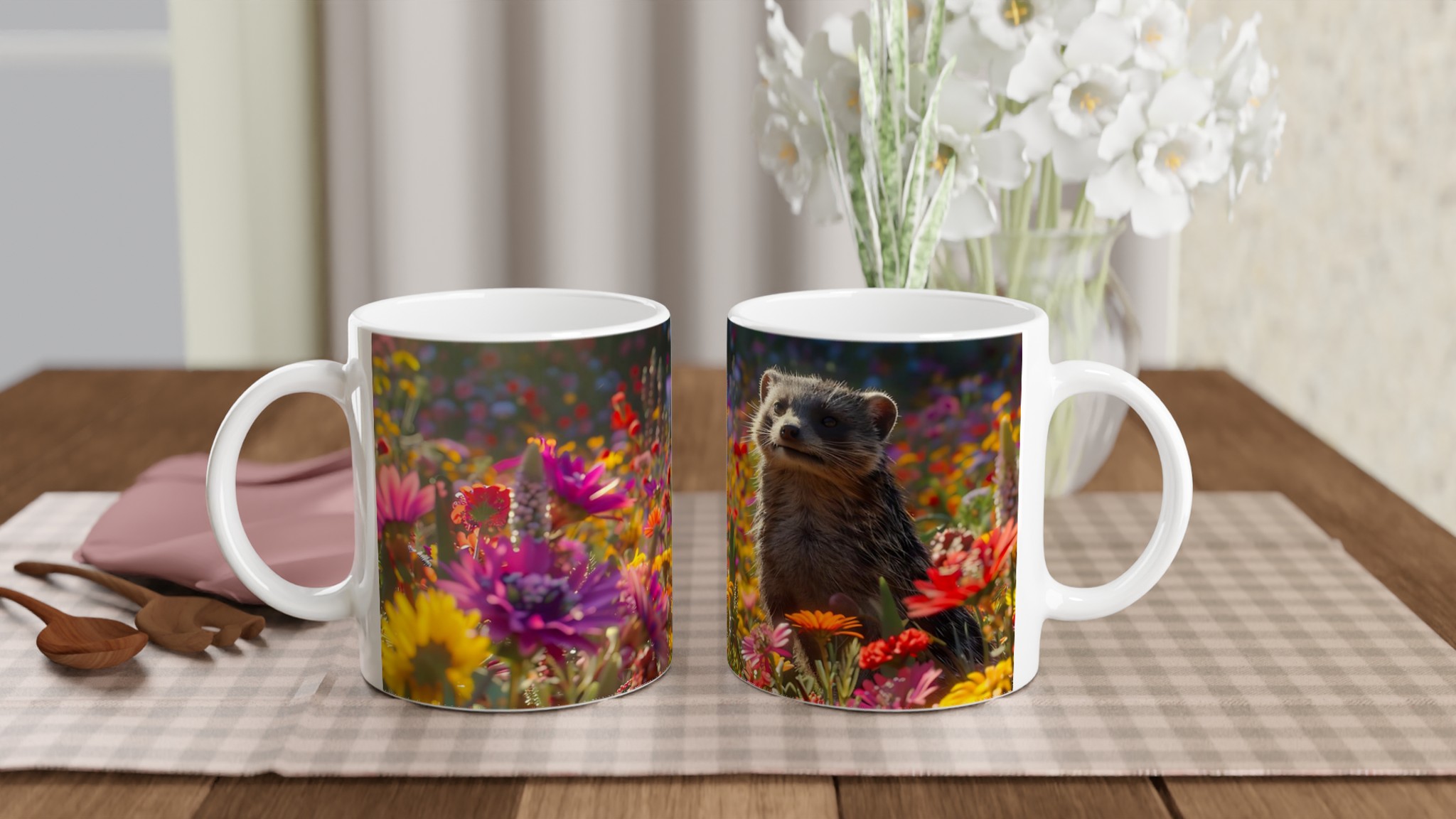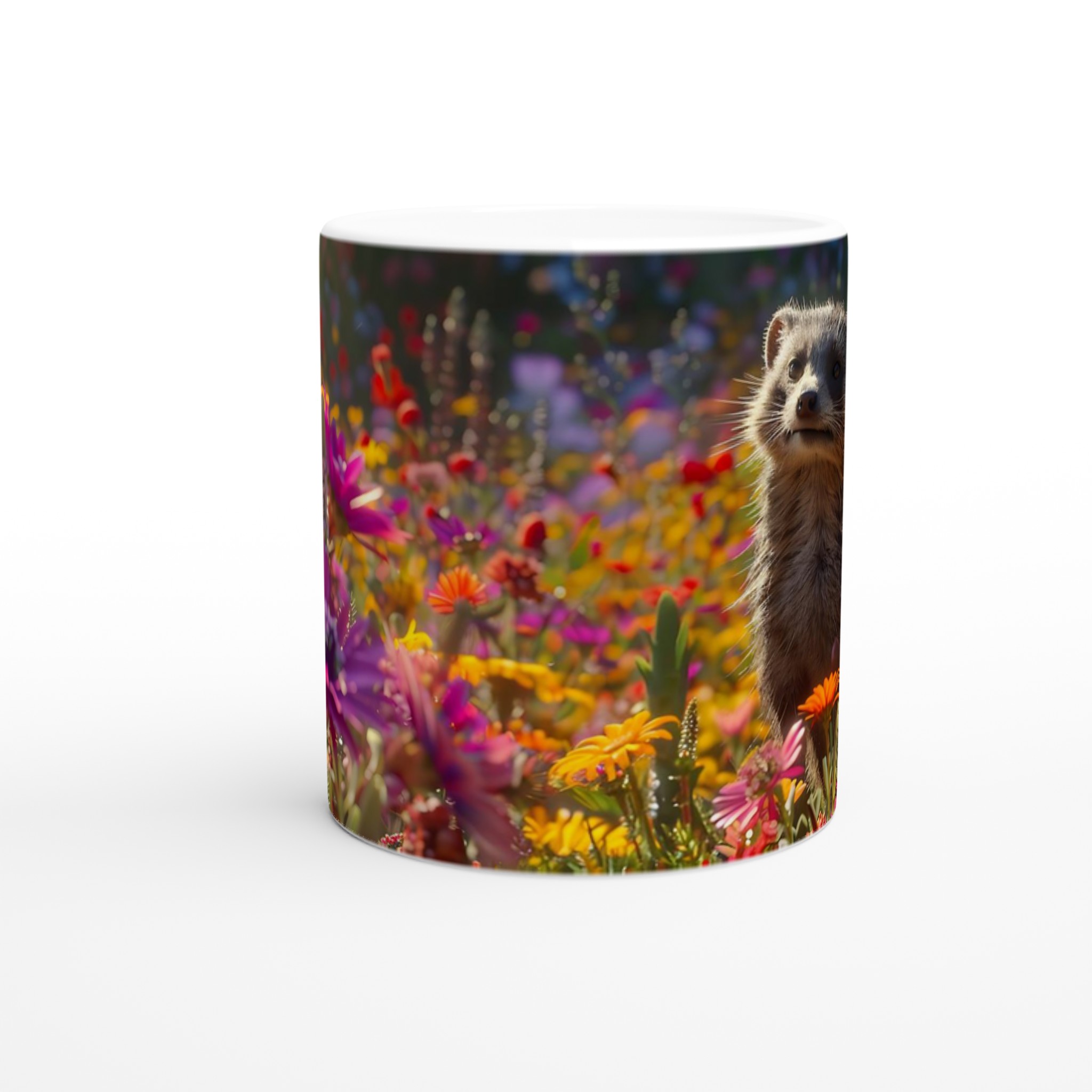 Låt dig förtrollas varje gång du tar en kopp med denna charmiga keramiska mugg, prydd med en förtjusande liten tvättbjörn som kikar fram ur ett hav av strålande blommor. Den livfulla scenen, fylld med varma färger och en lekfull känsla, gör varje fikastund till en liten flykt från vardagen. Det är den perfekta följeslagaren för ditt morgonkaffe, kvällens mysiga choklad eller när du bara vill njuta av en kopp te i lugn och ro.