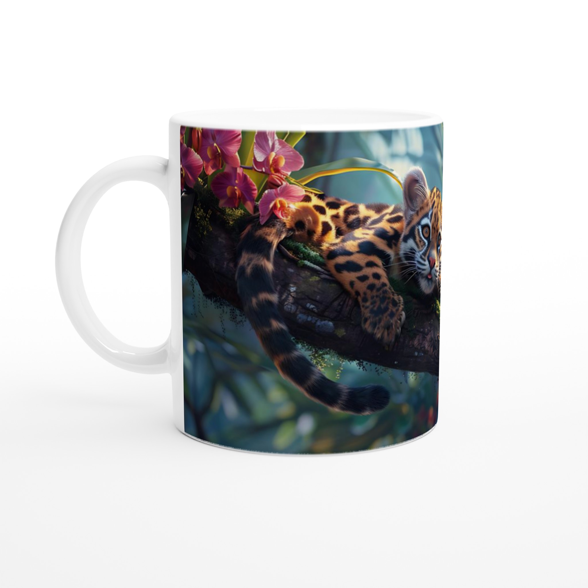 Denna förtrollande mugg fångar den lekfulla charmen hos en liten ozelot som vilar bland frodiga, rosa orkidéer i en magisk djungel. Den blanka vita ytan ger ett skarpt och levande tryck som verkligen sticker ut, oavsett om det är en personlig design, ett roligt citat eller en present till någon du tycker om. Varje klunk blir en flykt till naturens lugn och vilda skönhet.