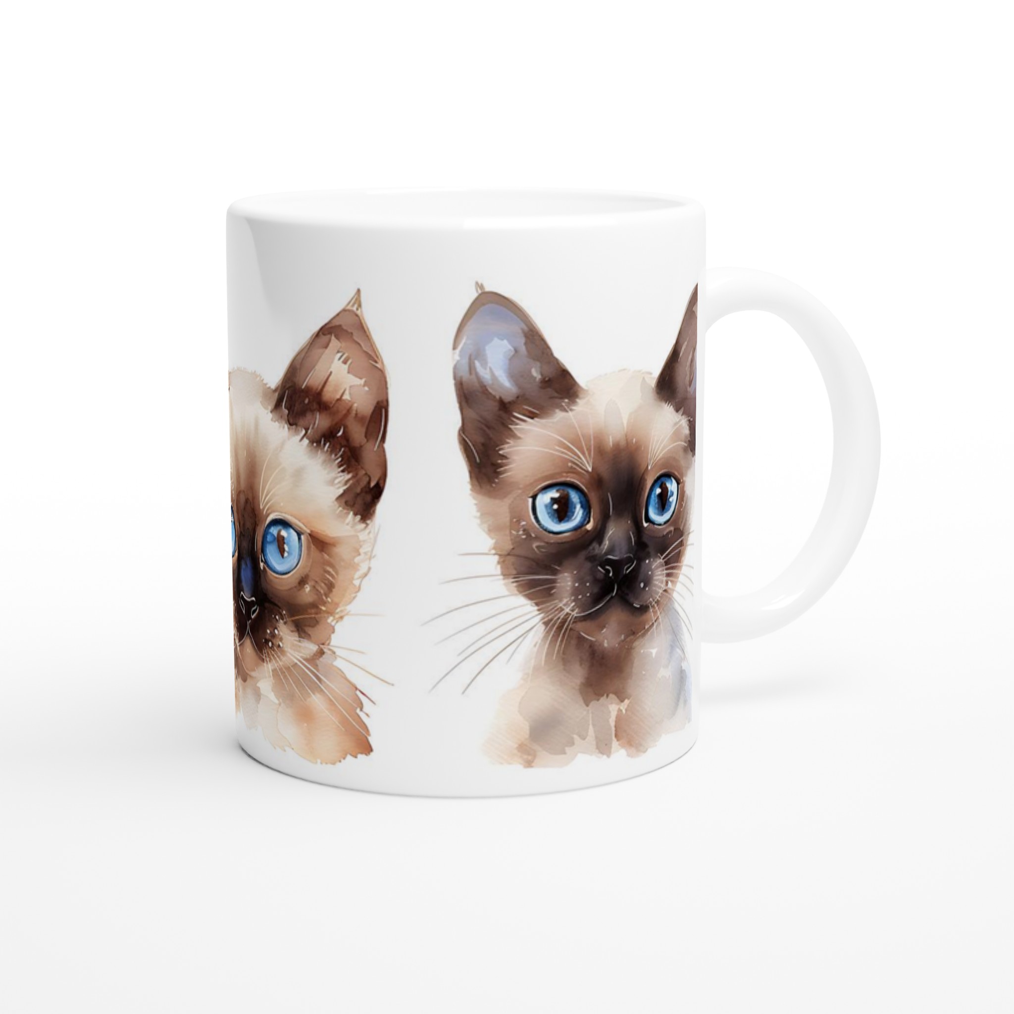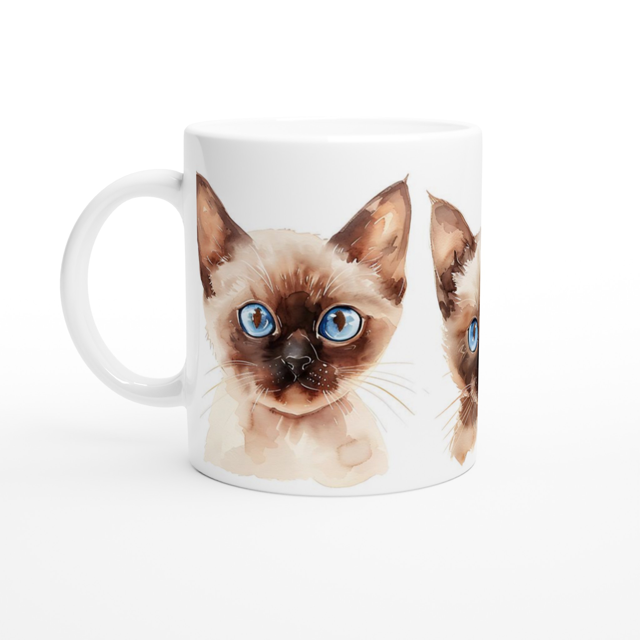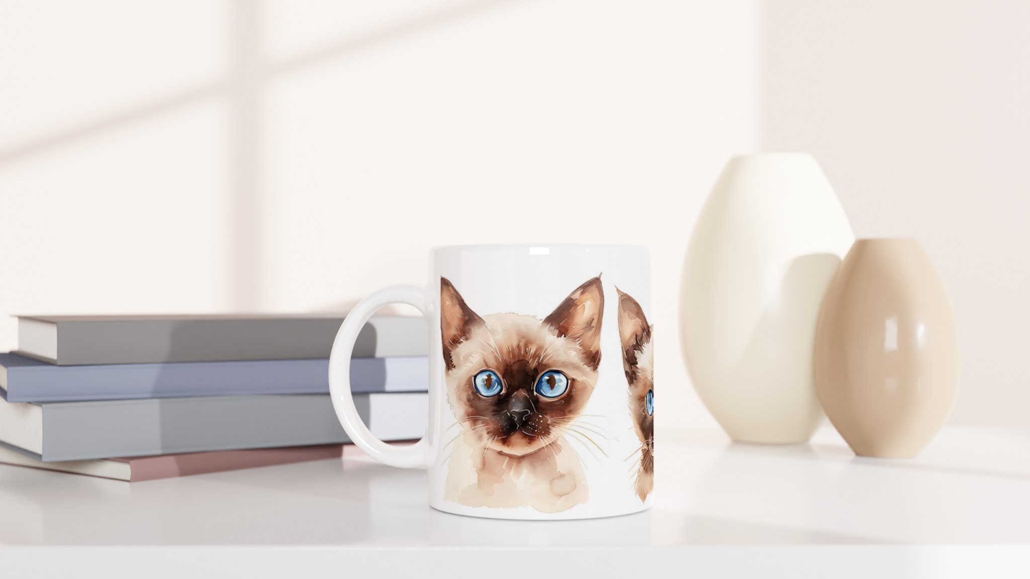 Fånga den bedårande charmen hos en siameskatt varje dag med denna förtjusande keramiska mugg. Dess akvarellinspirerade design, med de distinkta blå ögonen och varma bruna nyanserna, gör varje klunk till en liten stund av glädje. Denna mugg är mer än bara en dryckesbehållare; den är en hyllning till din kärlek för katter och en omedelbar konversationsstartare.