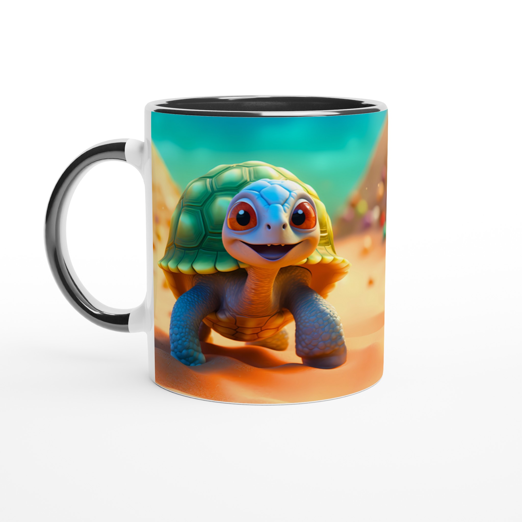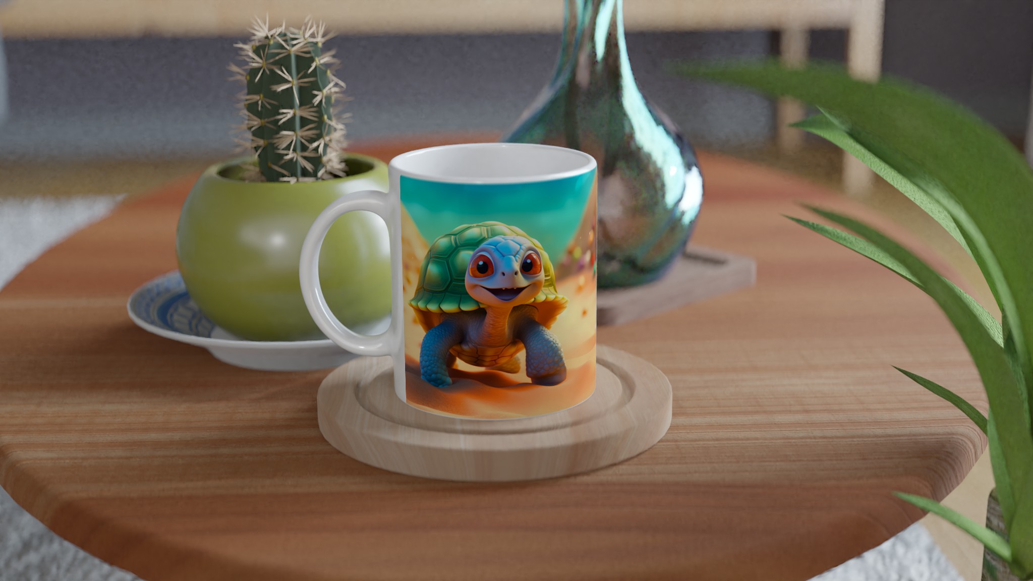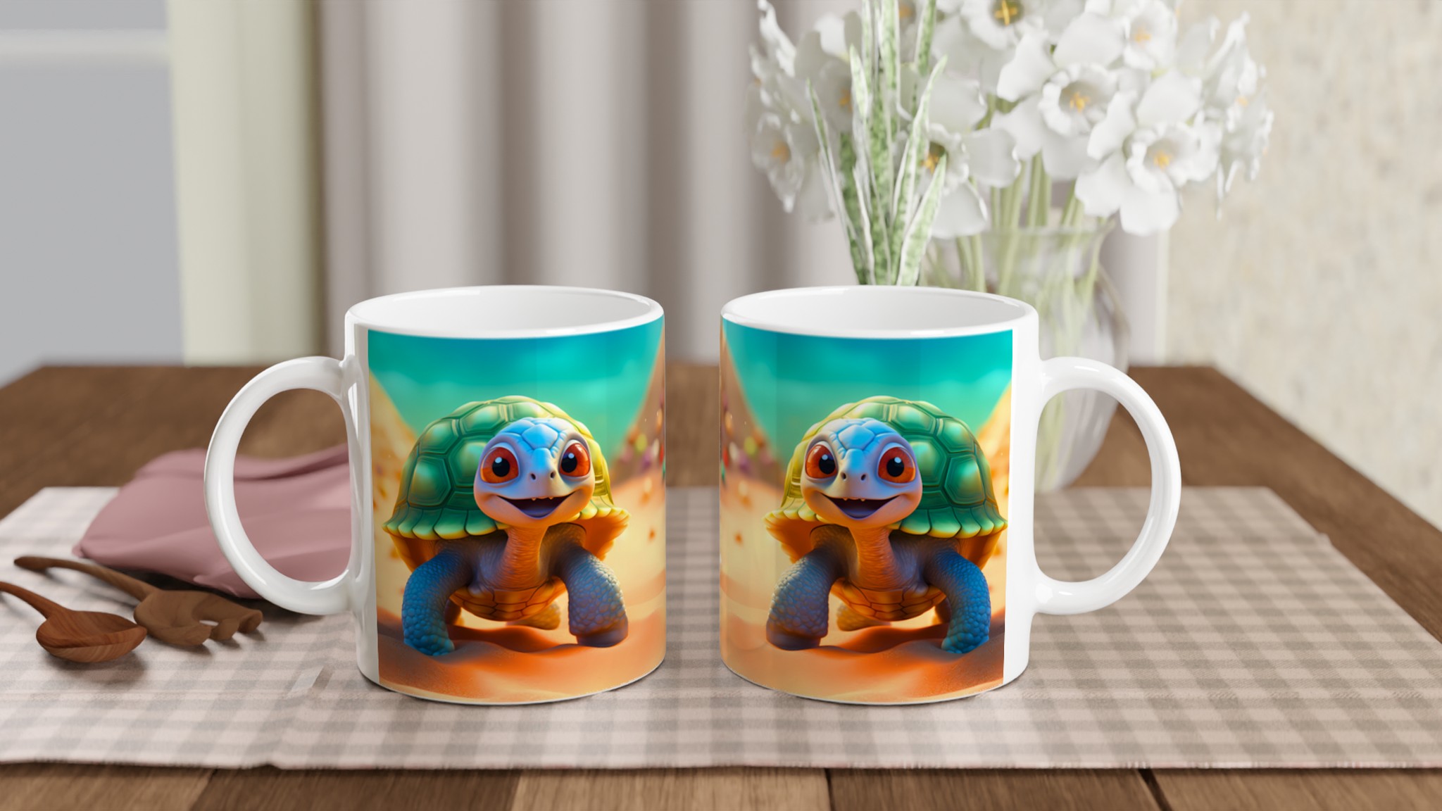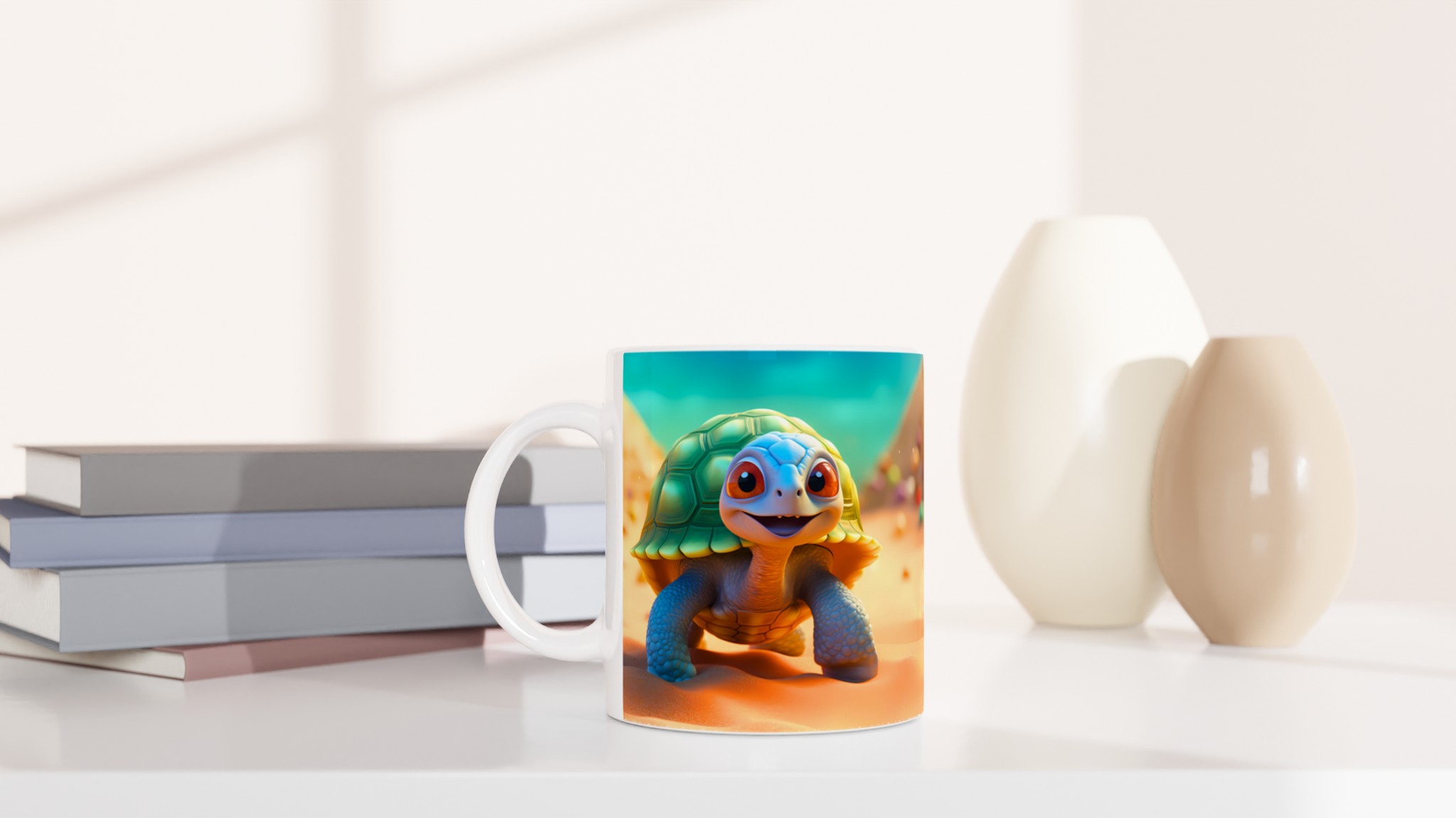 Låt den här charmiga keramiska muggen med sin söta sköldpaddsdesign lysa upp din dag! Perfekt för morgonkaffet, kvällens varma choklad eller när du bara vill njuta av en kopp te. Den blanka vita ytan gör att trycket med den glada sköldpaddan framhävs med klara och levande färger, som håller sig fina även efter många turer i mikron och diskmaskinen. Välj den färg som bäst matchar din stil eller ditt humör, och låt denna lilla vän följa med dig genom dagen.