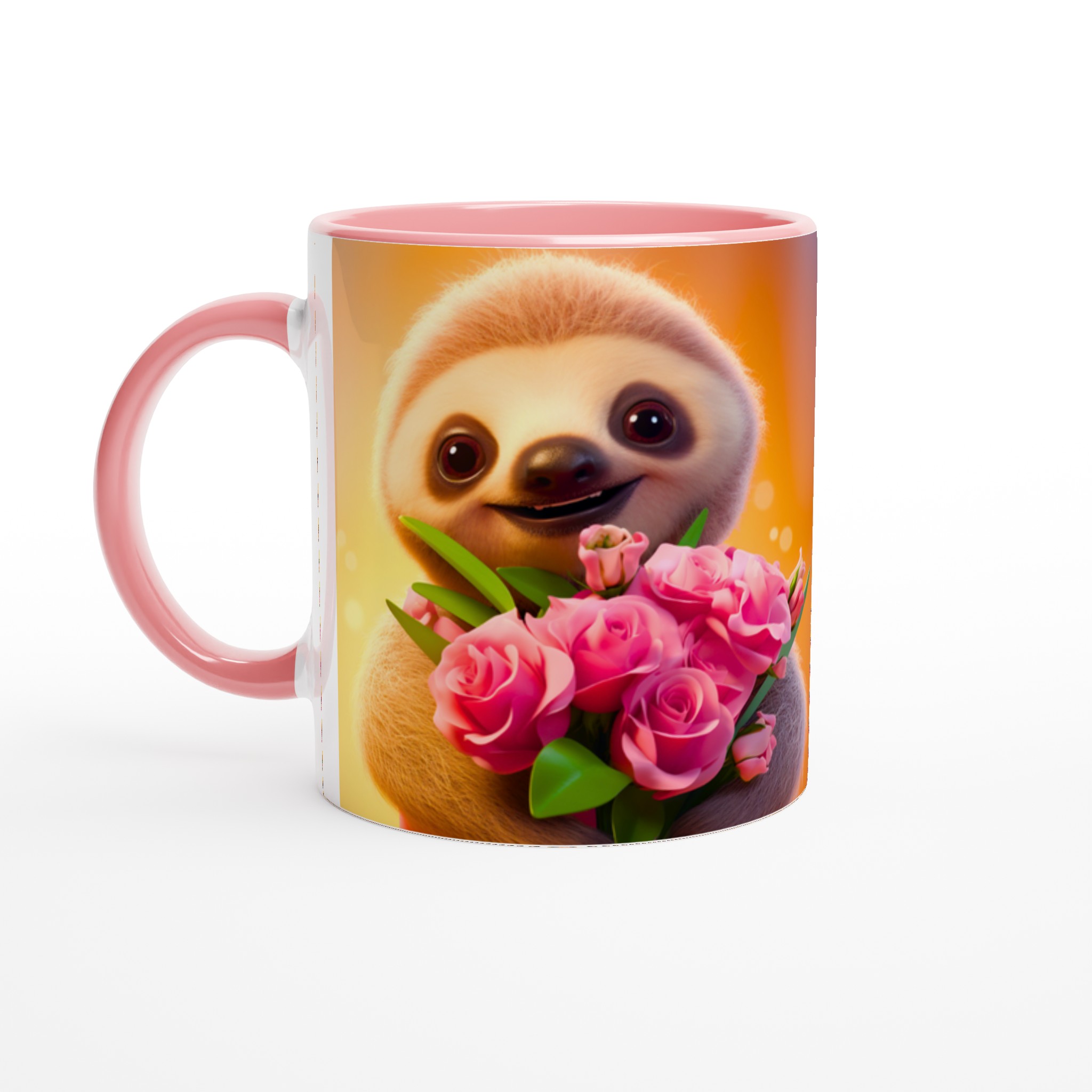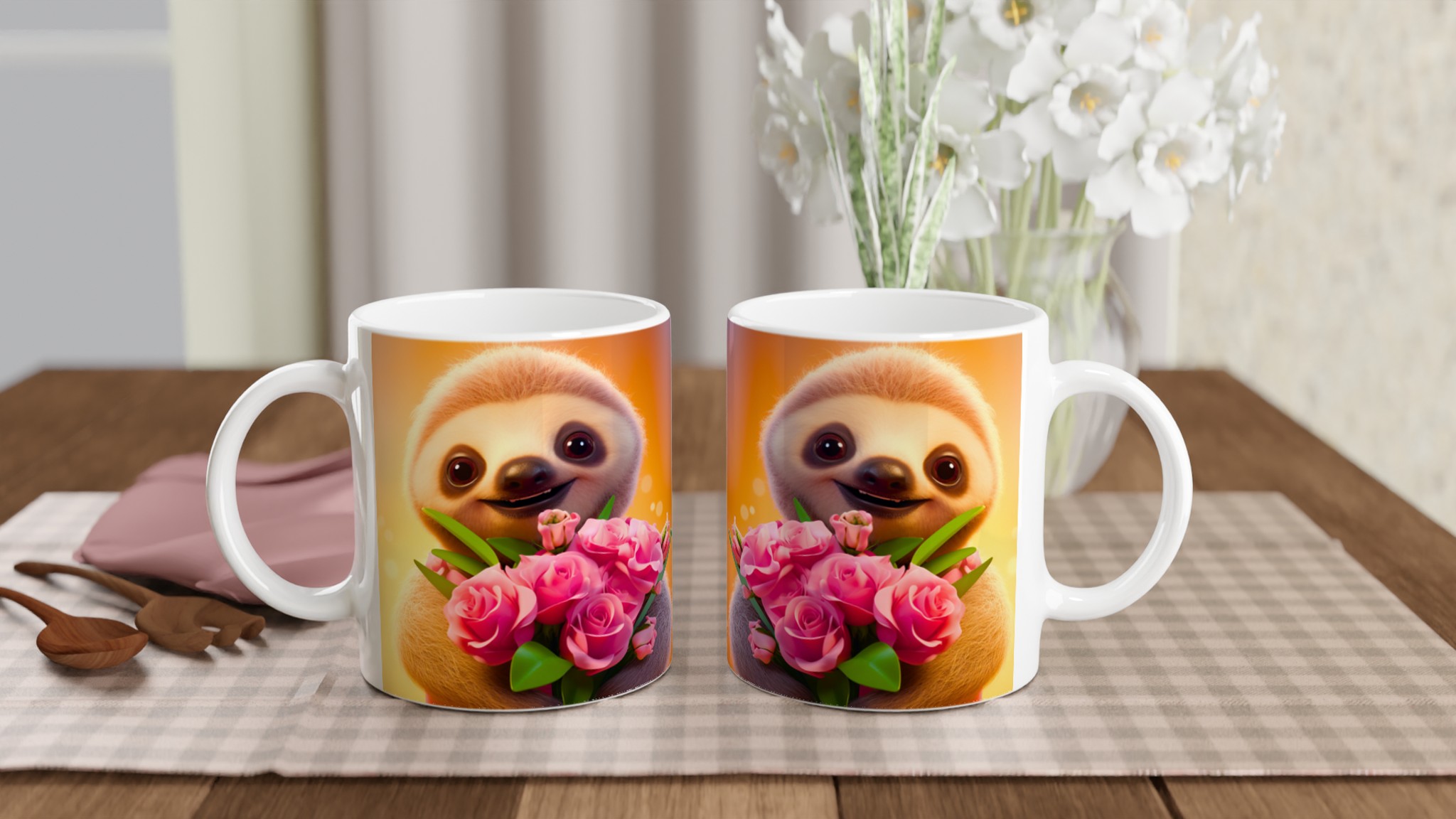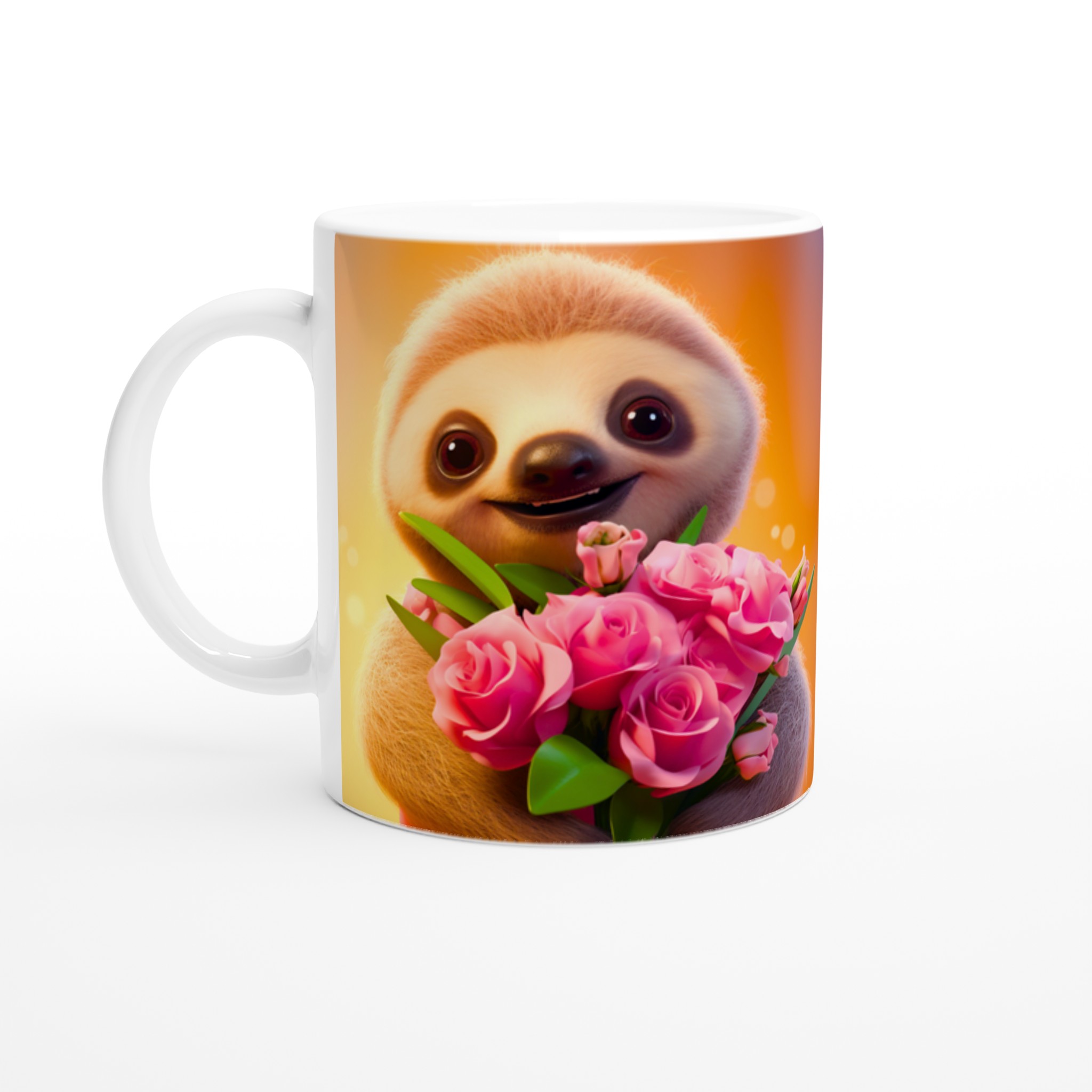 Fånga hjärtat med denna bedårande keramiska mugg, prydd med en leende sengångare som håller en bukett vackra rosa rosor. Den soliga, varma färgpaletten och den glada atmosfären gör varje sip till en liten glädjestund. Perfekt för morgonkaffet, kvällens varma choklad eller när du bara vill njuta av en kopp te.