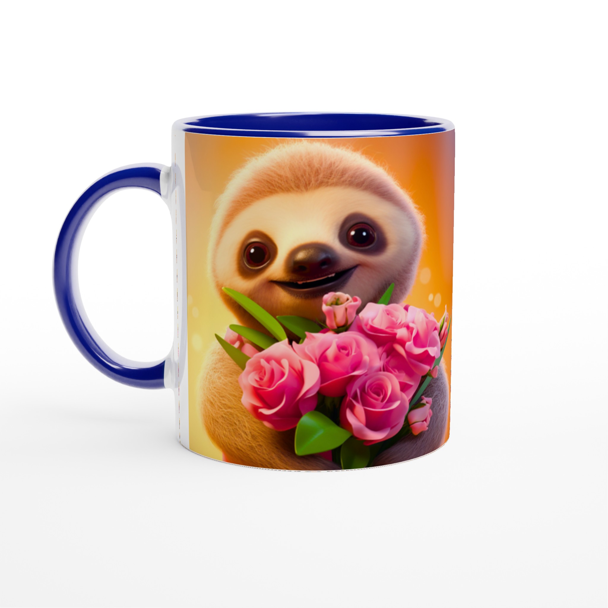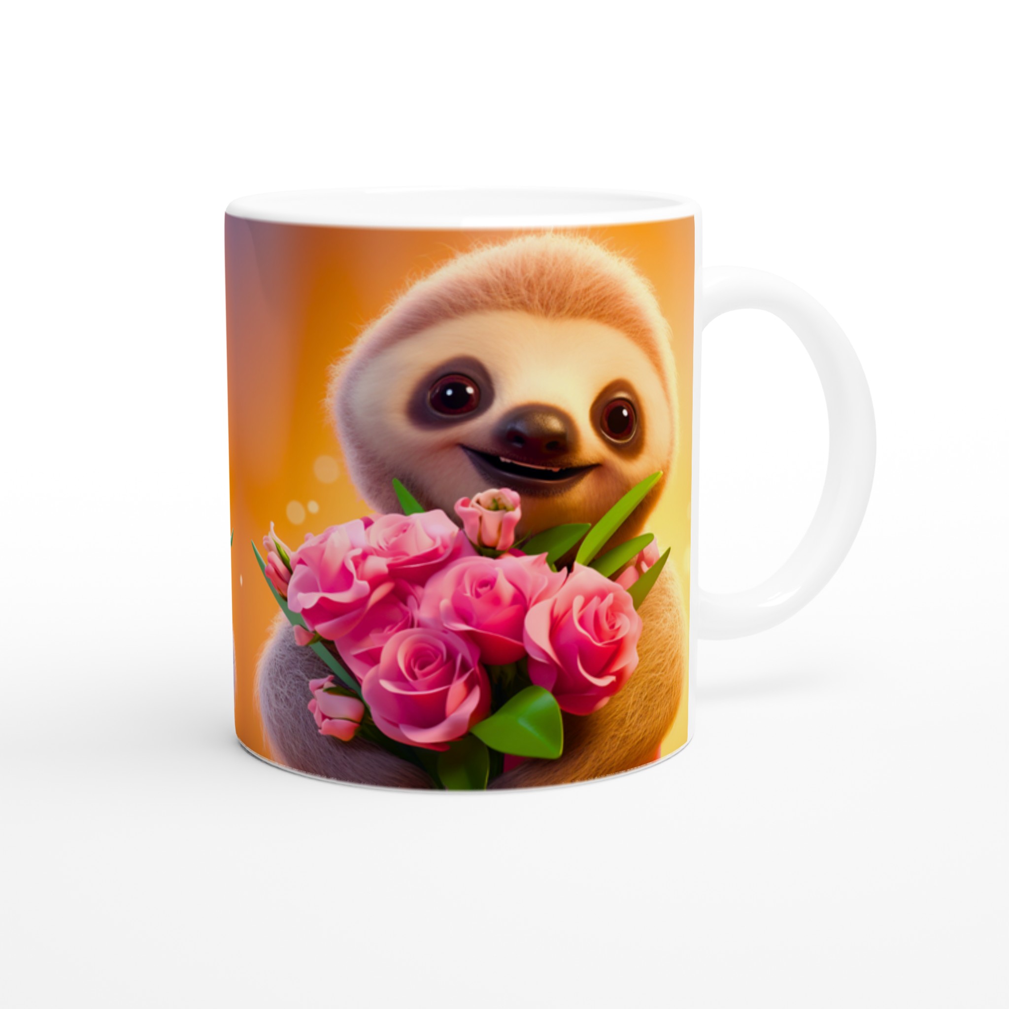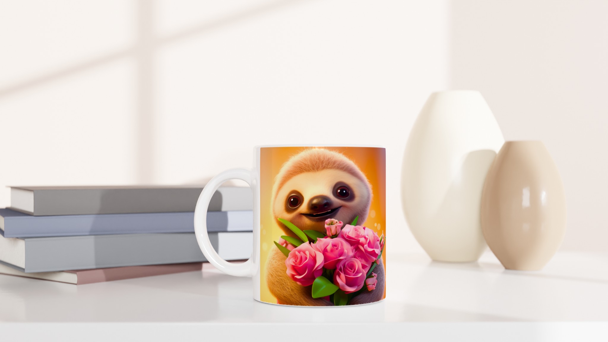 Fånga hjärtat med denna bedårande keramiska mugg, prydd med en leende sengångare som håller en bukett vackra rosa rosor. Den soliga, varma färgpaletten och den glada atmosfären gör varje sip till en liten glädjestund. Perfekt för morgonkaffet, kvällens varma choklad eller när du bara vill njuta av en kopp te.