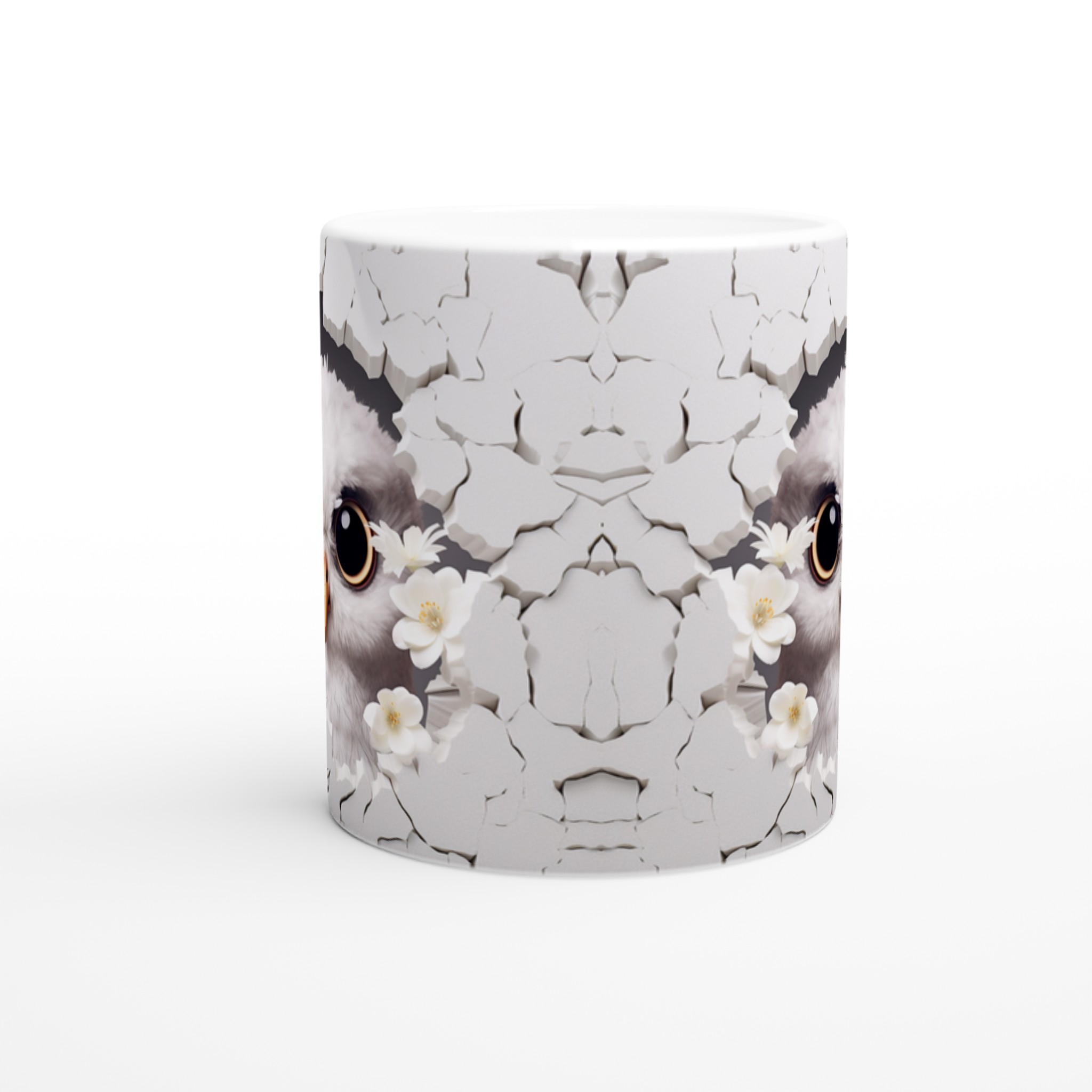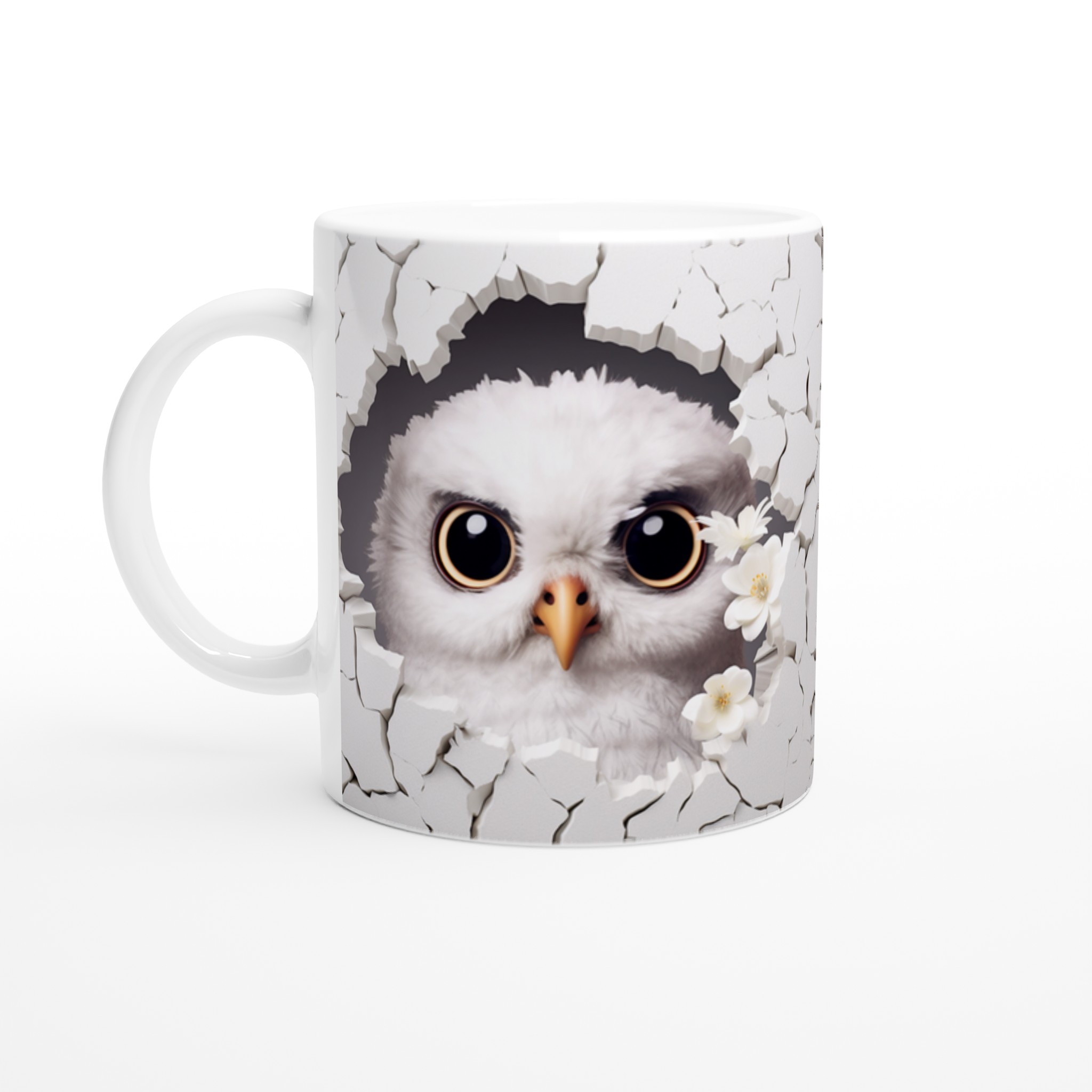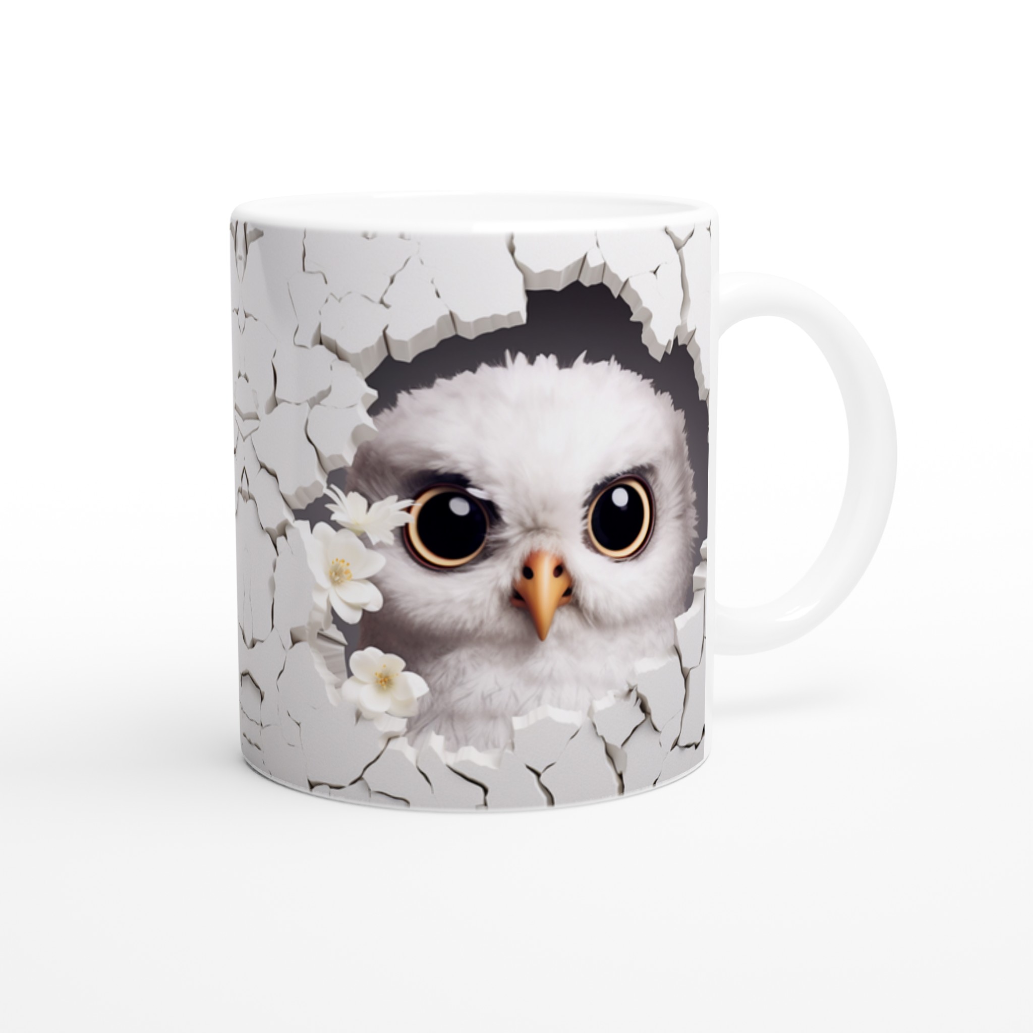 Låt denna bedårande uggla kika fram ur din morgonrutin! Denna charmiga keramiska mugg blir snabbt en vardagsfavorit, perfekt för morgonkaffet, kvällens varma choklad eller när du bara vill njuta av en kopp te. Med sitt unika motiv av en söt liten uggla som kikar ut ur ett sprucket hål i väggen, omgiven av delikata vita blommor, tillför den en lekfull och mysig känsla till varje paus.