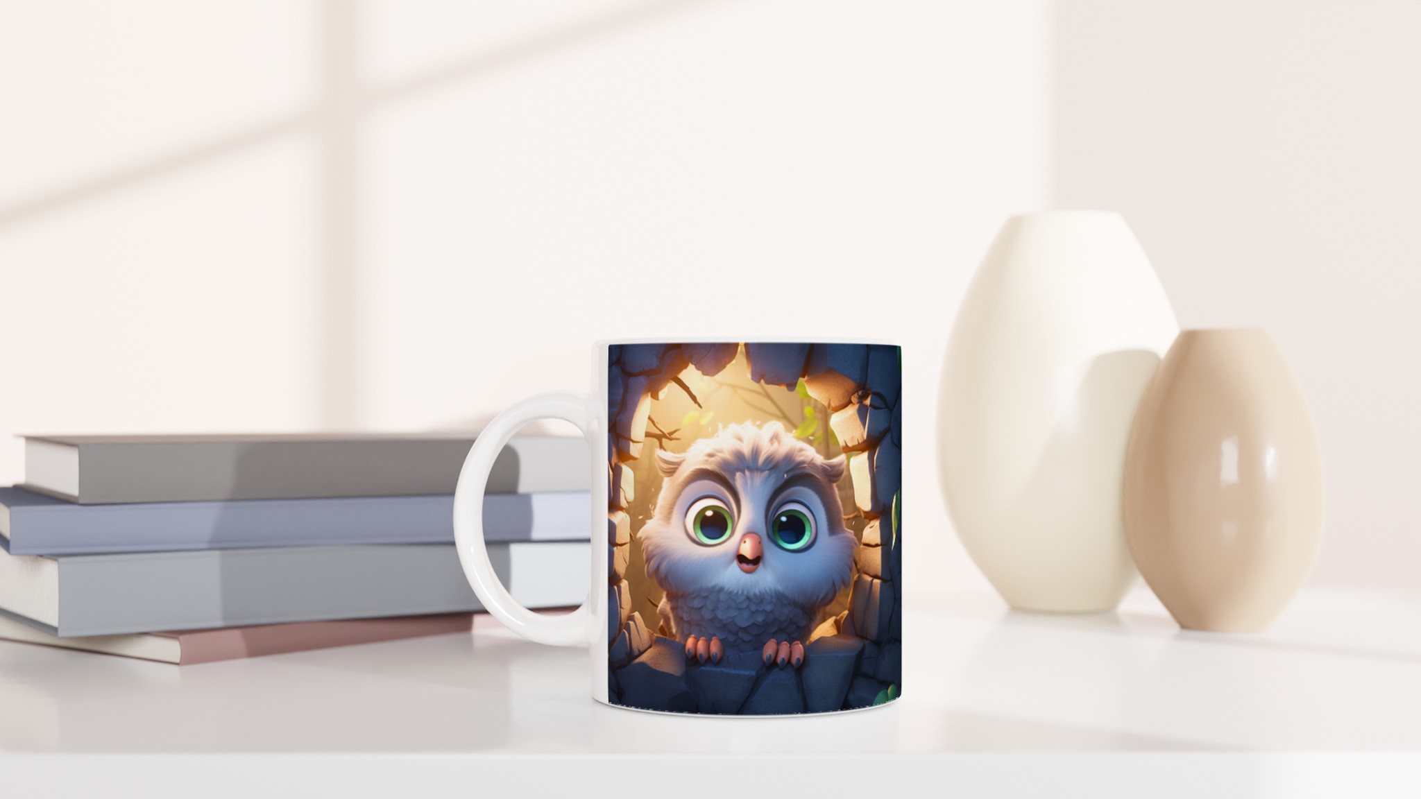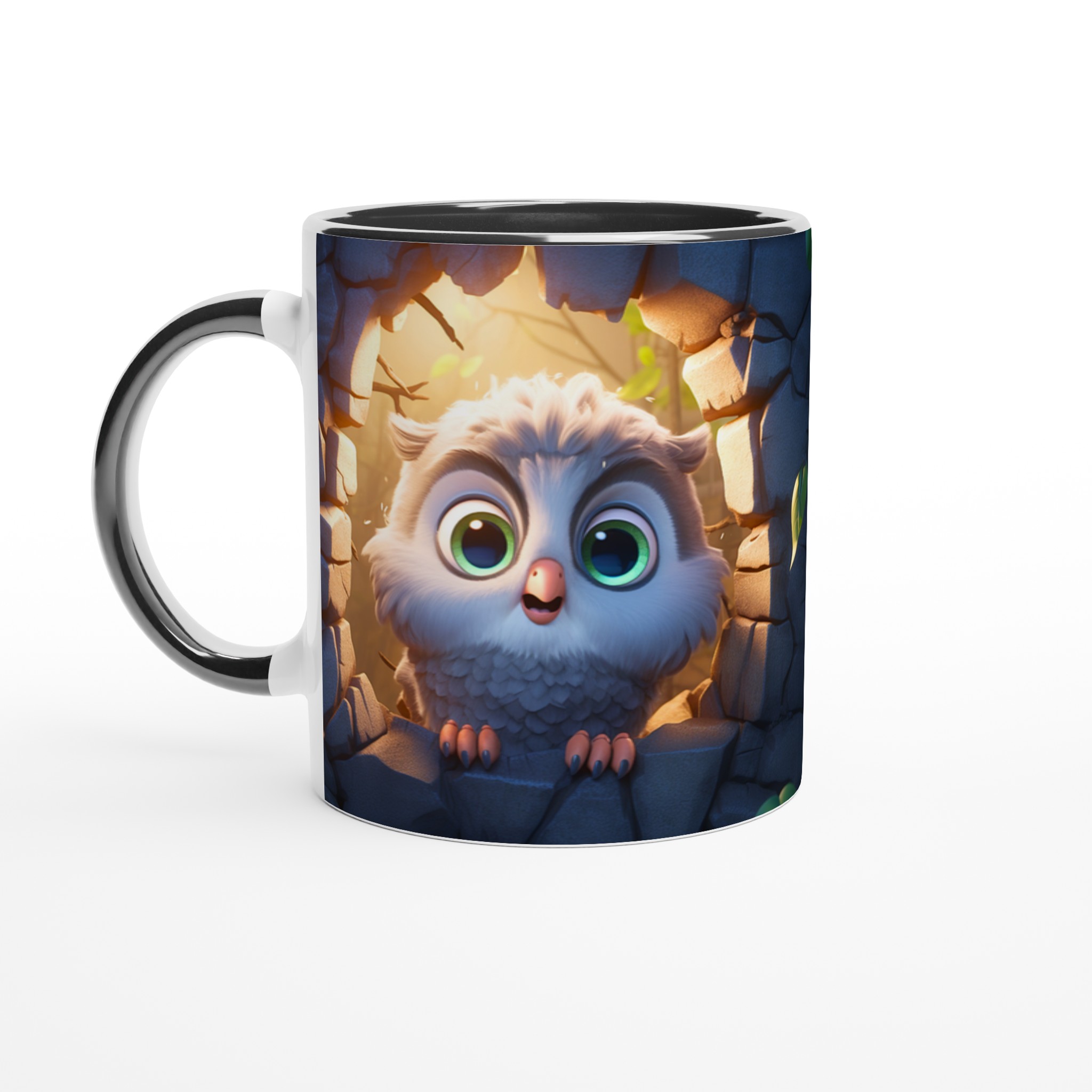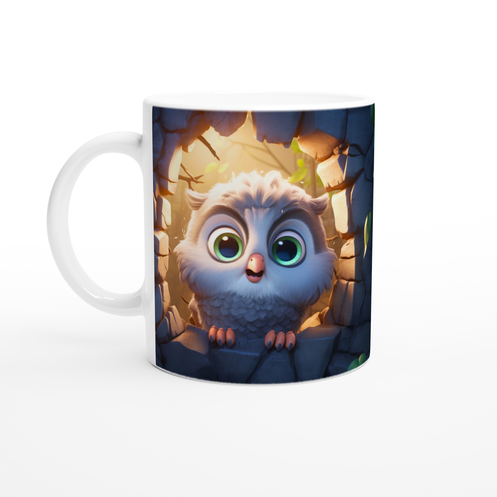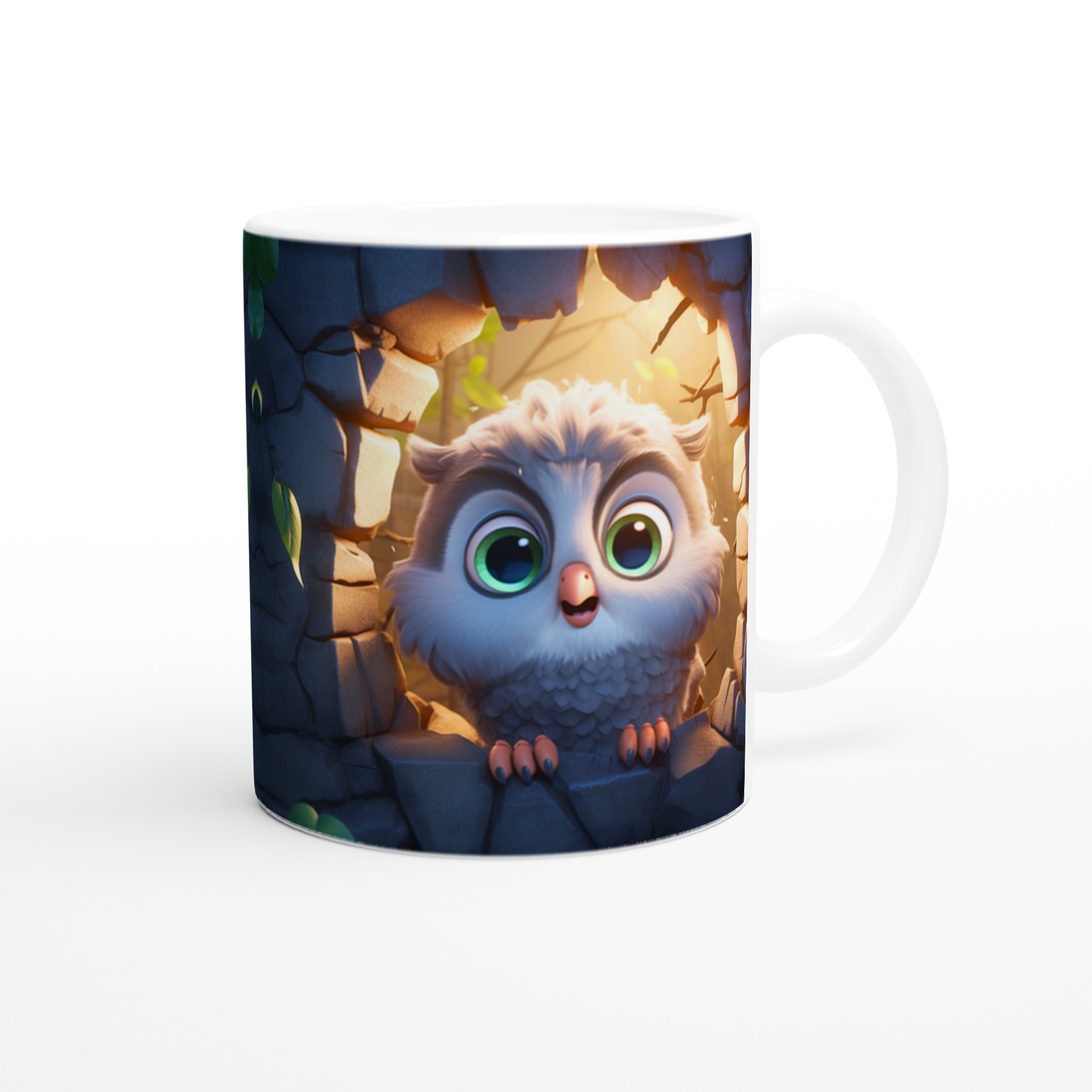 Låt den här bedårande keramiska muggen med en söt, tecknad uggla bli din nya favorit för alla mysiga stunder. Föreställ dig hur den lekfulla ugglan, med sina stora, uttrycksfulla ögon och fluffiga fjädrar, tittar fram från sin steniga vrå, badad i ett varmt, magiskt ljus. Den fångar perfekt känslan av lugn och glädje, vilket gör varje klunk till en liten stund av lycka. Den blanka vita ytan framhäver uggleans charmiga detaljer med klara och levande färger, som håller sig fina även efter många turer i mikron och diskmaskinen.