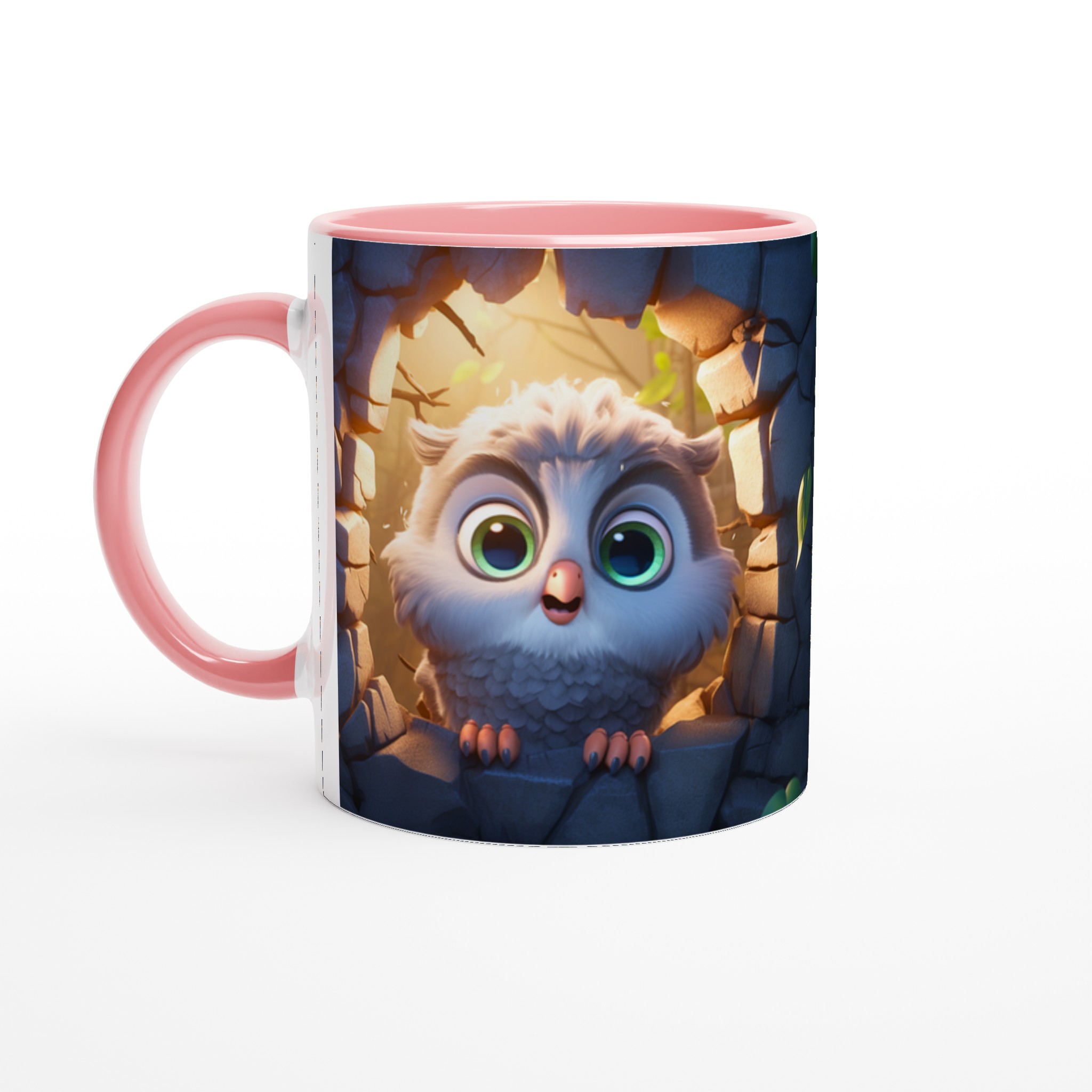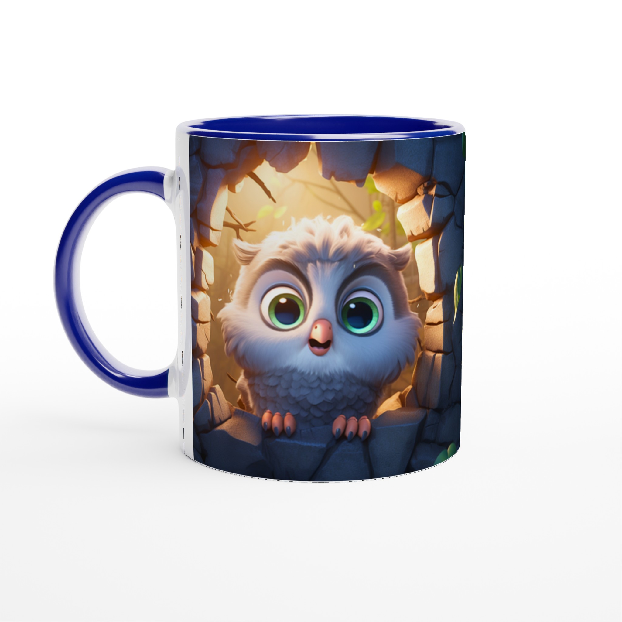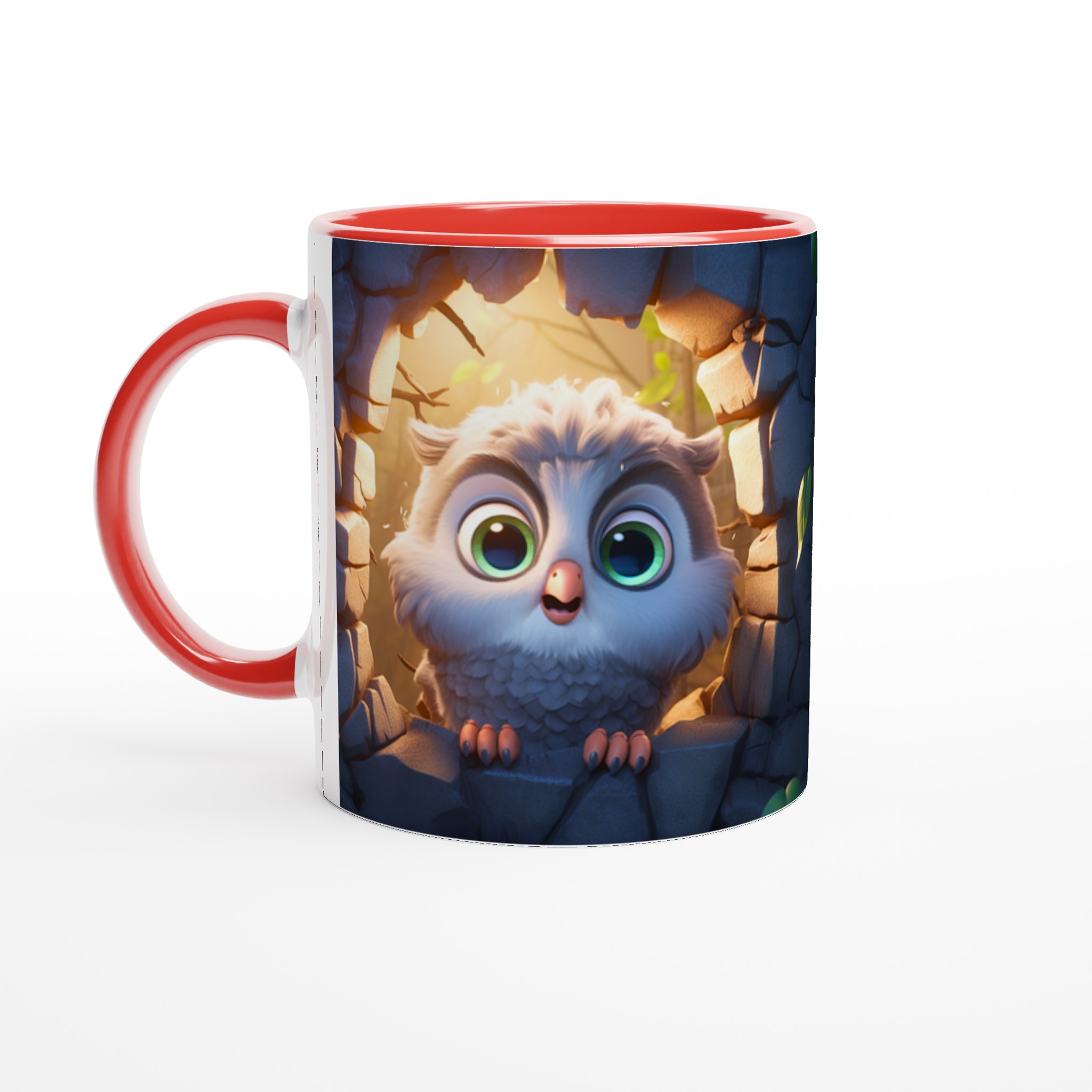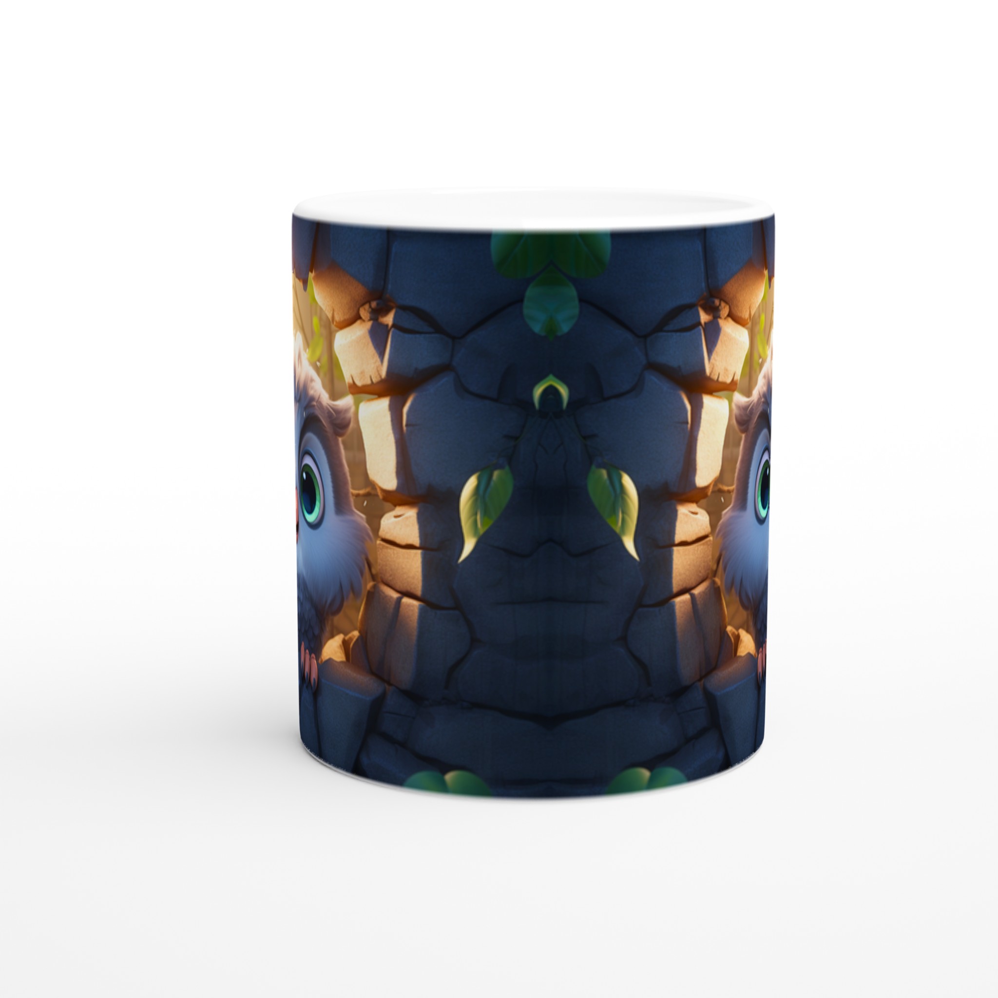 Låt den här bedårande keramiska muggen med en söt, tecknad uggla bli din nya favorit för alla mysiga stunder. Föreställ dig hur den lekfulla ugglan, med sina stora, uttrycksfulla ögon och fluffiga fjädrar, tittar fram från sin steniga vrå, badad i ett varmt, magiskt ljus. Den fångar perfekt känslan av lugn och glädje, vilket gör varje klunk till en liten stund av lycka. Den blanka vita ytan framhäver uggleans charmiga detaljer med klara och levande färger, som håller sig fina även efter många turer i mikron och diskmaskinen.