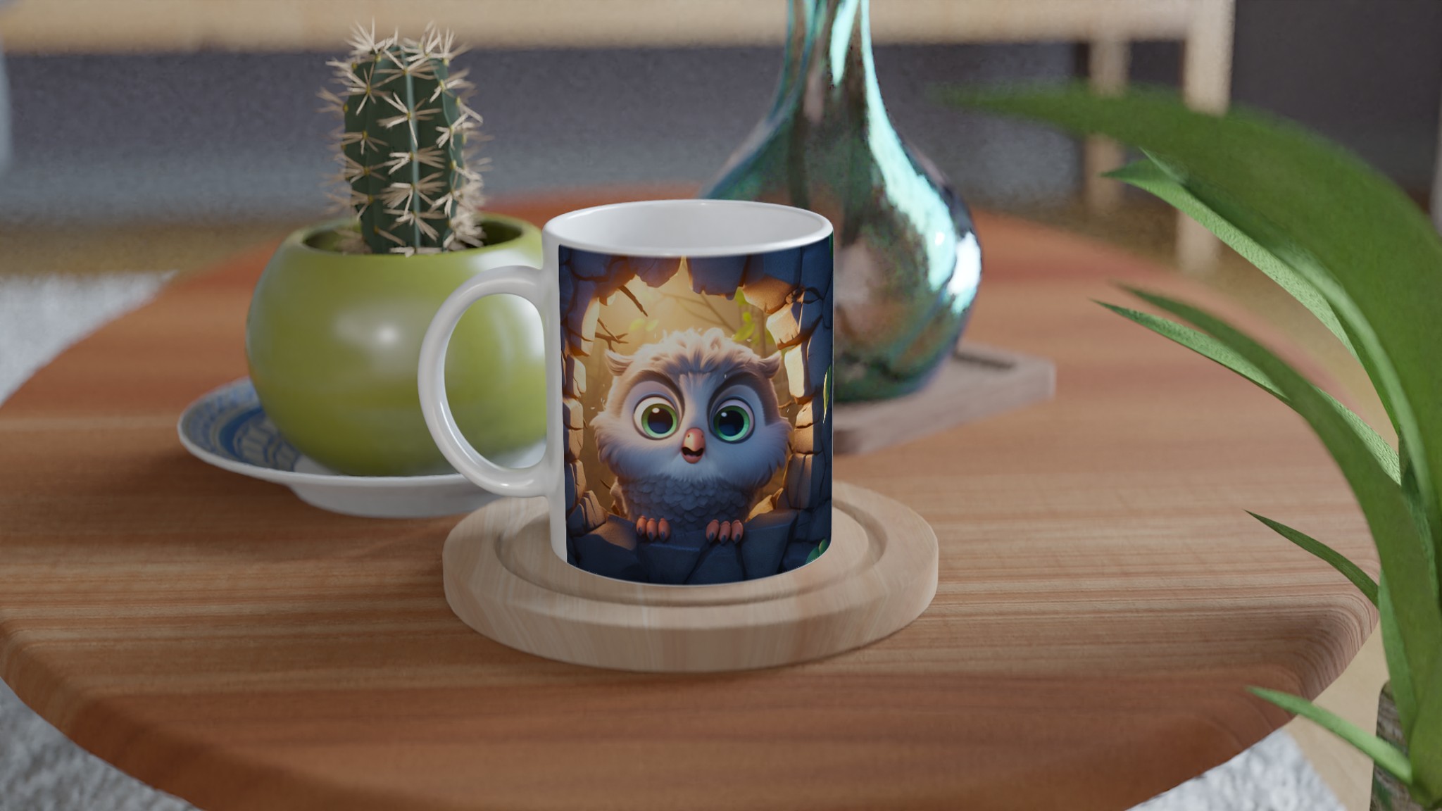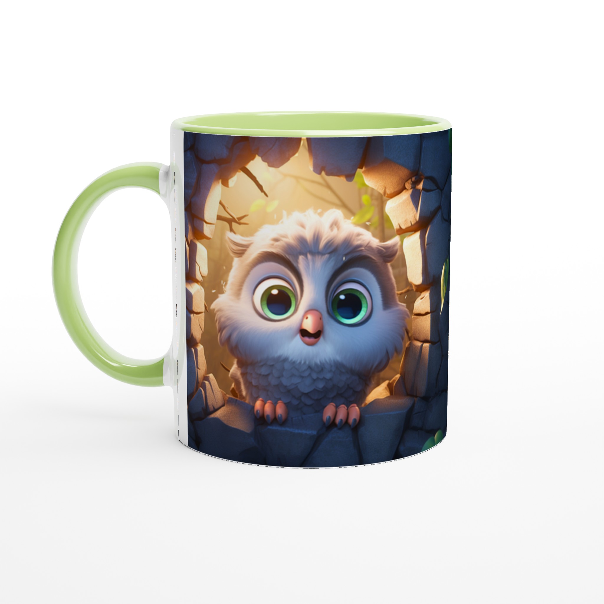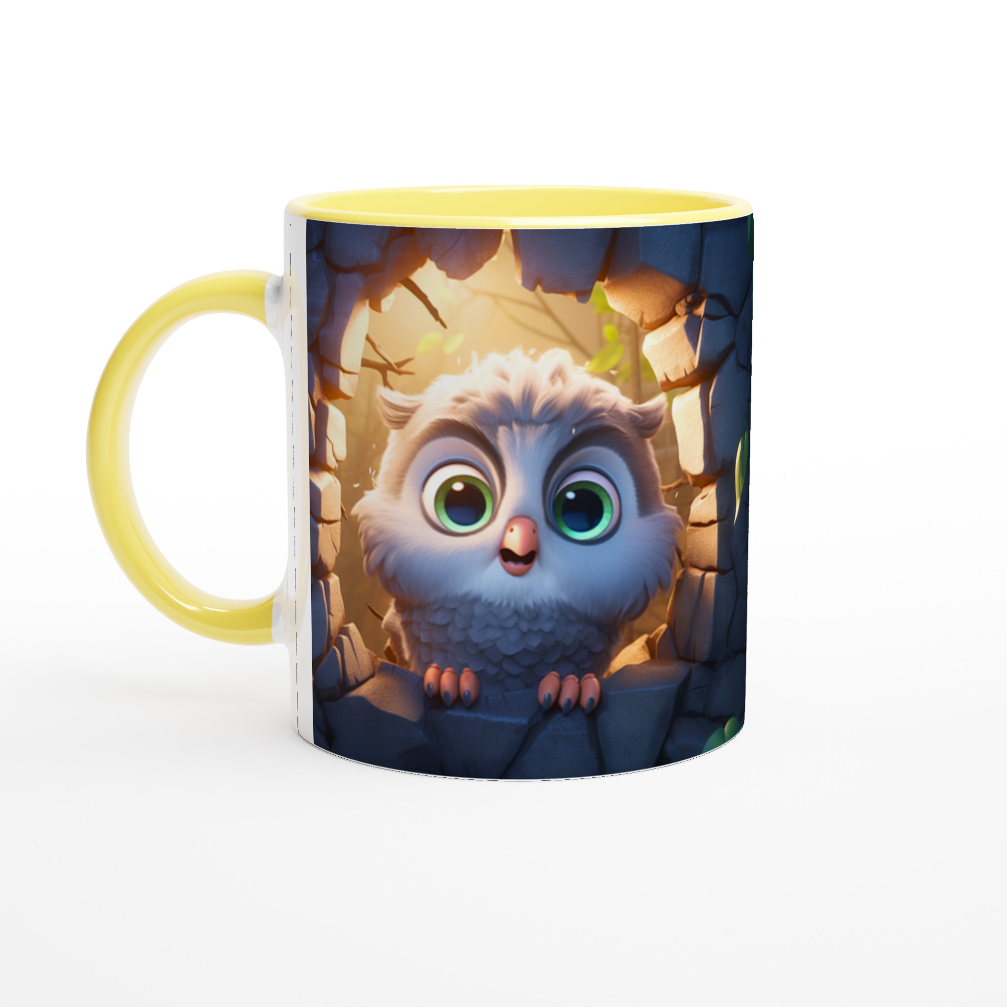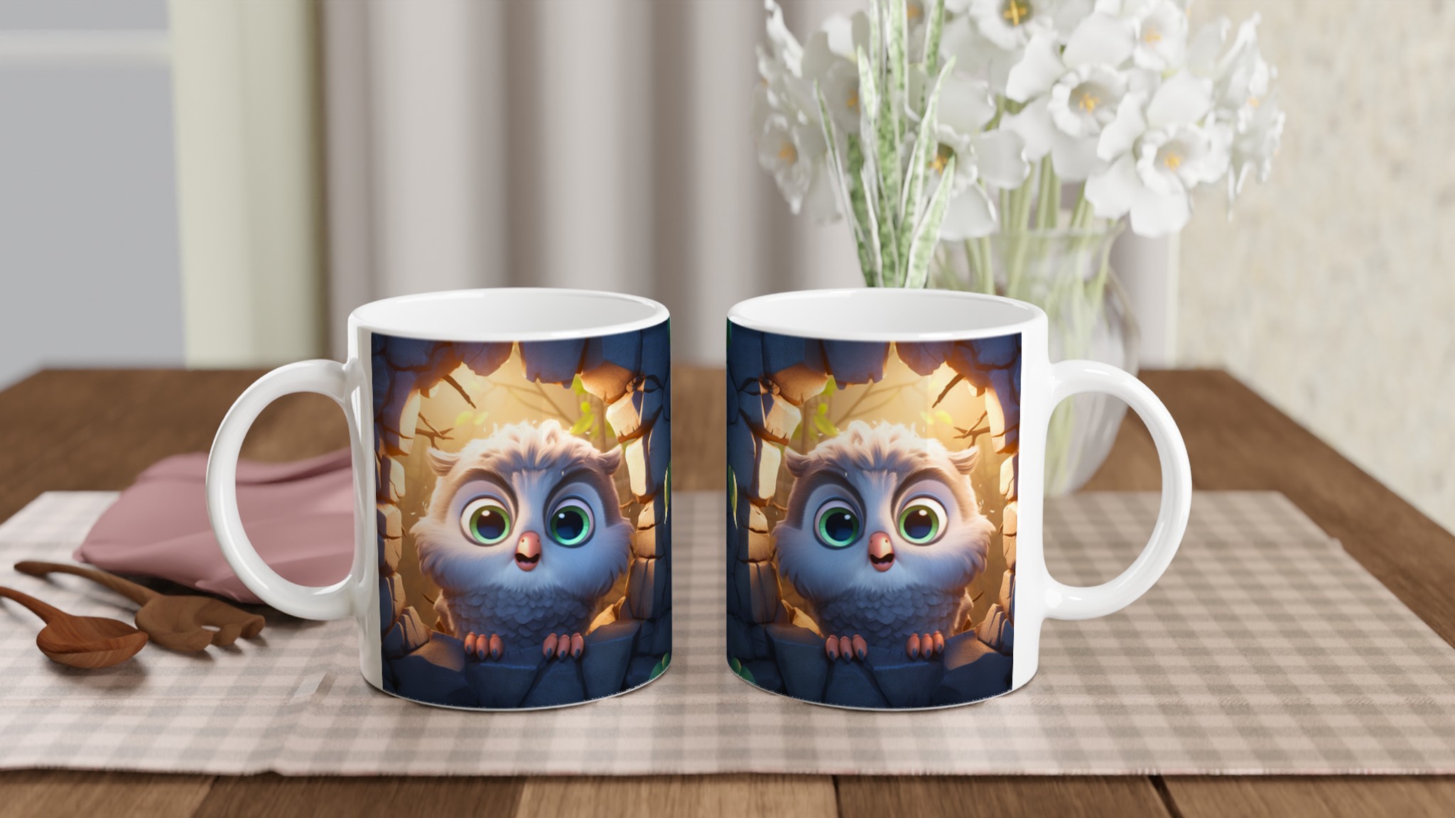 Låt den här bedårande keramiska muggen med en söt, tecknad uggla bli din nya favorit för alla mysiga stunder. Föreställ dig hur den lekfulla ugglan, med sina stora, uttrycksfulla ögon och fluffiga fjädrar, tittar fram från sin steniga vrå, badad i ett varmt, magiskt ljus. Den fångar perfekt känslan av lugn och glädje, vilket gör varje klunk till en liten stund av lycka. Den blanka vita ytan framhäver uggleans charmiga detaljer med klara och levande färger, som håller sig fina även efter många turer i mikron och diskmaskinen.