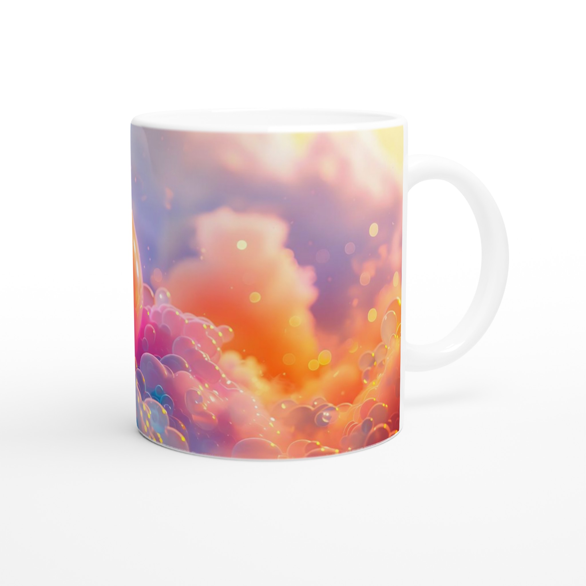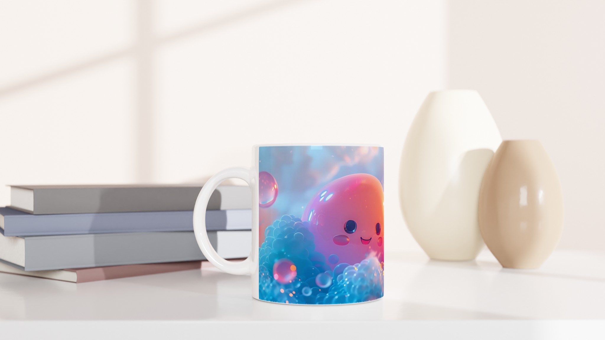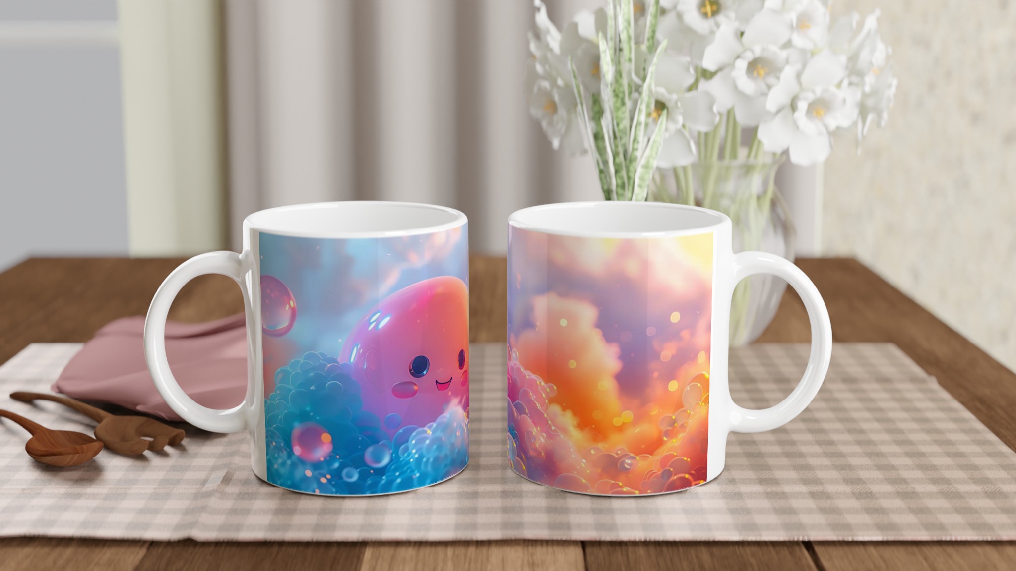 Välkommen till en värld av förtrollning med vår ”Söt Värld” keramiska mugg! Inspirerad av bilden av en glad, rosa bubbelvarelse omgiven av drömska pastellmoln och glittrande bubblor, är denna mugg designad för att sprida glädje och en känsla av lekfull magi till din vardag. Perfekt för alla dagens stunder – morgonkaffet, en värmande kopp te eller en härlig varm choklad – den blanka ytan gör att trycken framträder klart och färgstarkt, vilket gör muggen till en riktig favorit i vardagen.