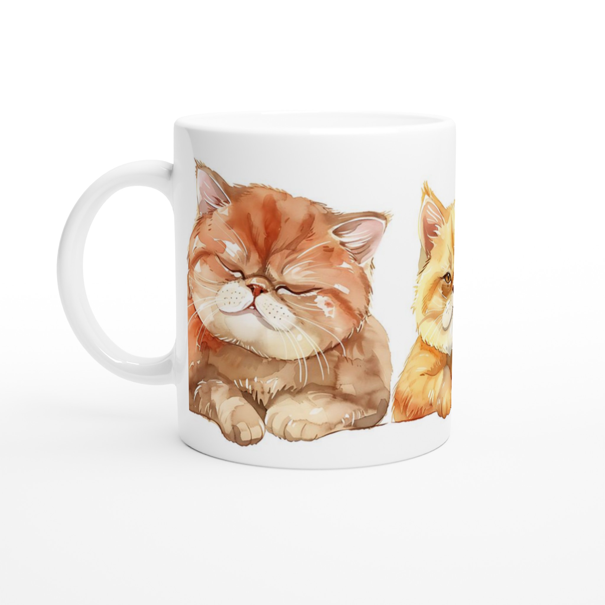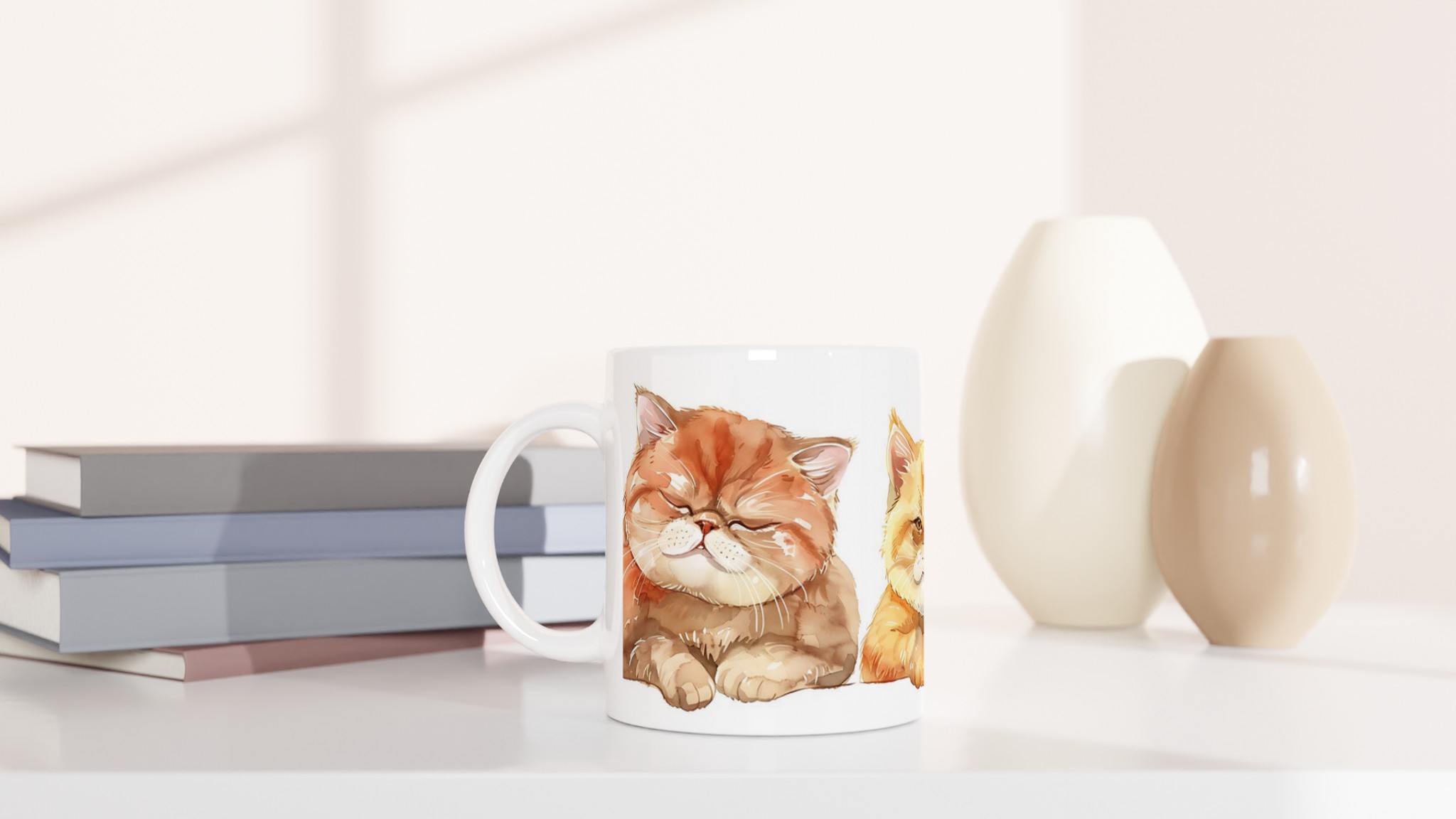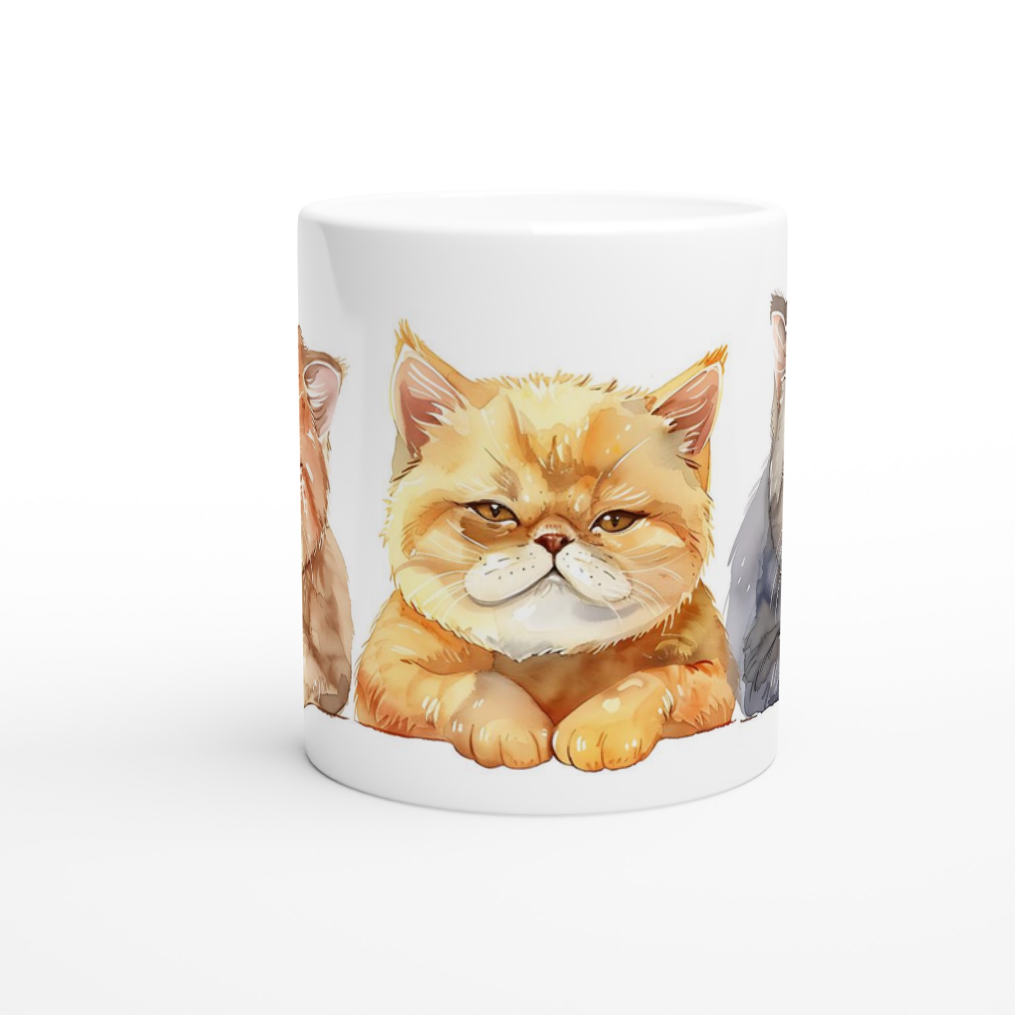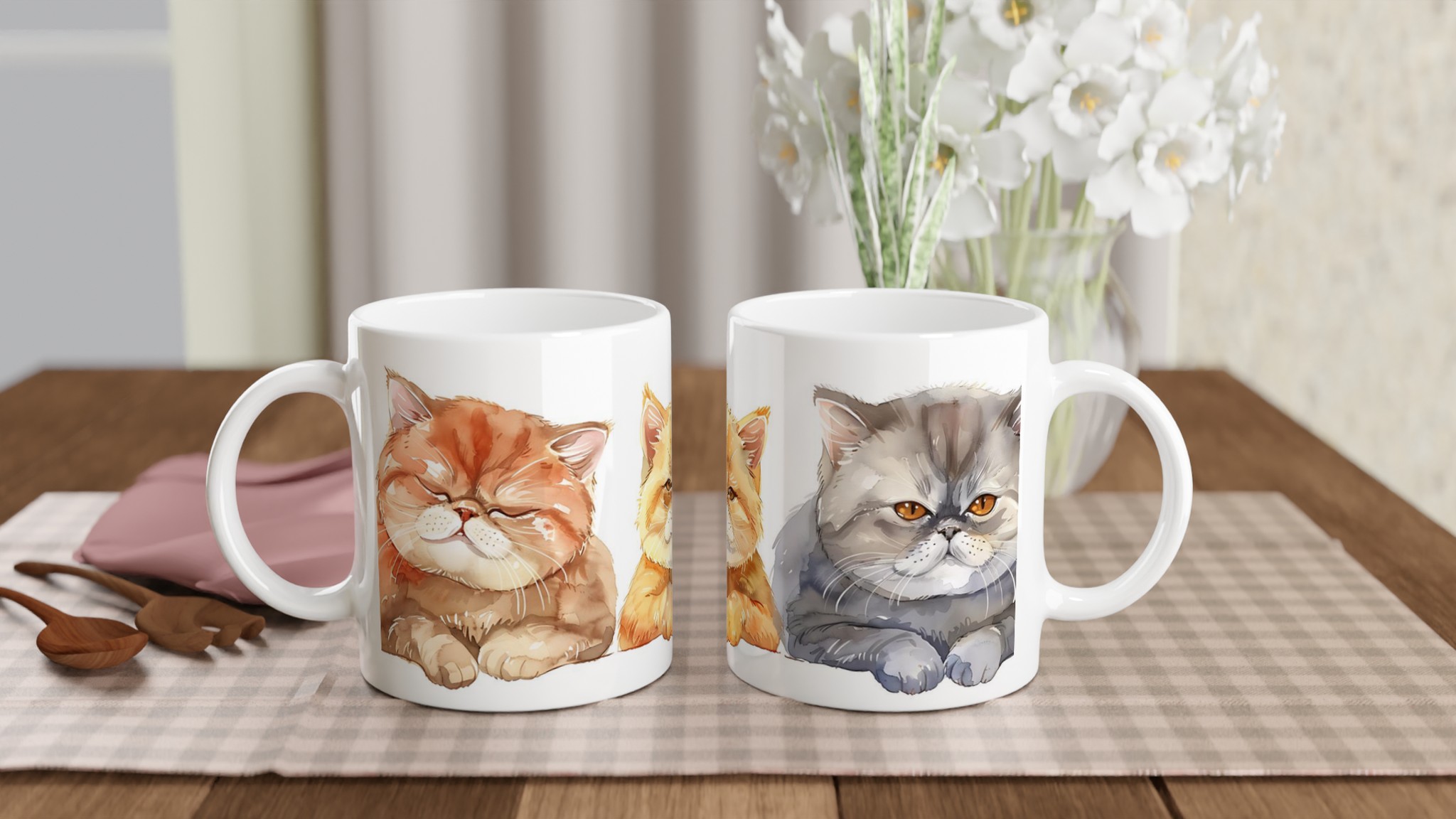 Fånga charmen med våra oemotståndliga akvarellkatter på din nya favoritkopp! Denna stilrena keramiska mugg blir snabbt en vardagsfavorit, perfekt för att lysa upp din morgon med kaffe, värma upp kvällen med varm choklad, eller för att njuta av en mysig kopp te. Varje kattillustration är tryckt med klara och levande färger på den blanka vita ytan, vilket framhäver deras lekfulla personligheter med en handmålad känsla. Och oroa dig inte för att charmen ska försvinna – trycket håller sig lika fint även efter otaliga turer i mikron och diskmaskinen.