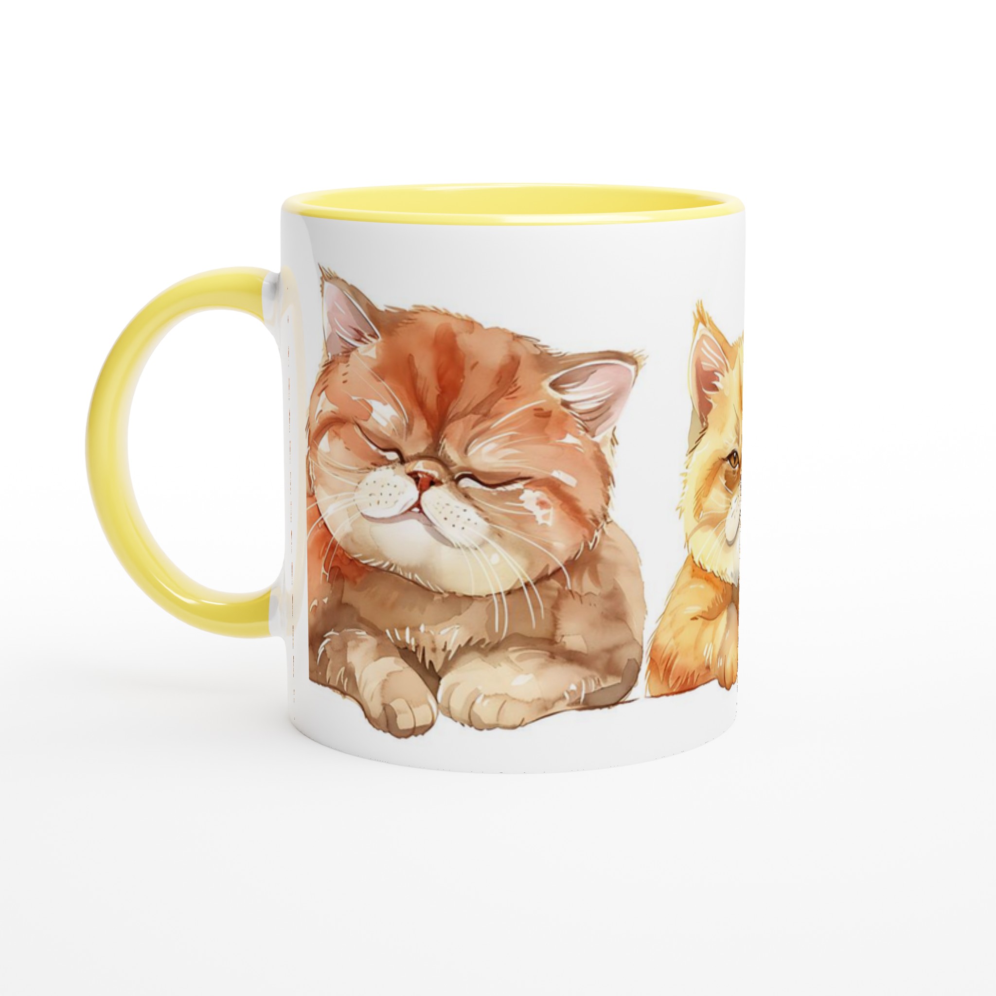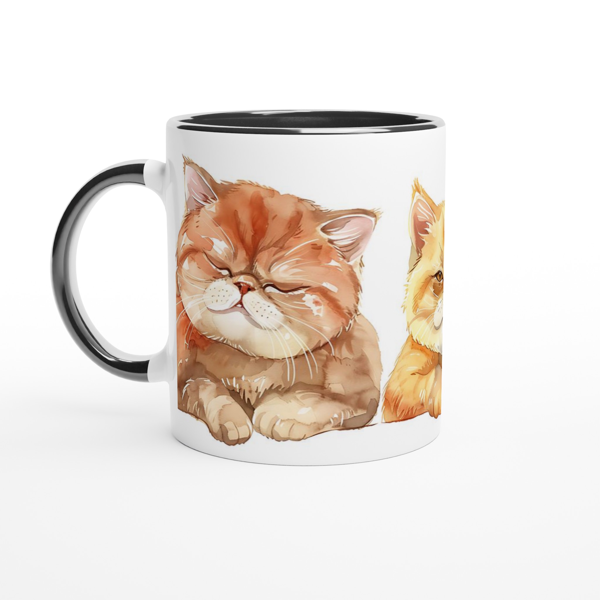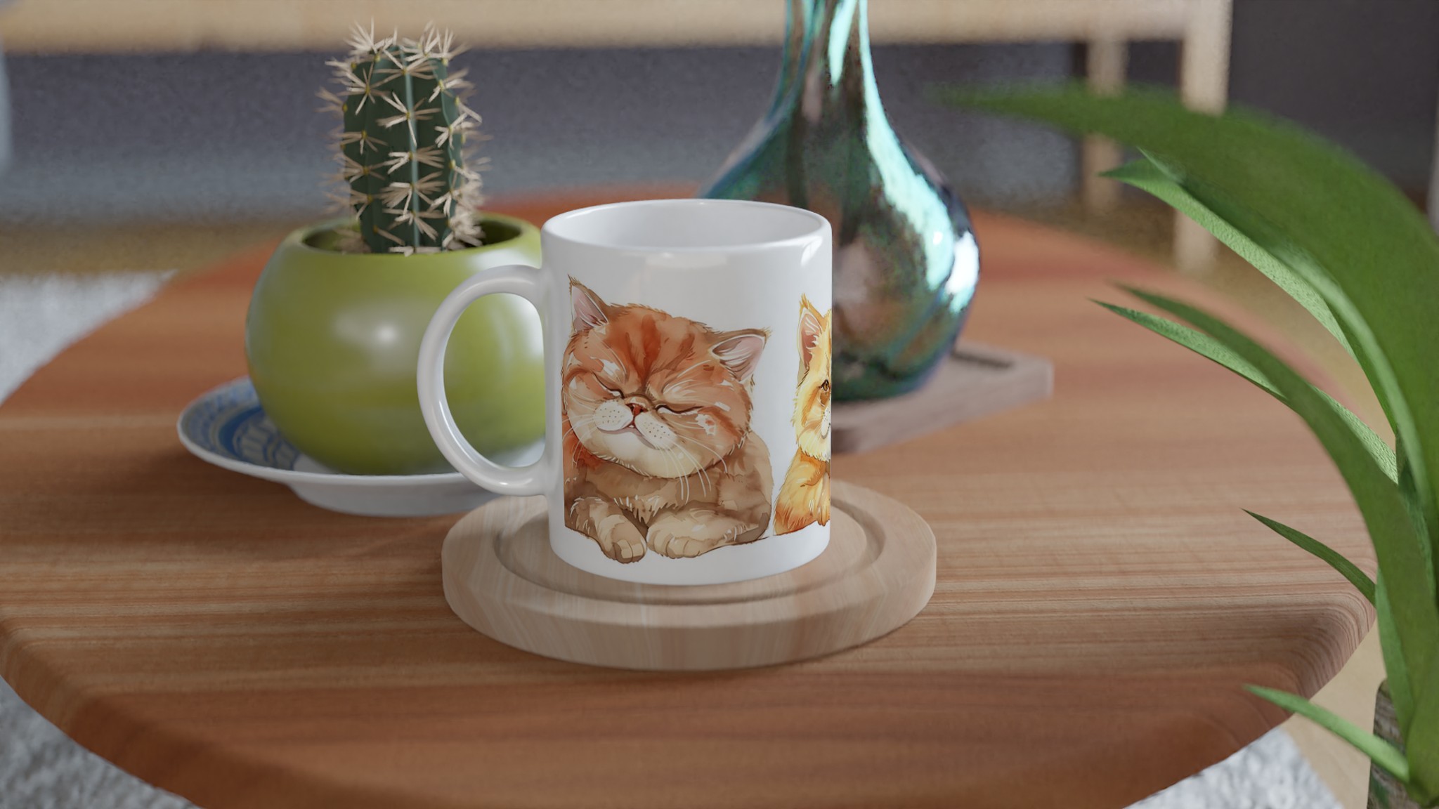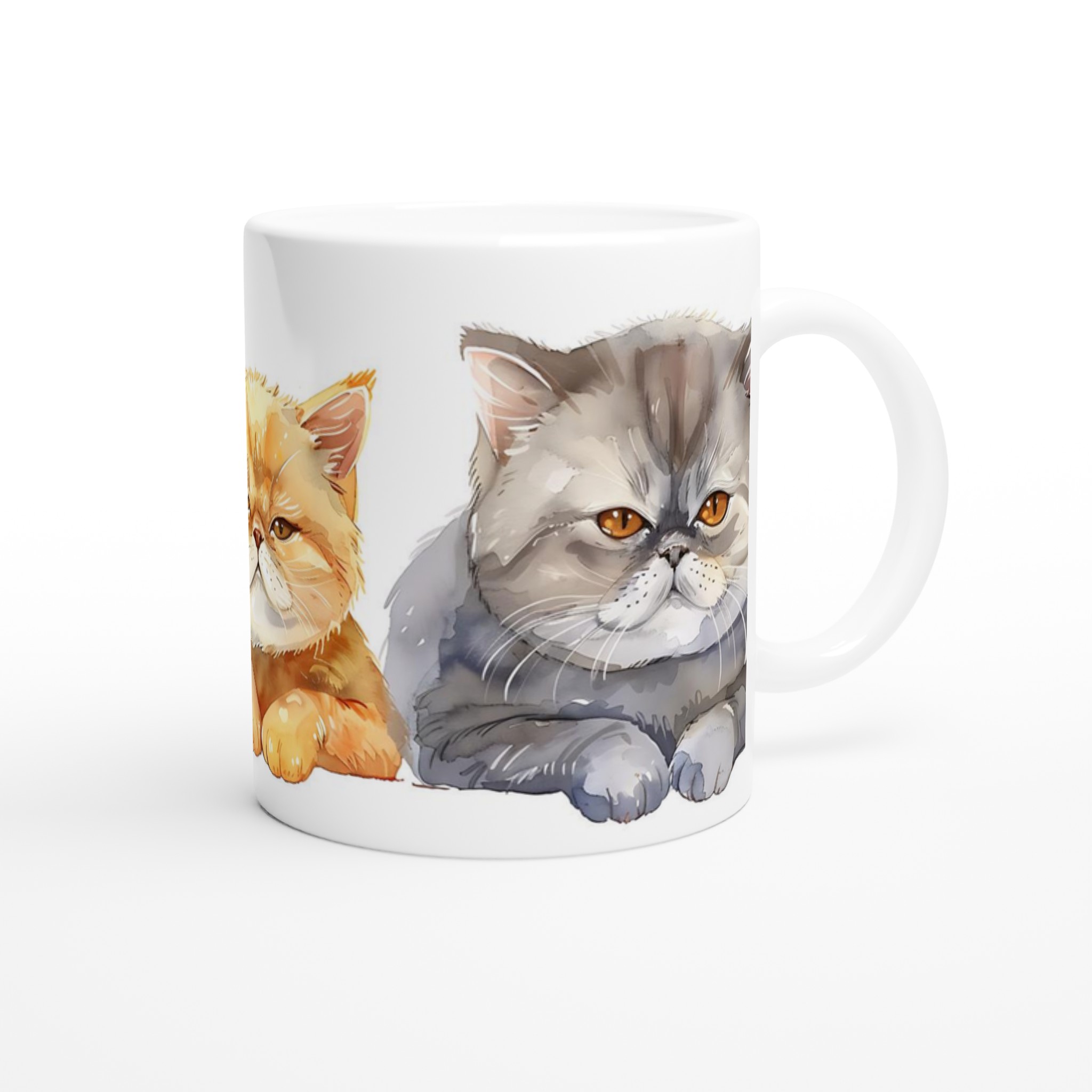 Fånga charmen med våra oemotståndliga akvarellkatter på din nya favoritkopp! Denna stilrena keramiska mugg blir snabbt en vardagsfavorit, perfekt för att lysa upp din morgon med kaffe, värma upp kvällen med varm choklad, eller för att njuta av en mysig kopp te. Varje kattillustration är tryckt med klara och levande färger på den blanka vita ytan, vilket framhäver deras lekfulla personligheter med en handmålad känsla. Och oroa dig inte för att charmen ska försvinna – trycket håller sig lika fint även efter otaliga turer i mikron och diskmaskinen.