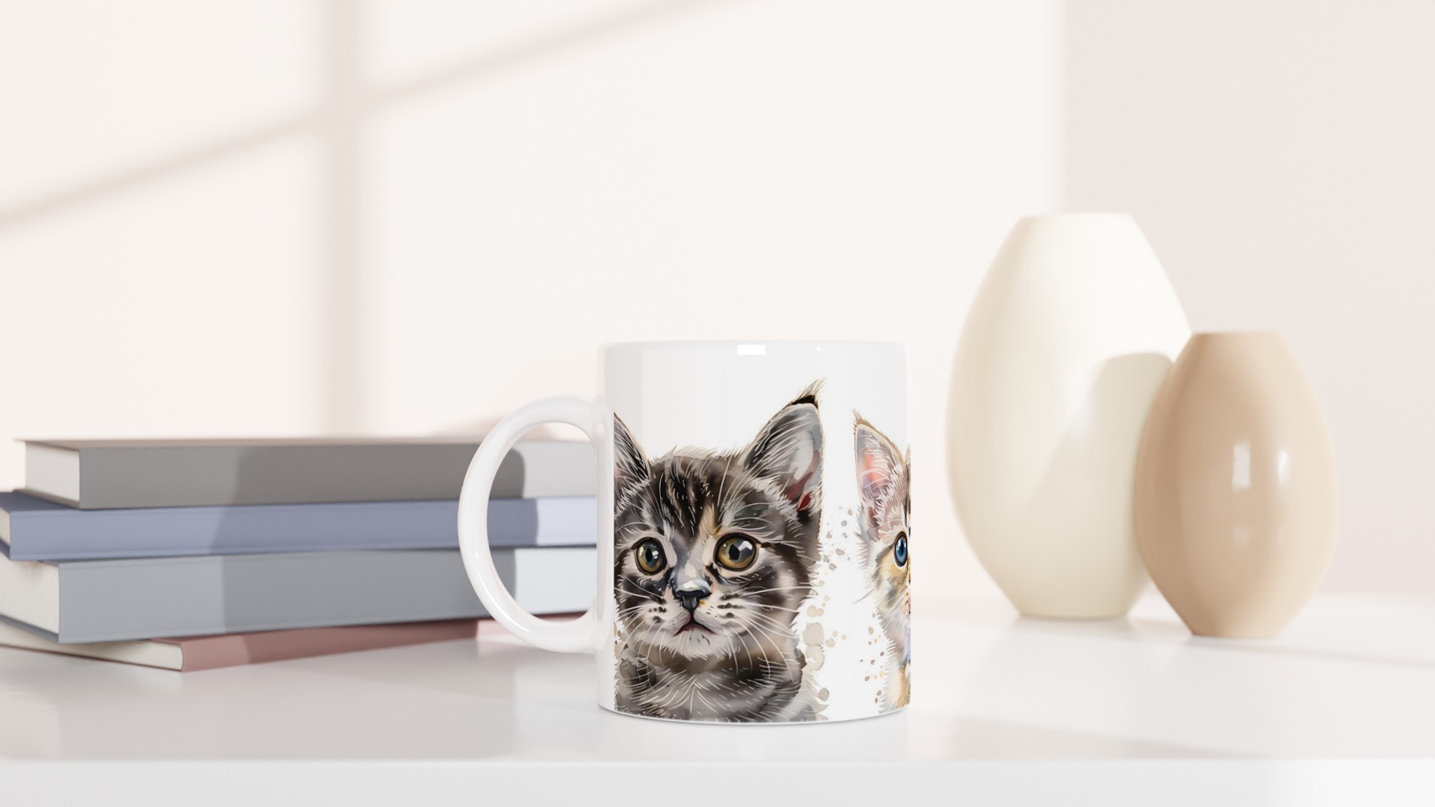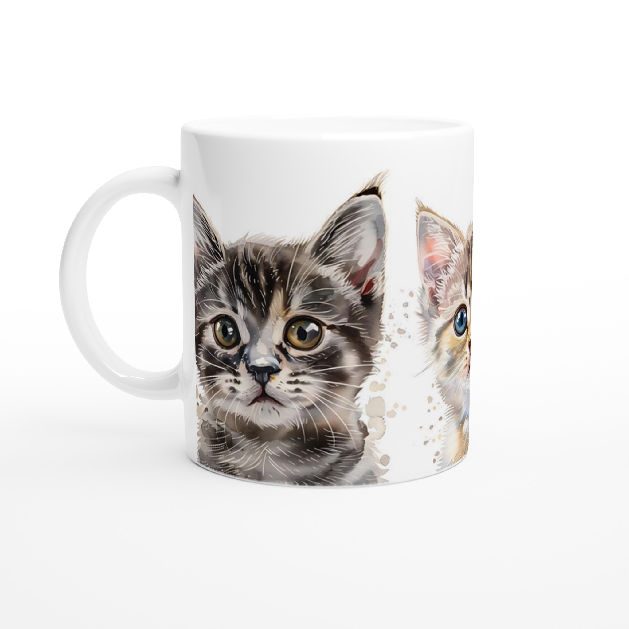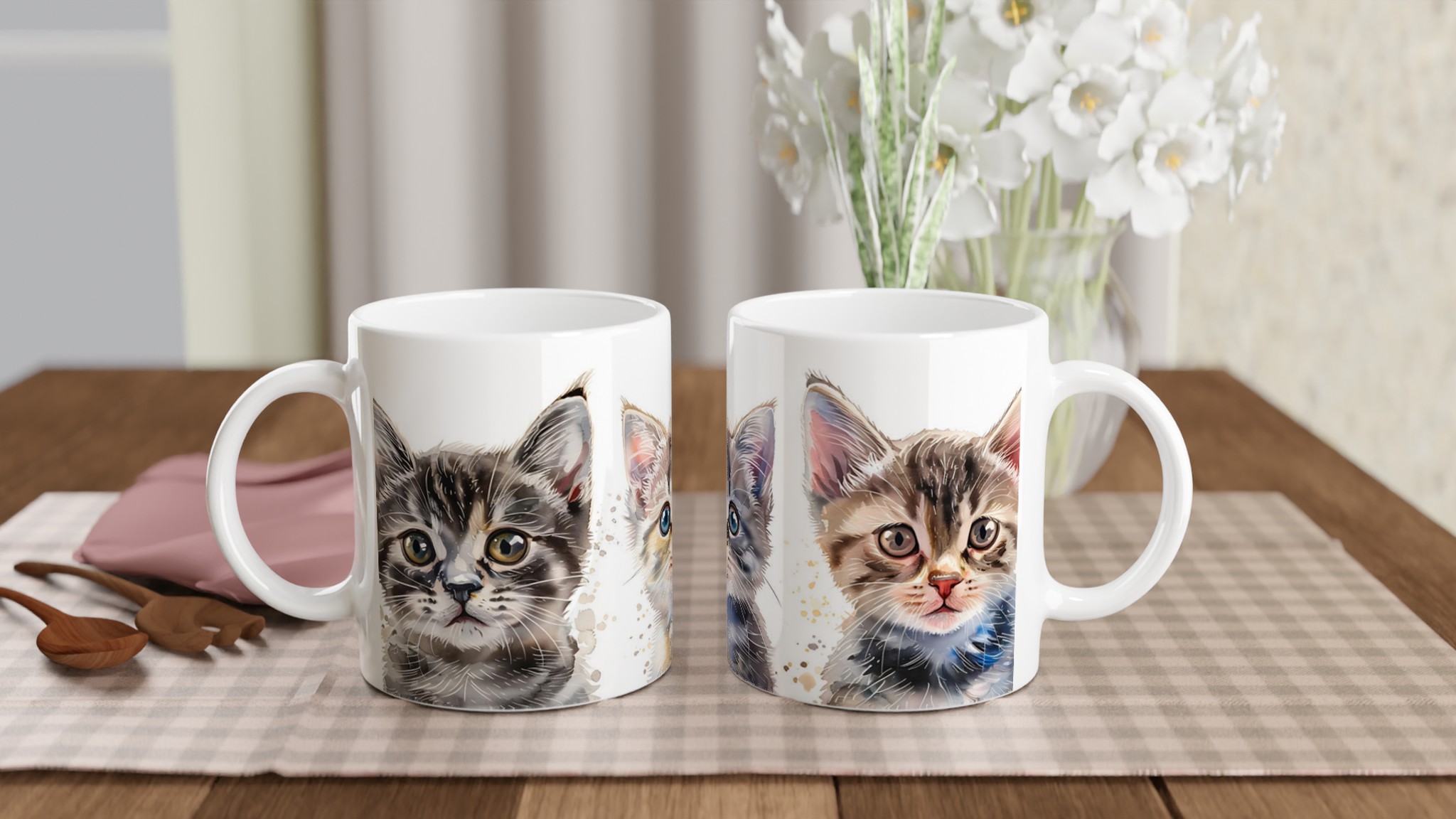 Starta dagen med ett leende med denna bedårande keramiska mugg, prydd med charmerande akvarellkattungar! De mjuka penseldragen och de uttrycksfulla ögonen ger varje kattunge en unik personlighet som kommer att smälta ditt hjärta. Den här stilrena muggen blir snabbt en vardagsfavorit, perfekt för morgonkaffet, kvällens varma choklad eller när du bara vill njuta av en kopp te. Den blanka vita ytan gör att trycken framhävs med klara och levande färger, som håller sig fina även efter många turer i mikron och diskmaskinen.