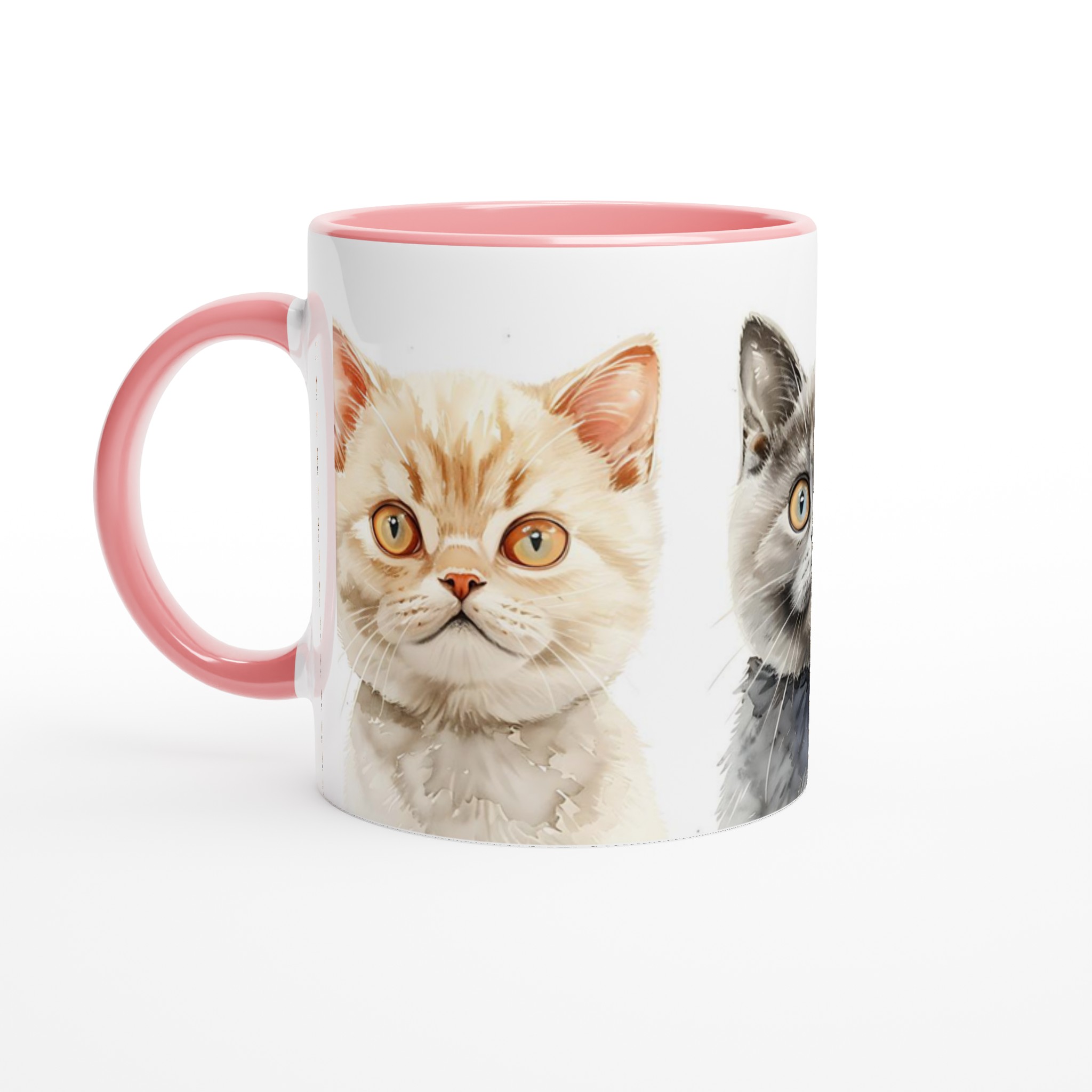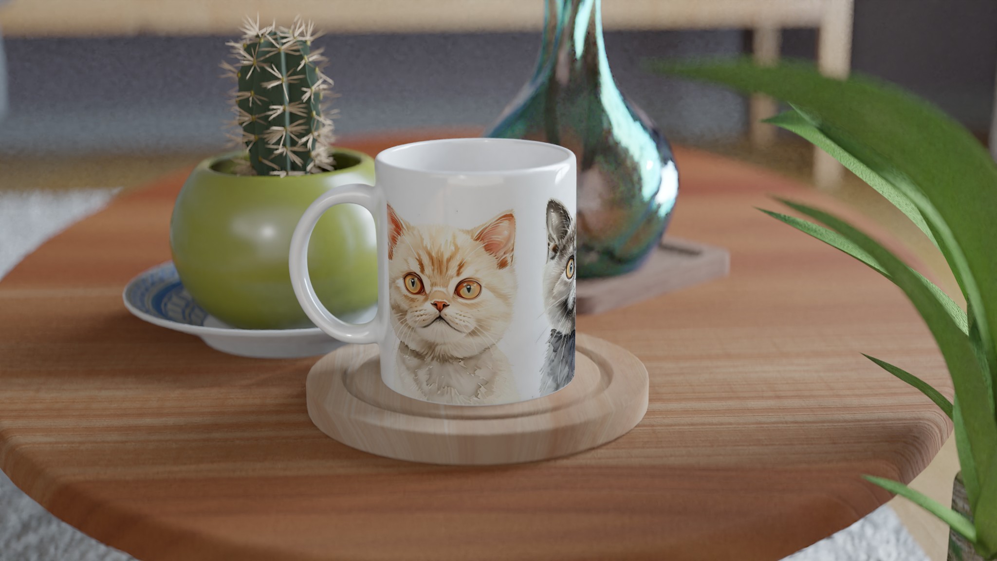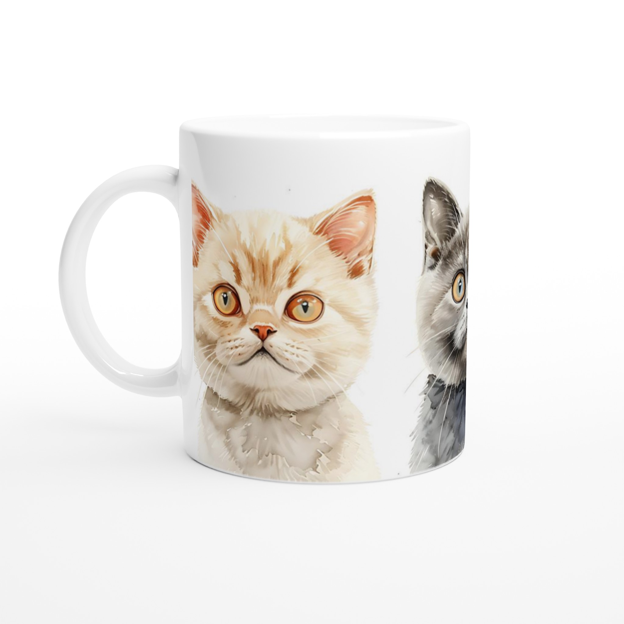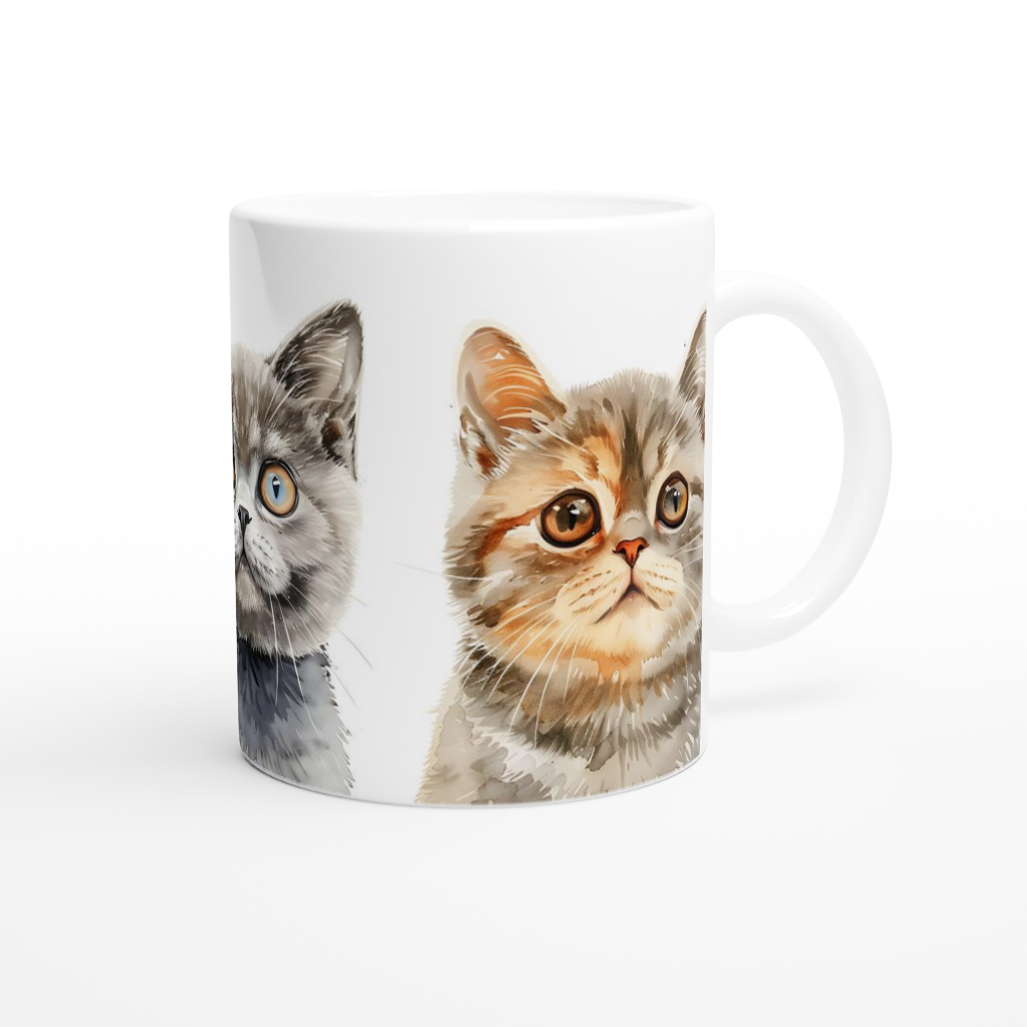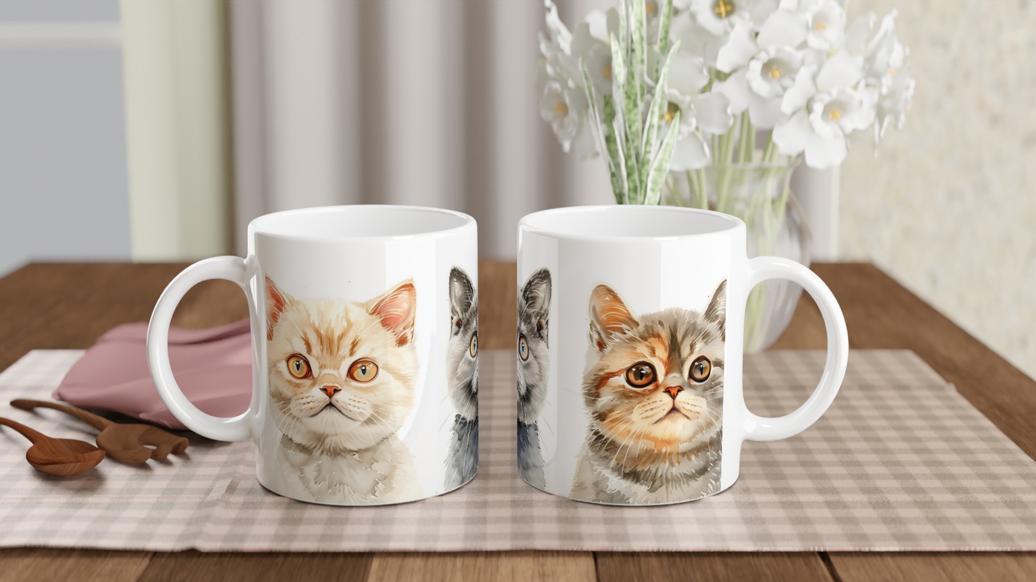 Förgyll din dag med en touch av oemotståndlig charm! Denna stilrena keramiska mugg, prydd med en lekfull akvarellkonst av bedårande kattungar, blir snabbt en vardagsfavorit. Perfekt för morgonkaffet, kvällens varma choklad eller när du bara vill njuta av en kopp te i sällskap av söta små vänner. Den blanka vita ytan gör att trycken framhävs med klara och levande färger, som håller sig fina även efter många turer i mikron och diskmaskinen.