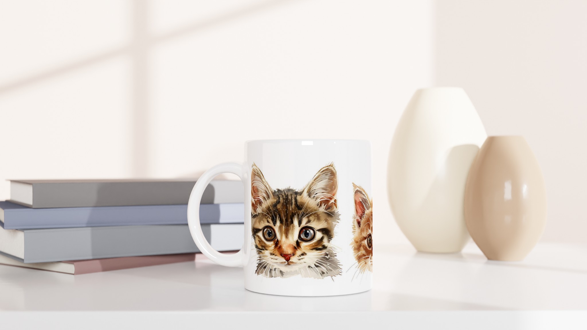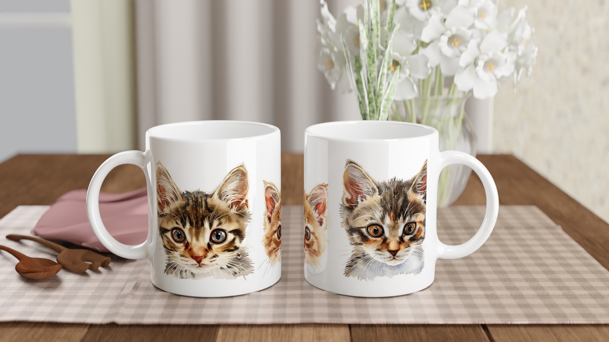 Lys upp din dag med vår charmiga keramiska mugg, prydd med bedårande akvarellmålade kattungar. Varje klunk blir en liten stund av glädje, oavsett om det är till morgonkaffet, en lugnande kvällschoklad eller ditt favorit te. Denna mugg är inte bara en vardagsfavorit utan också en konstnärlig touch till ditt kök, där de söta kattungemotiven framhävs med klara och levande färger på den blanka ytan.
