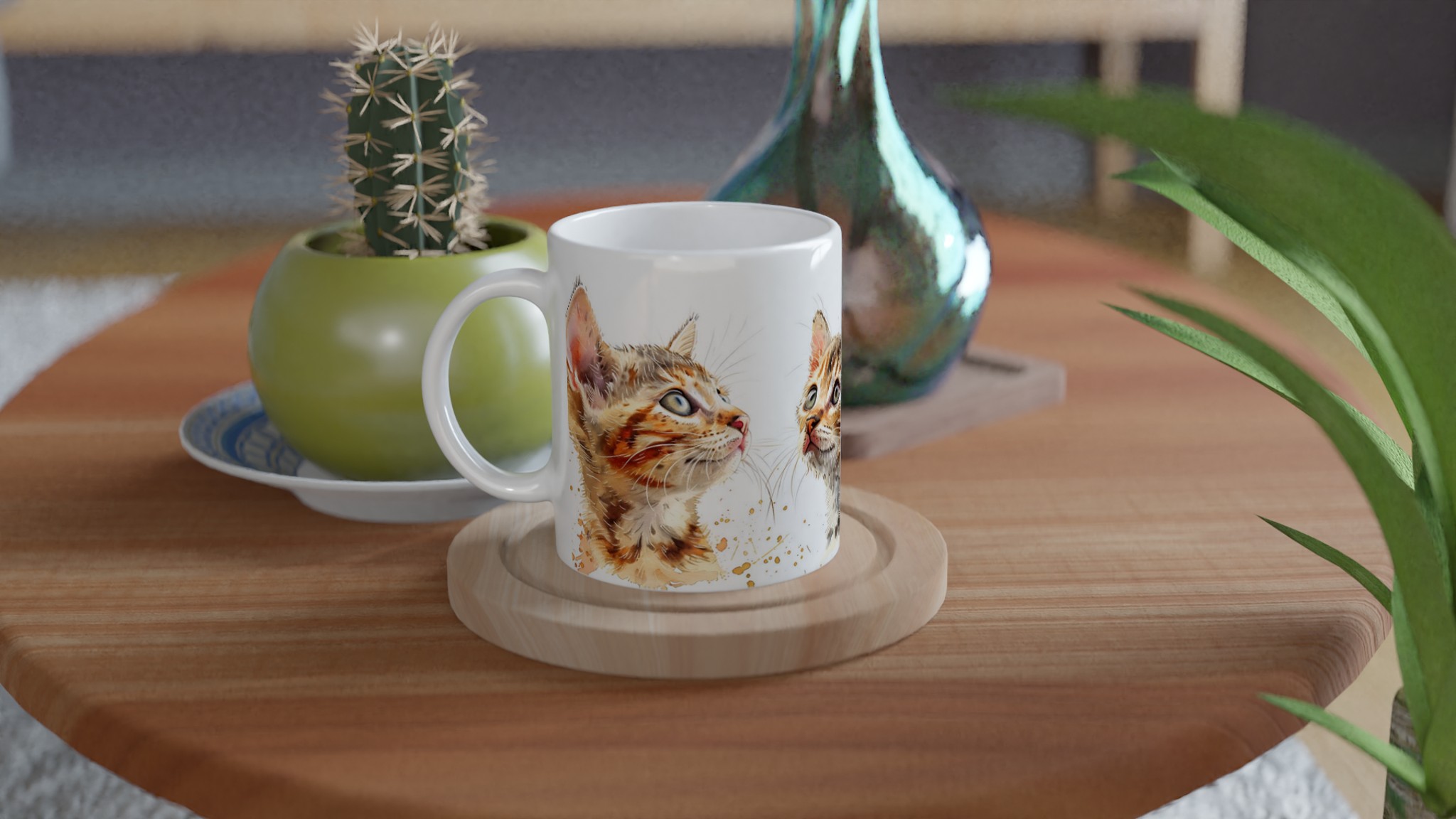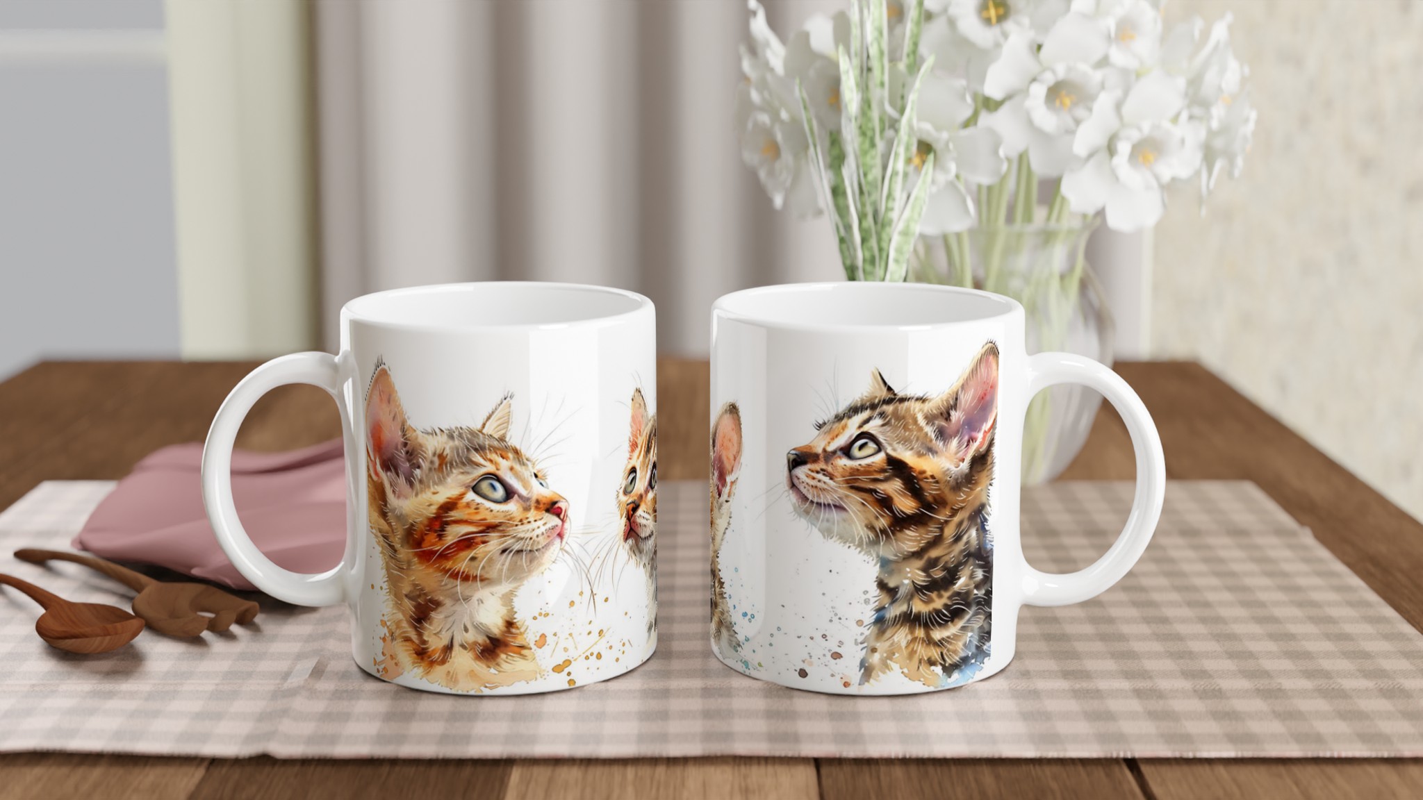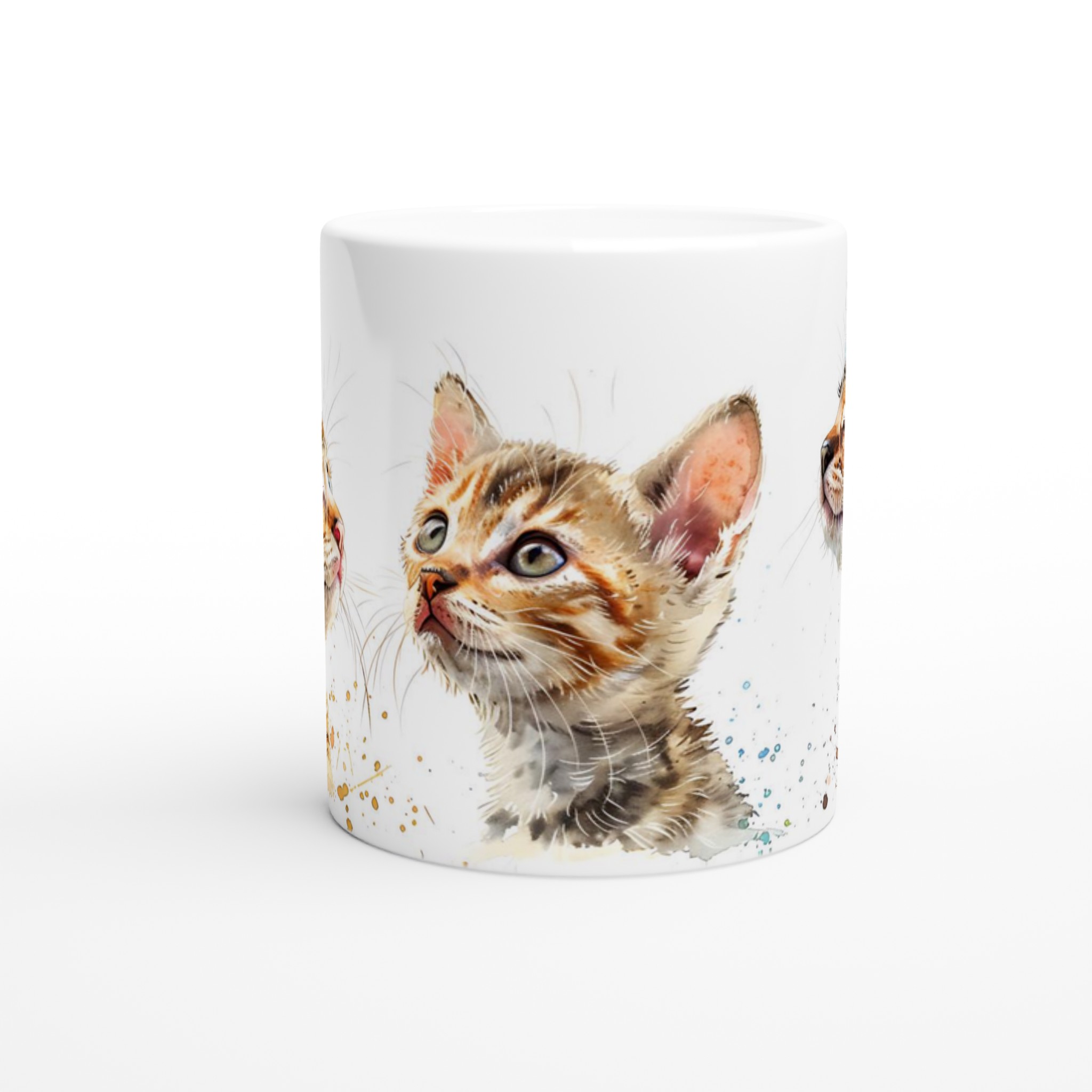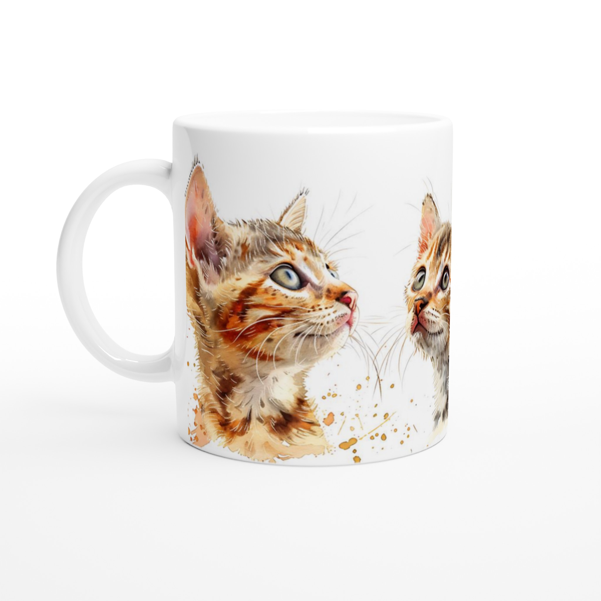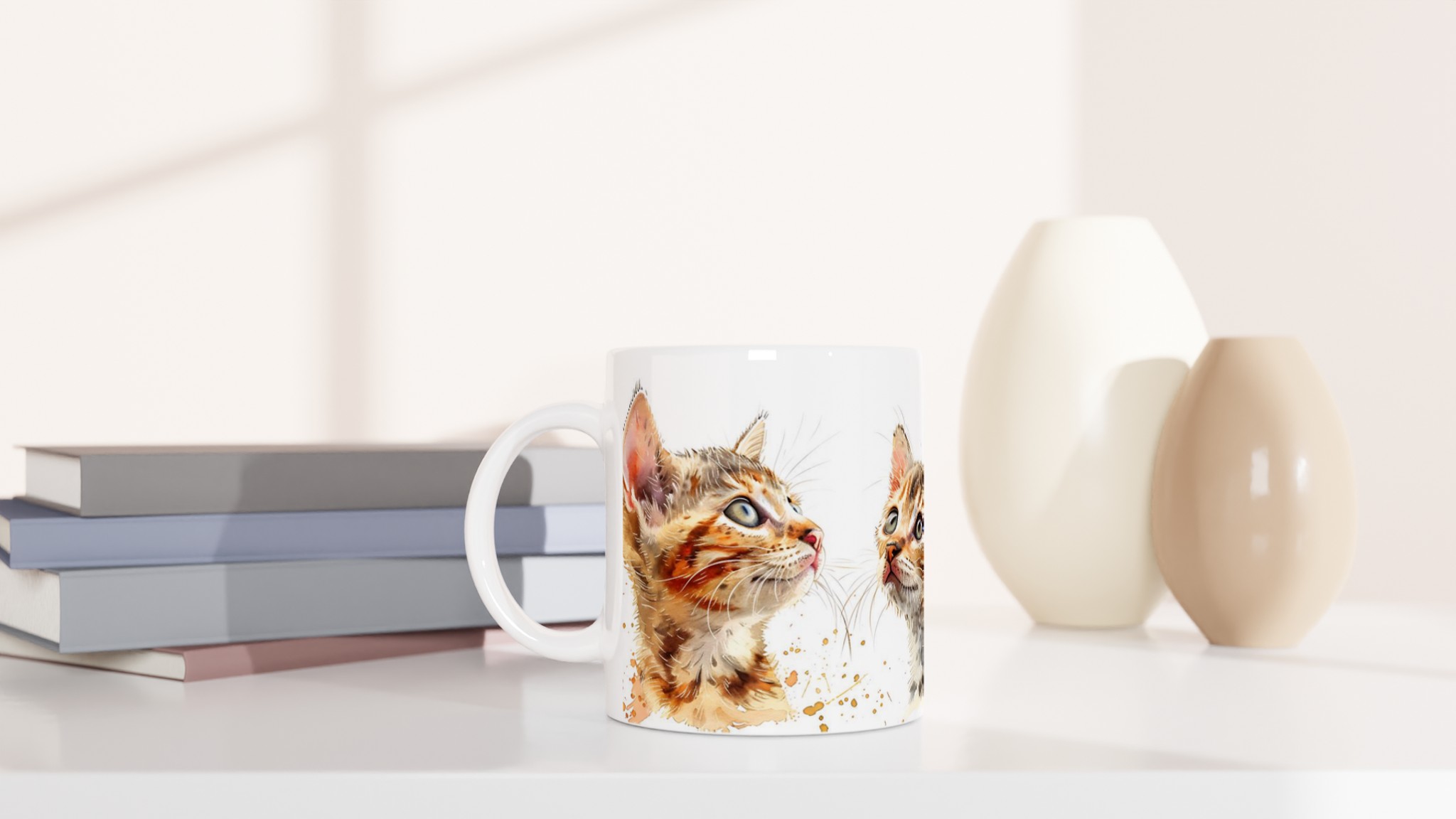 Fånga hjärtat hos varje kattälskare med denna bedårande keramiska mugg, prydd med tre lekfulla akvarellkattungar. Varje detalj, från de nyfikna ögonen till de mjuka pälsdetaljerna, är framhävd med levande färger och konstnärliga stänk, vilket ger en unik och charmig känsla. Denna mugg blir snabbt en vardagsfavorit, perfekt för morgonkaffet, kvällens varma choklad eller när du bara vill njuta av en kopp te.
