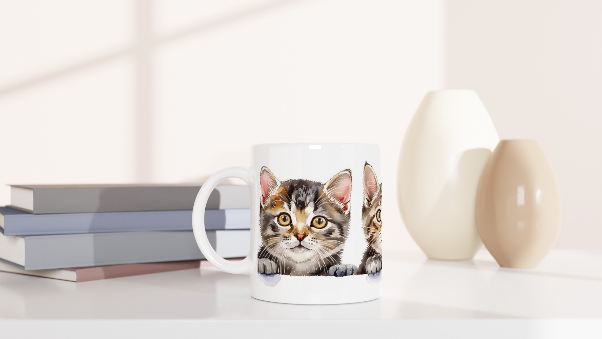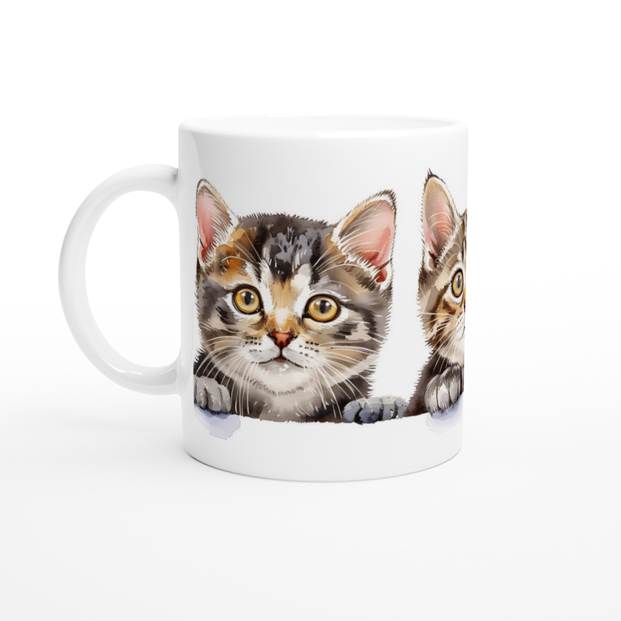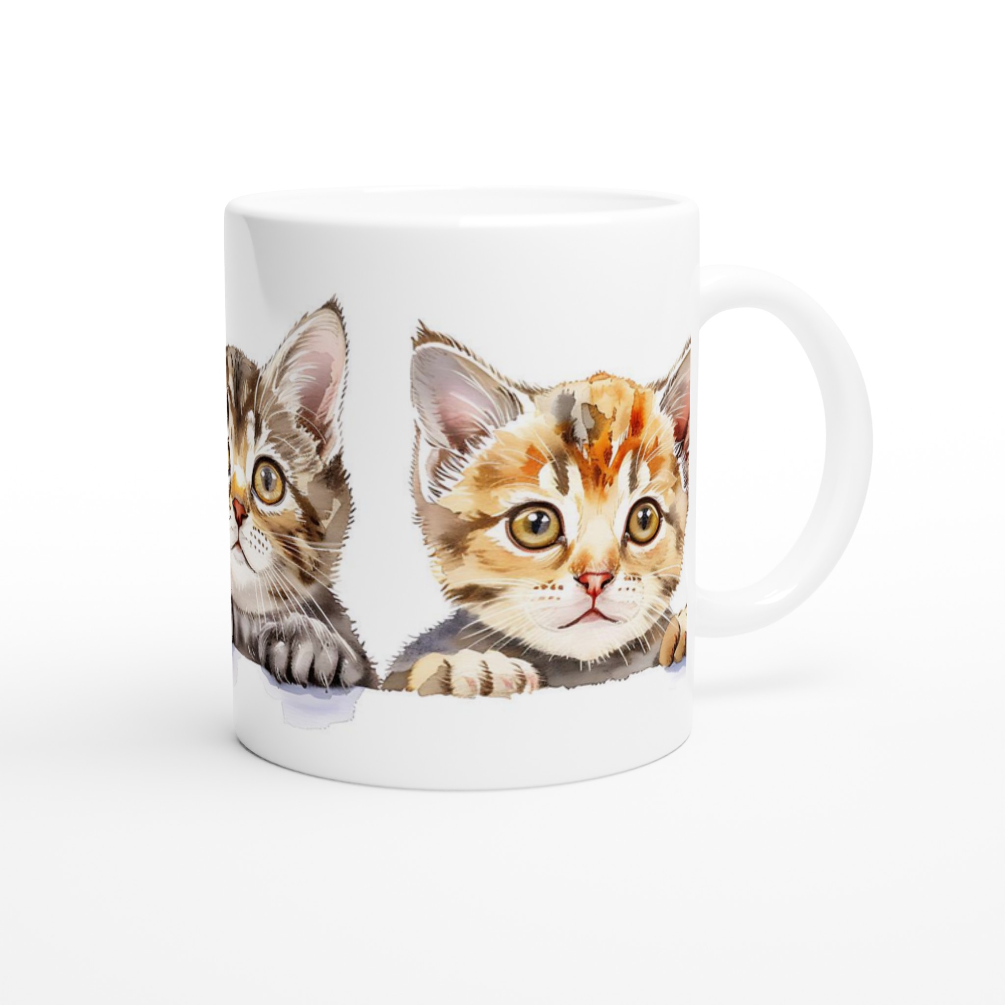 Låt dessa bedårande akvarellkattungar förgylla din fikastund! Denna charmiga keramiska mugg blir snabbt en vardagsfavorit, perfekt för morgonkaffet, kvällens varma choklad eller när du bara vill njuta av en kopp te. Med sitt hjärtevärmande motiv av nyfikna kattungar tillför den en dos glädje till varje klunk. Den blanka ytan framhäver de klara och levande färgerna i kattungarnas päls, som håller sig fina även efter många turer i mikron och diskmaskinen.