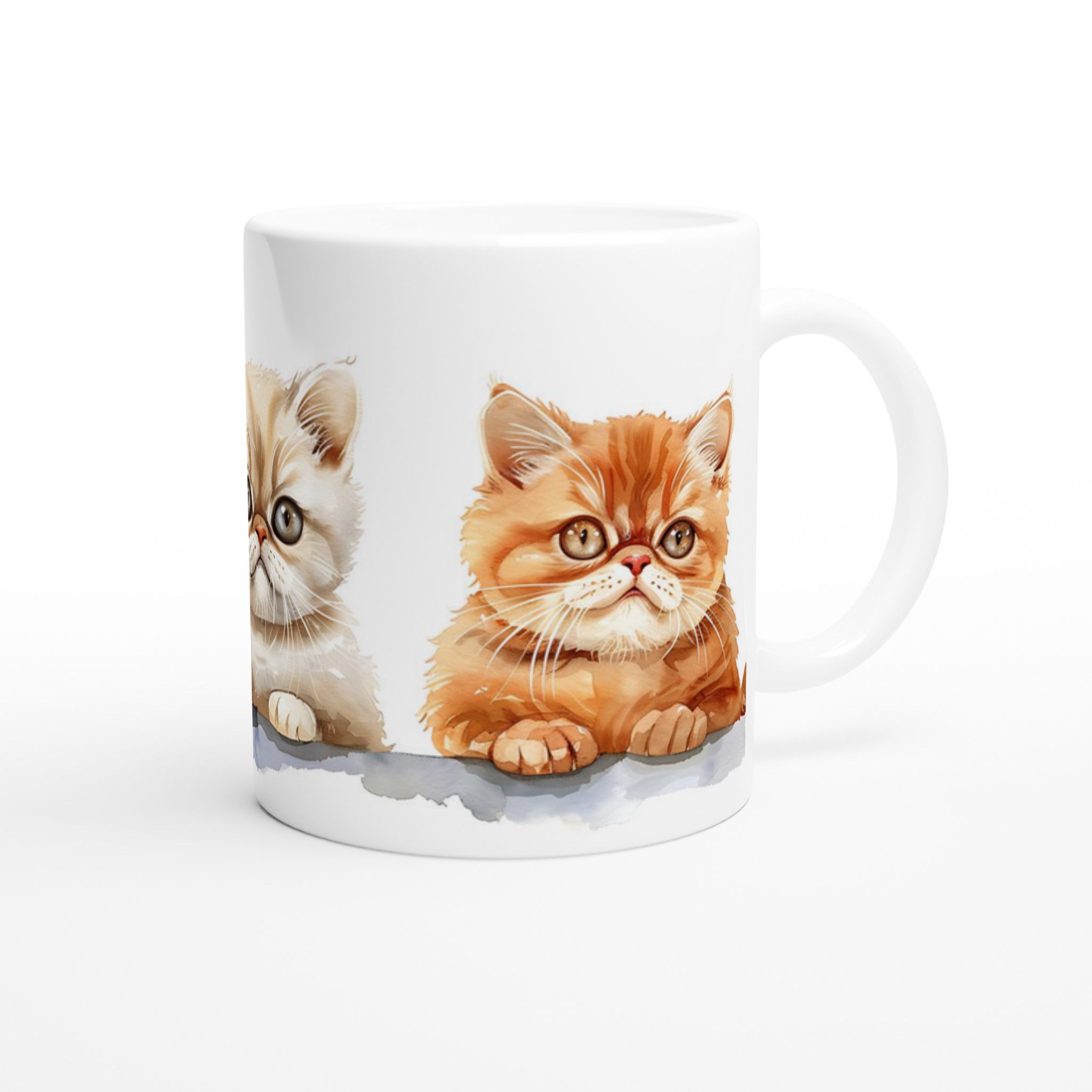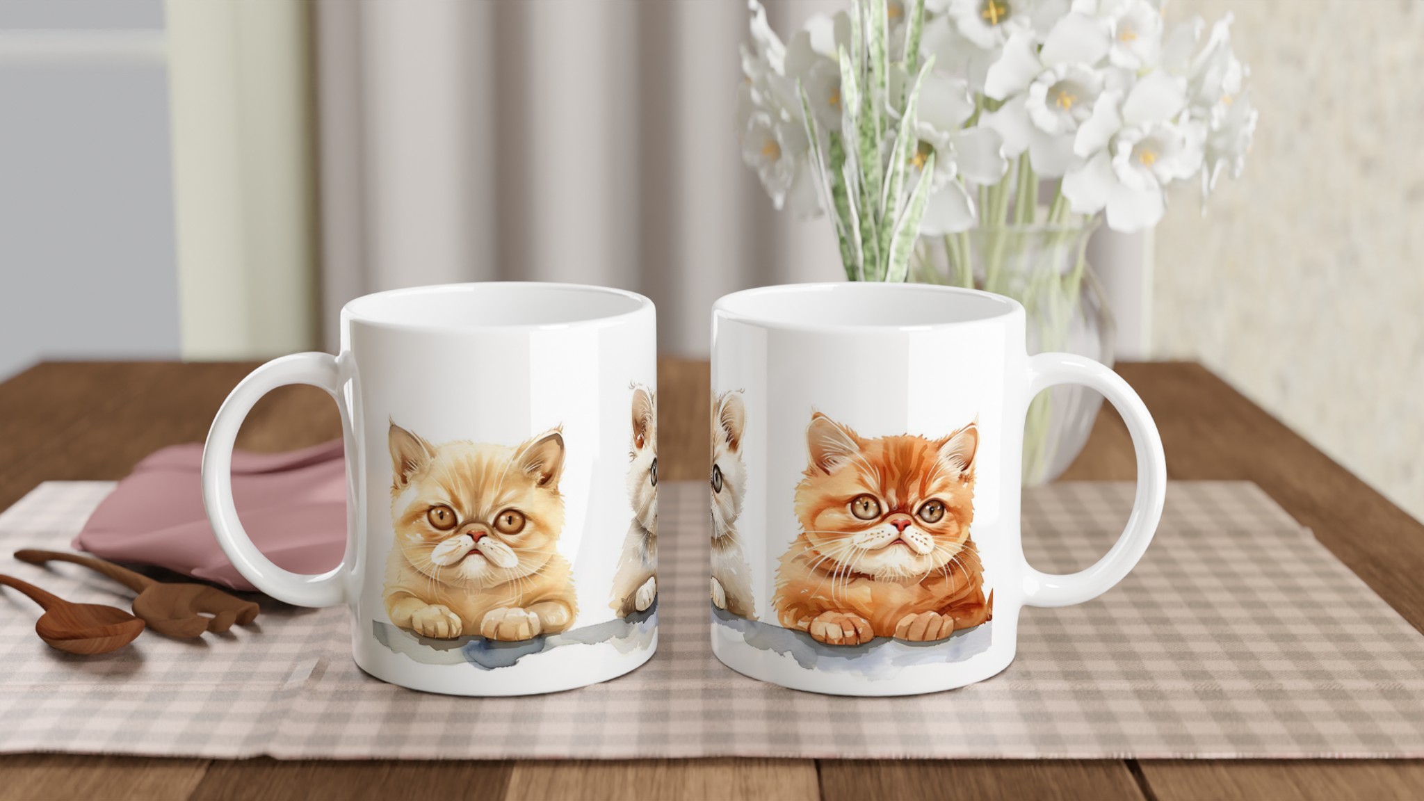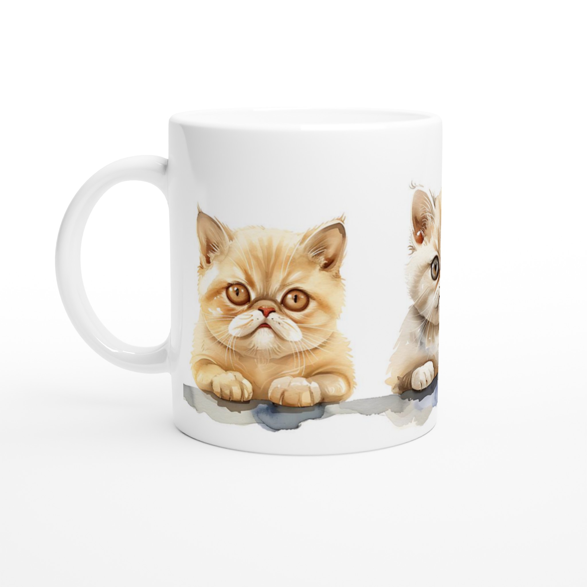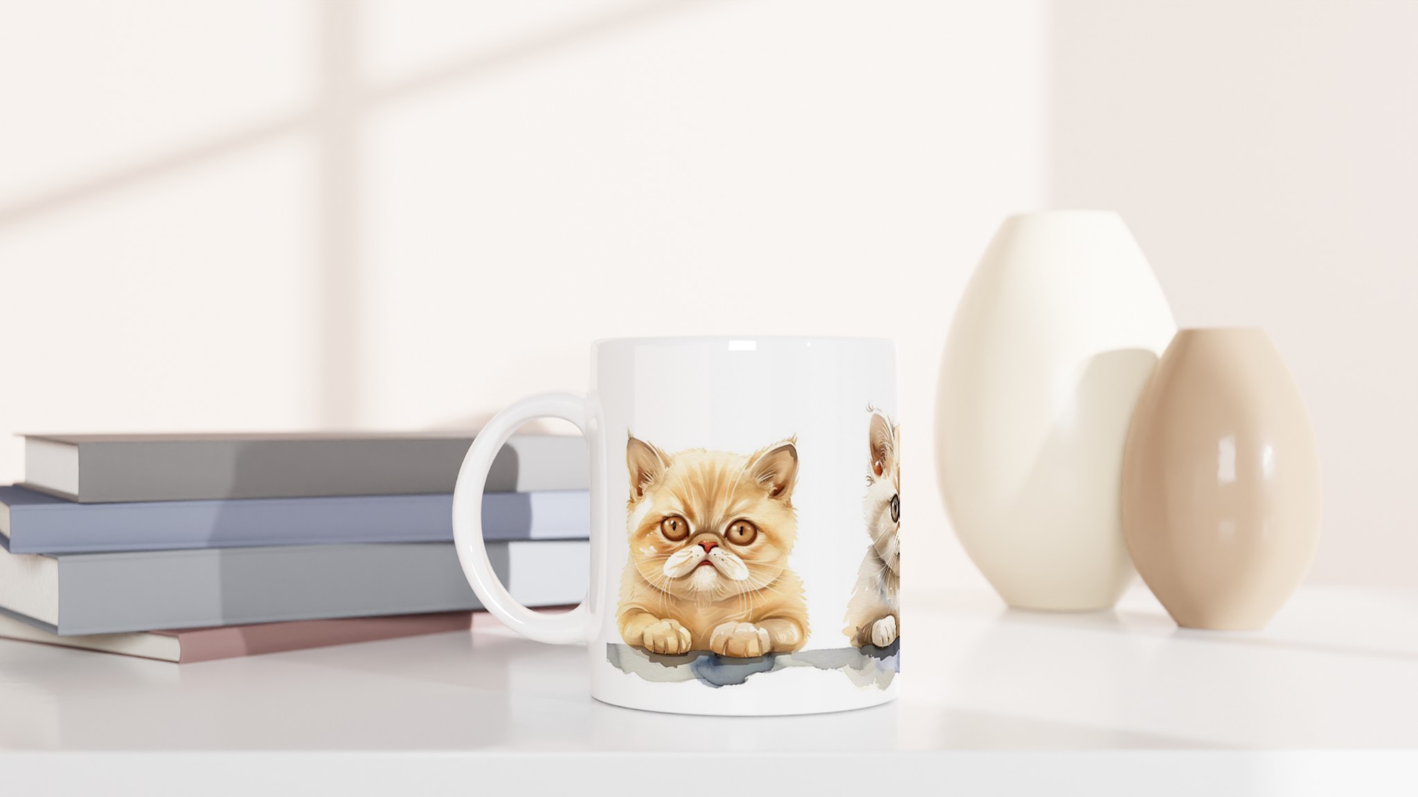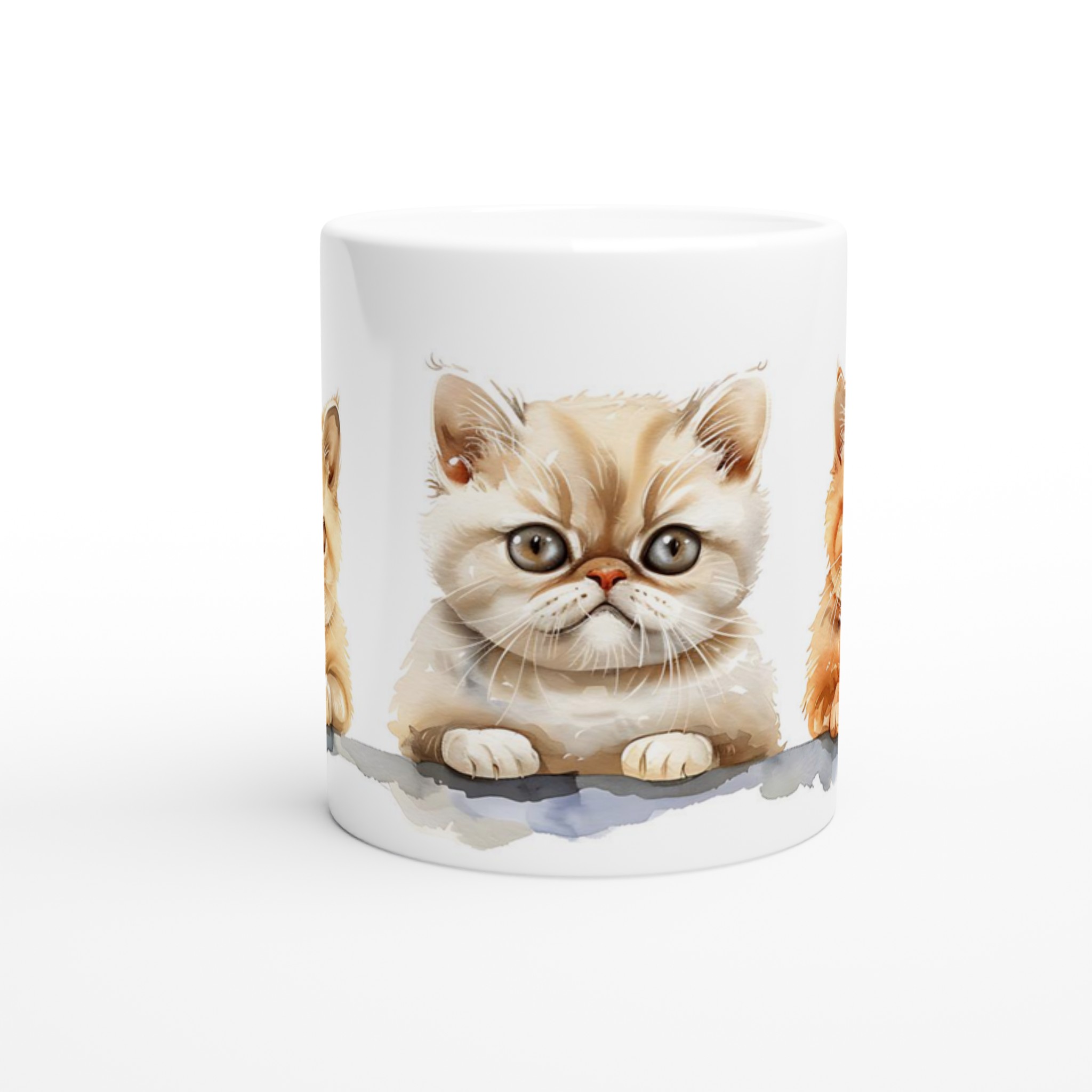Förgyll varje dryckesstund med denna oemotståndliga keramiska mugg, prydd med bedårande kattungeporträtt i en mjuk akvarellstil. Dessa charmiga små vänner, med sina uttrycksfulla ögon och lekfulla nyfikenhet, kommer garanterat att sprida glädje och värme till din dag. Perfekt för morgonkaffet, kvällens varma choklad eller när du bara vill njuta av en kopp te.