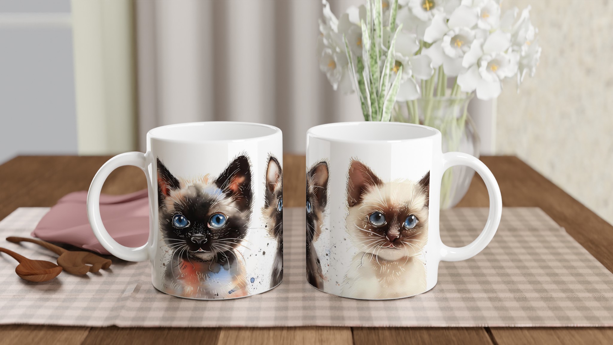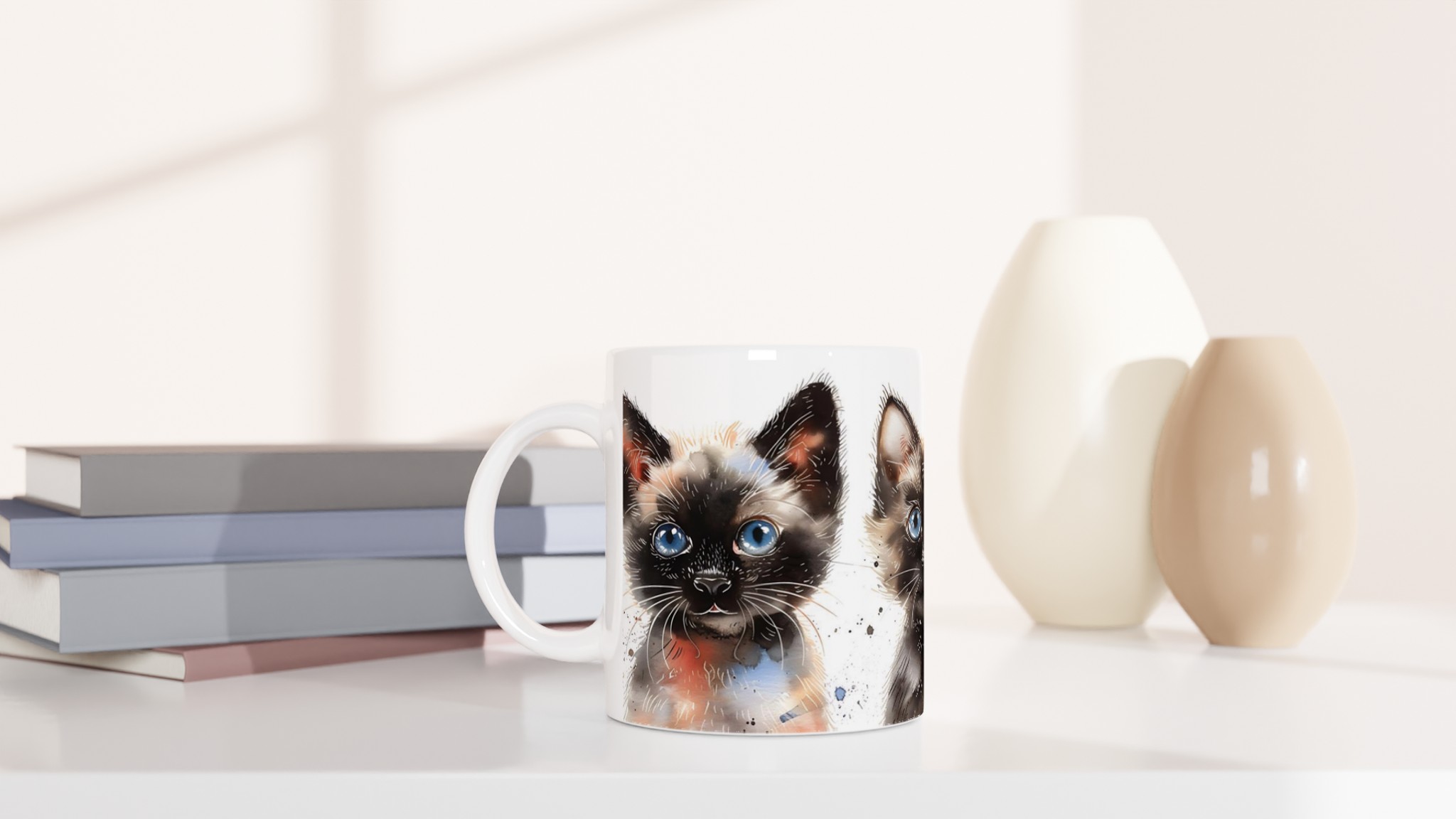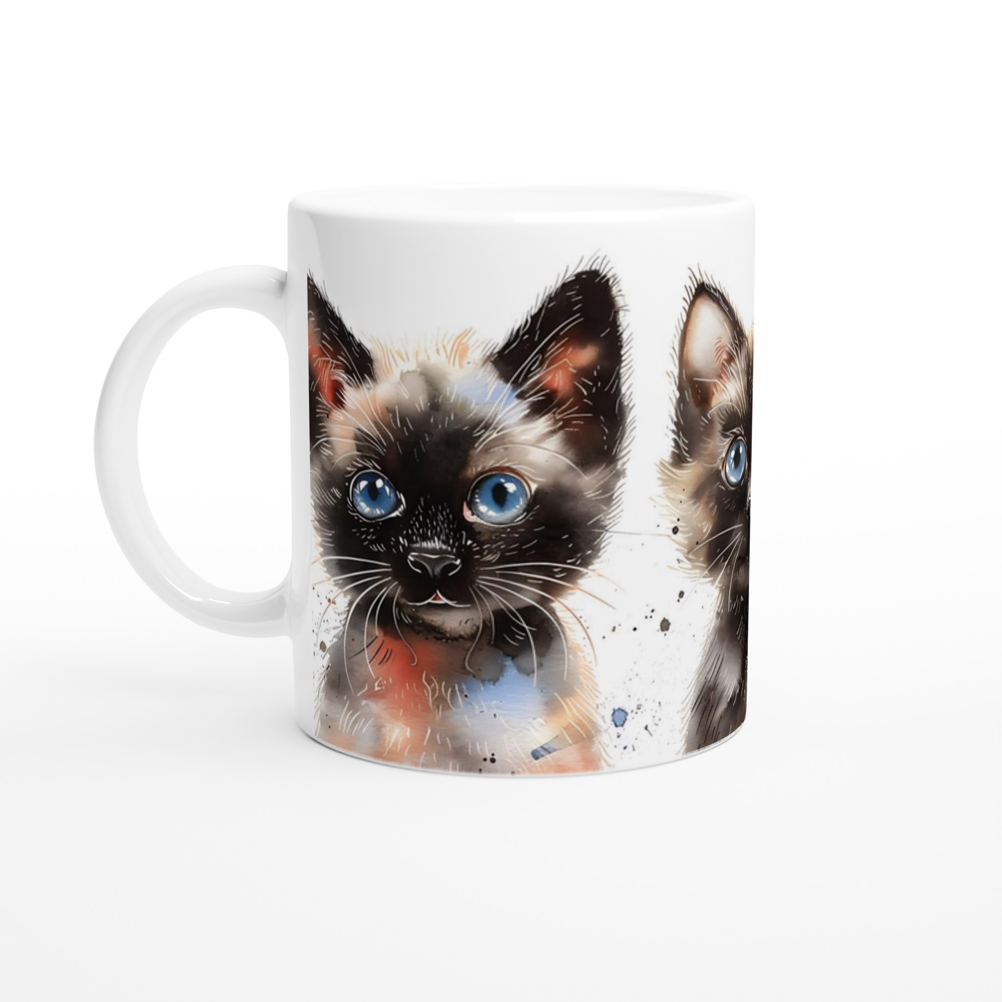 Fånga charmen hos dessa bedårande siameskattungar med en keramisk mugg som blir en omedelbar favorit. Med sina djupt blå ögon och lekfulla uttryck, handmålade i en akvarellinspirerad stil, är denna mugg en hyllning till våra fyrbenta vänner. Perfekt för morgonkaffet, kvällens varma choklad eller när du bara vill njuta av en kopp te i sällskap av dessa söta ansikten.
