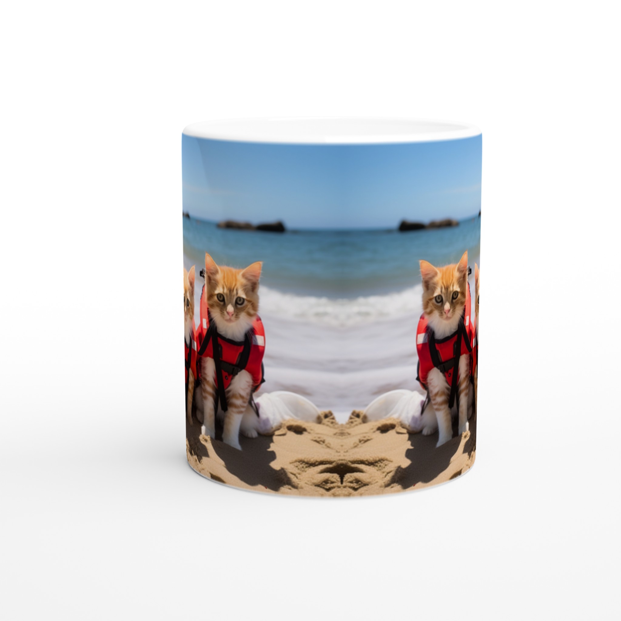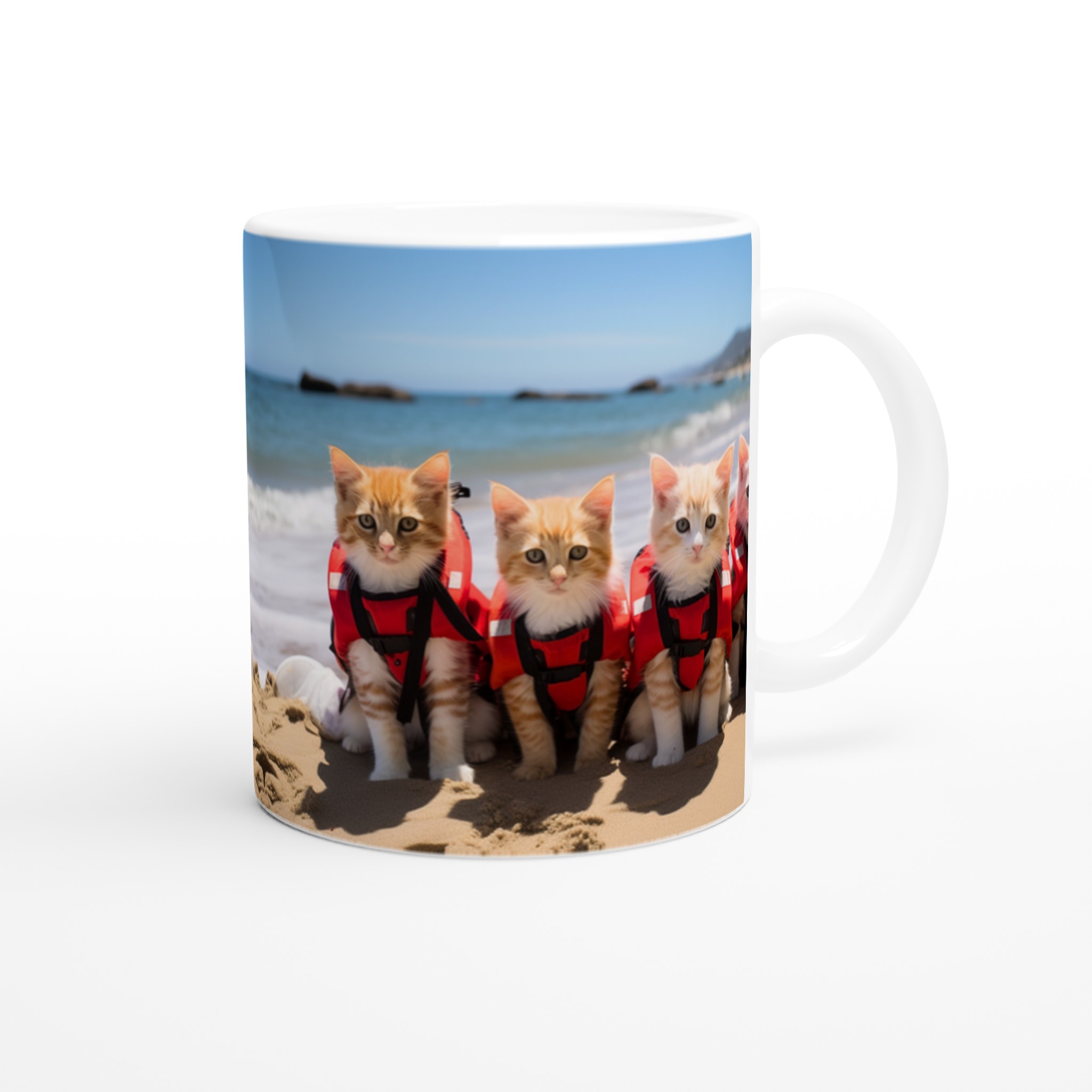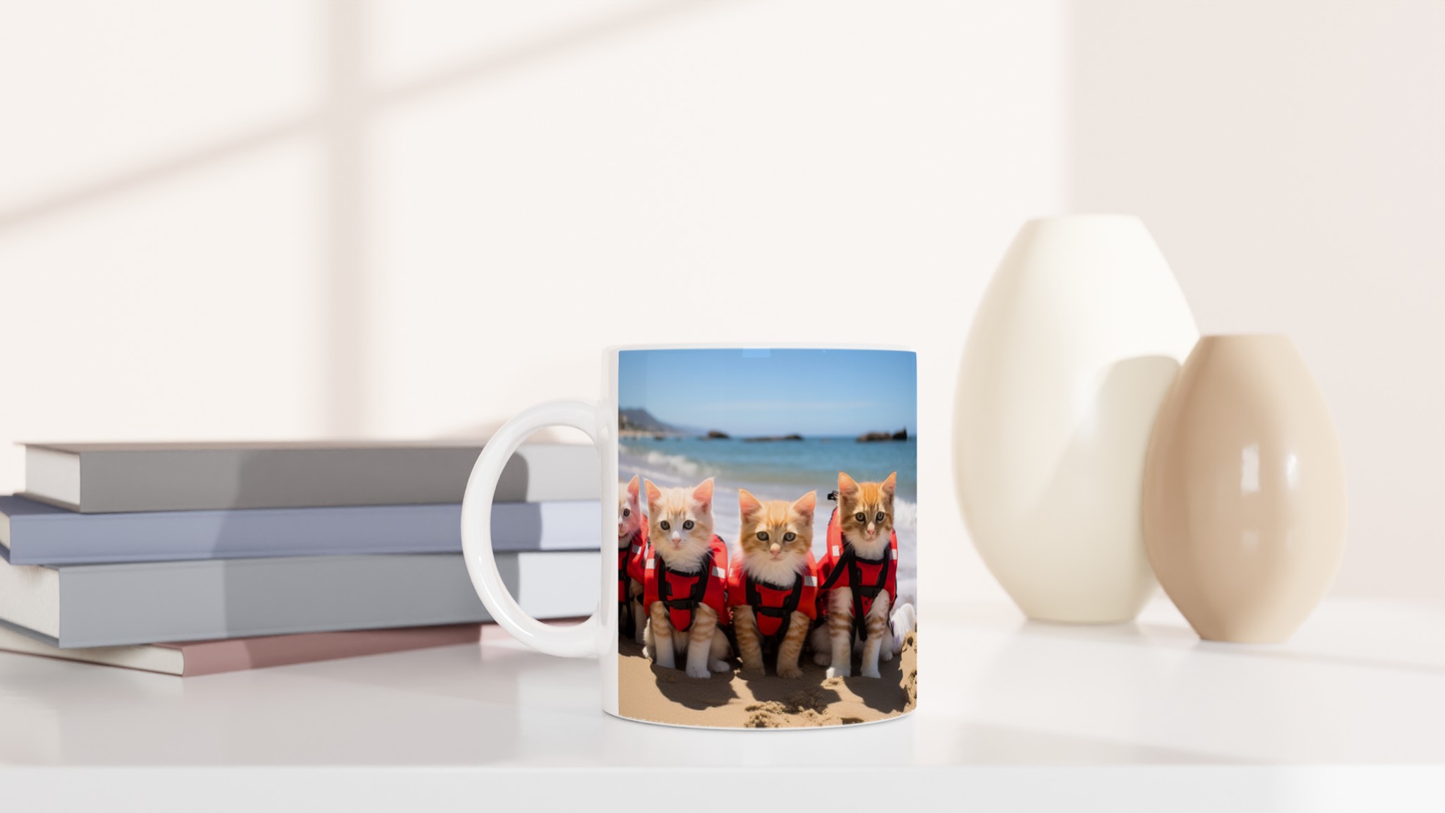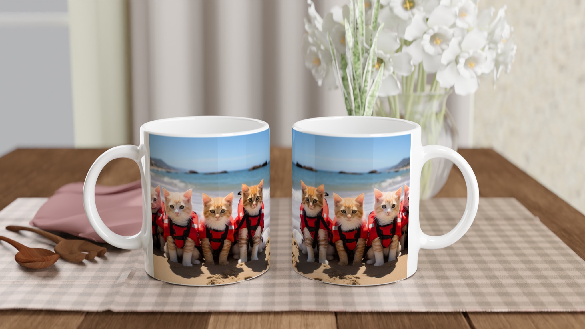 Föreställ dig att starta dagen med ett leende, tack vare en mugg fylld med ren glädje! Denna keramiska mugg fångar hjärtat med sin charmiga design, där oemotståndliga kattungar i röda flytvästar solar sig på en solig strand. Den är en perfekt hyllning till djurälskare och den avkopplande känslan av en dag vid havet, vilket gör varje klunk till en liten semester.