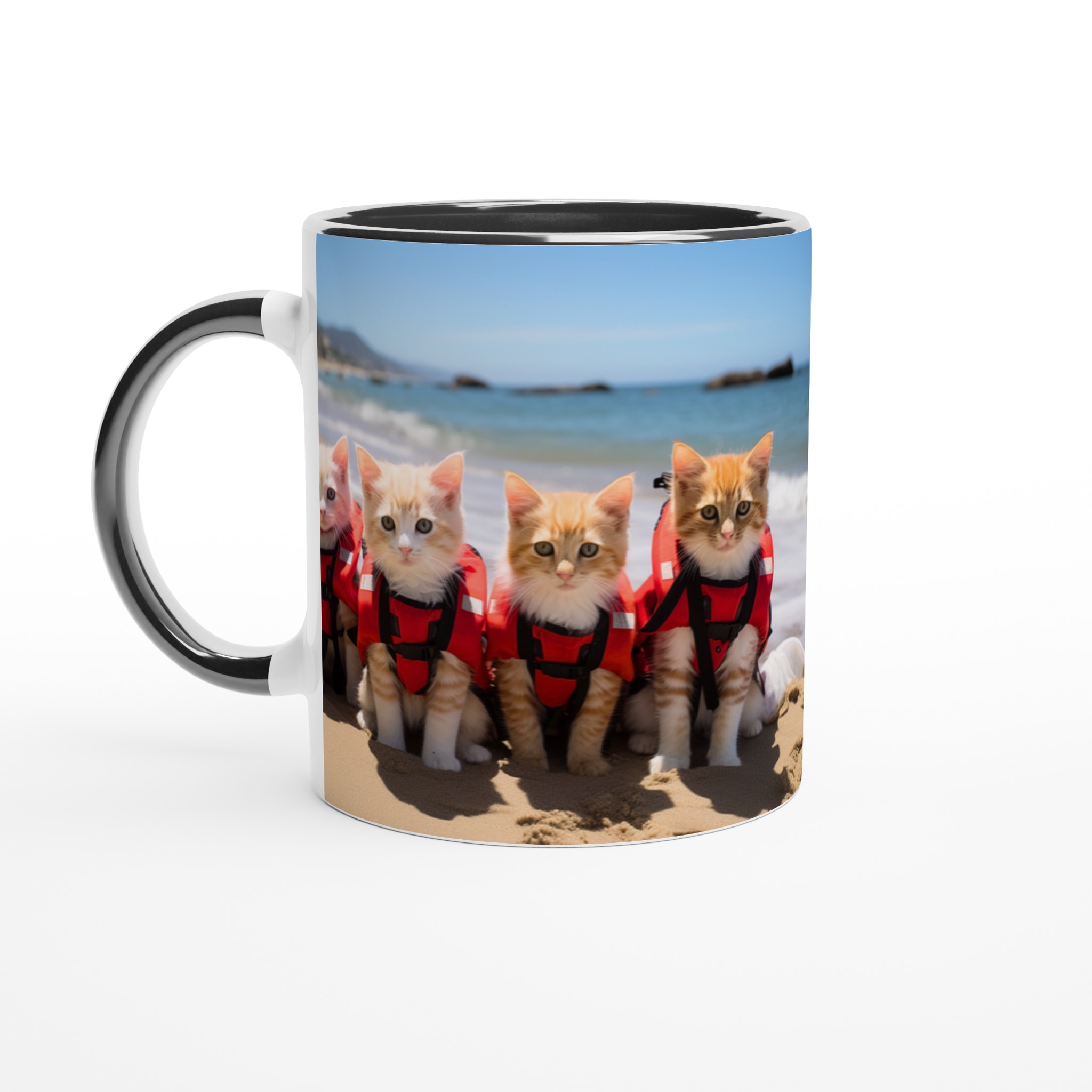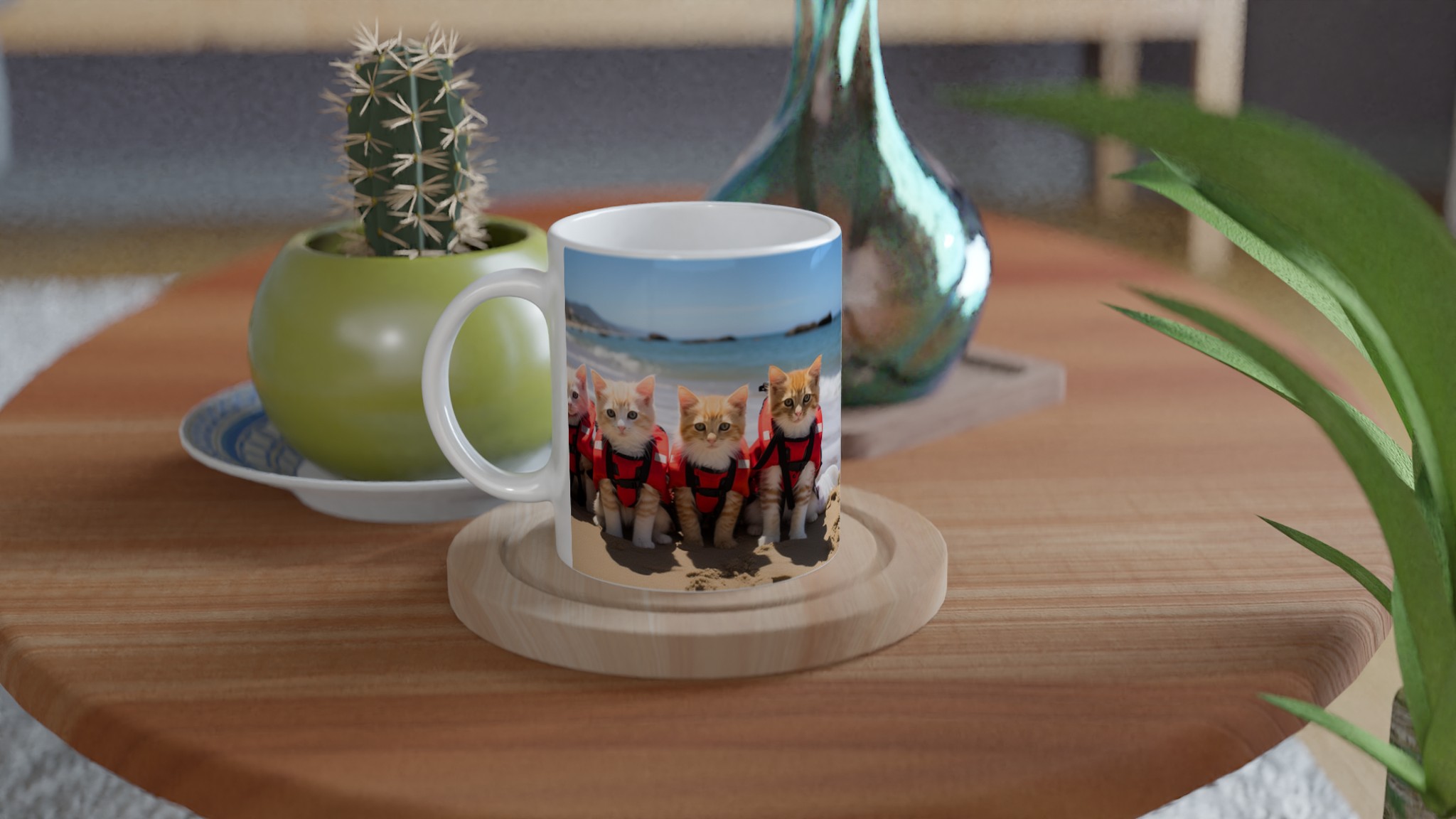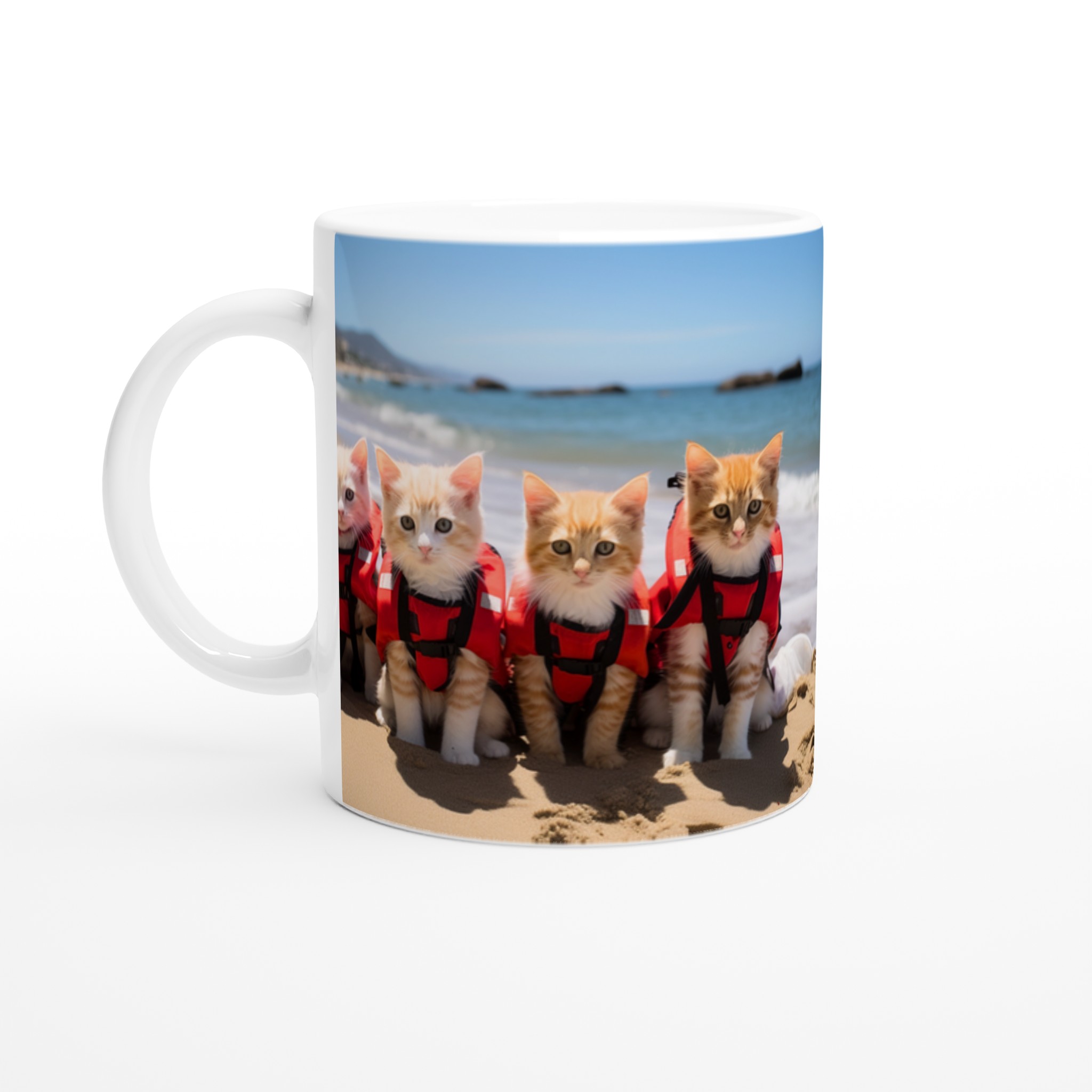 Föreställ dig att starta dagen med ett leende, tack vare en mugg fylld med ren glädje! Denna keramiska mugg fångar hjärtat med sin charmiga design, där oemotståndliga kattungar i röda flytvästar solar sig på en solig strand. Den är en perfekt hyllning till djurälskare och den avkopplande känslan av en dag vid havet, vilket gör varje klunk till en liten semester.