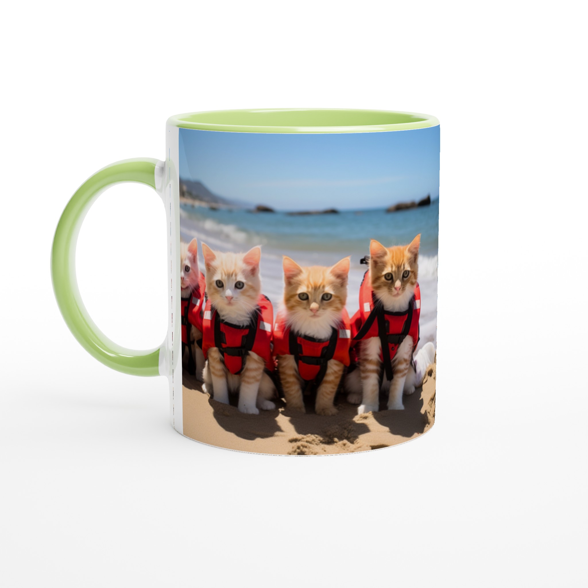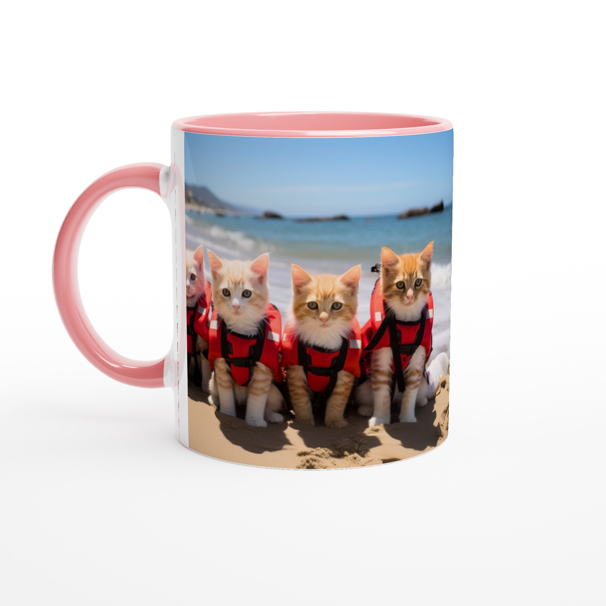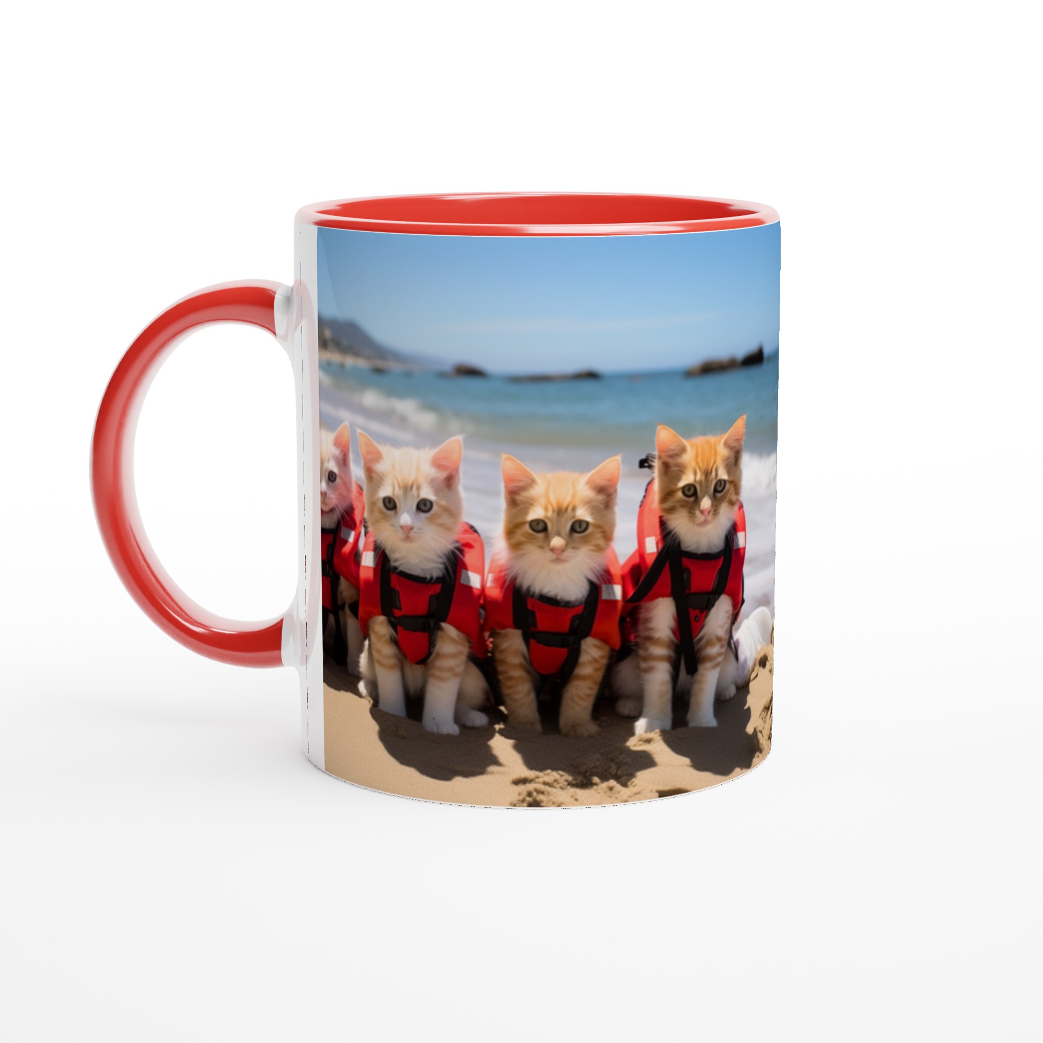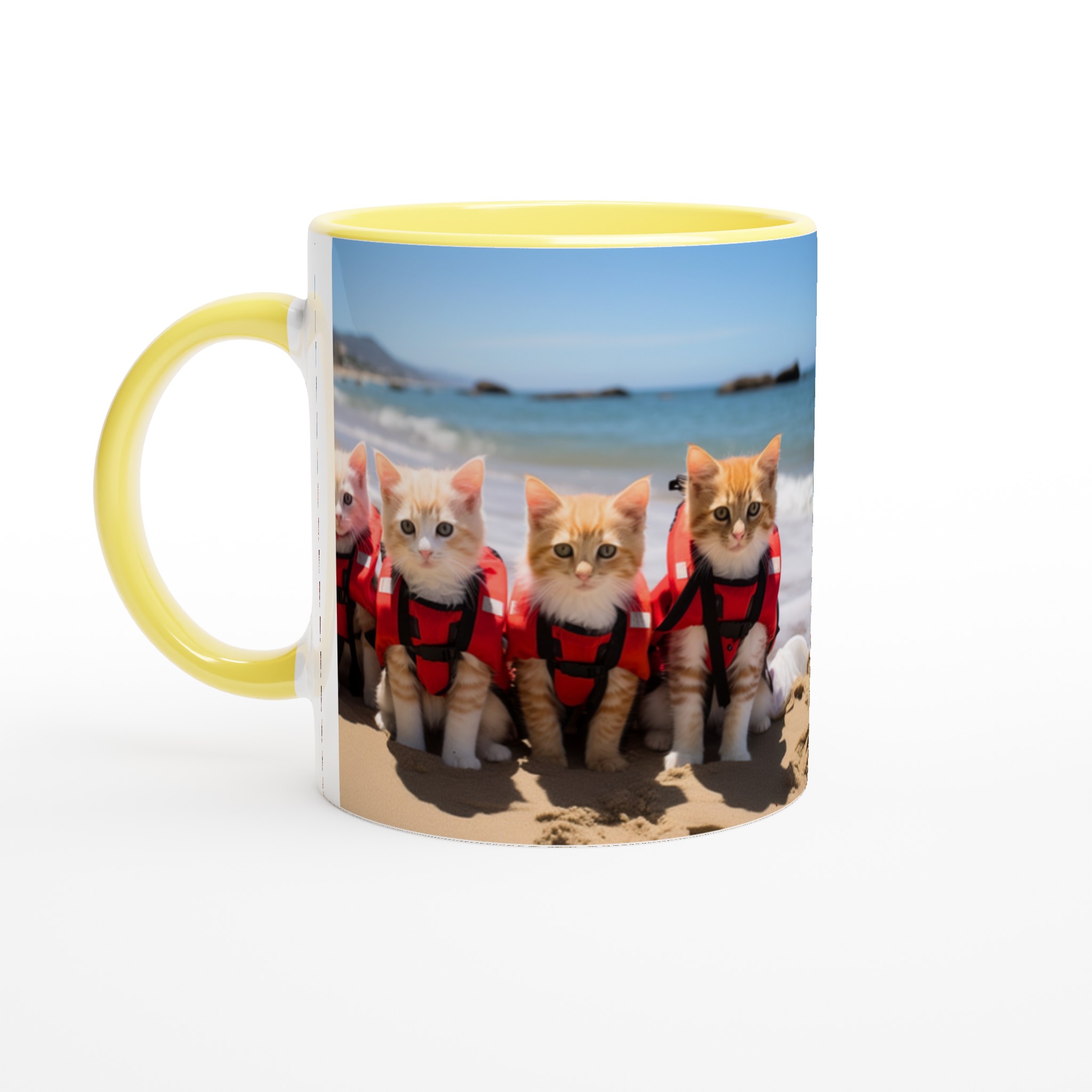 Föreställ dig att starta dagen med ett leende, tack vare en mugg fylld med ren glädje! Denna keramiska mugg fångar hjärtat med sin charmiga design, där oemotståndliga kattungar i röda flytvästar solar sig på en solig strand. Den är en perfekt hyllning till djurälskare och den avkopplande känslan av en dag vid havet, vilket gör varje klunk till en liten semester.