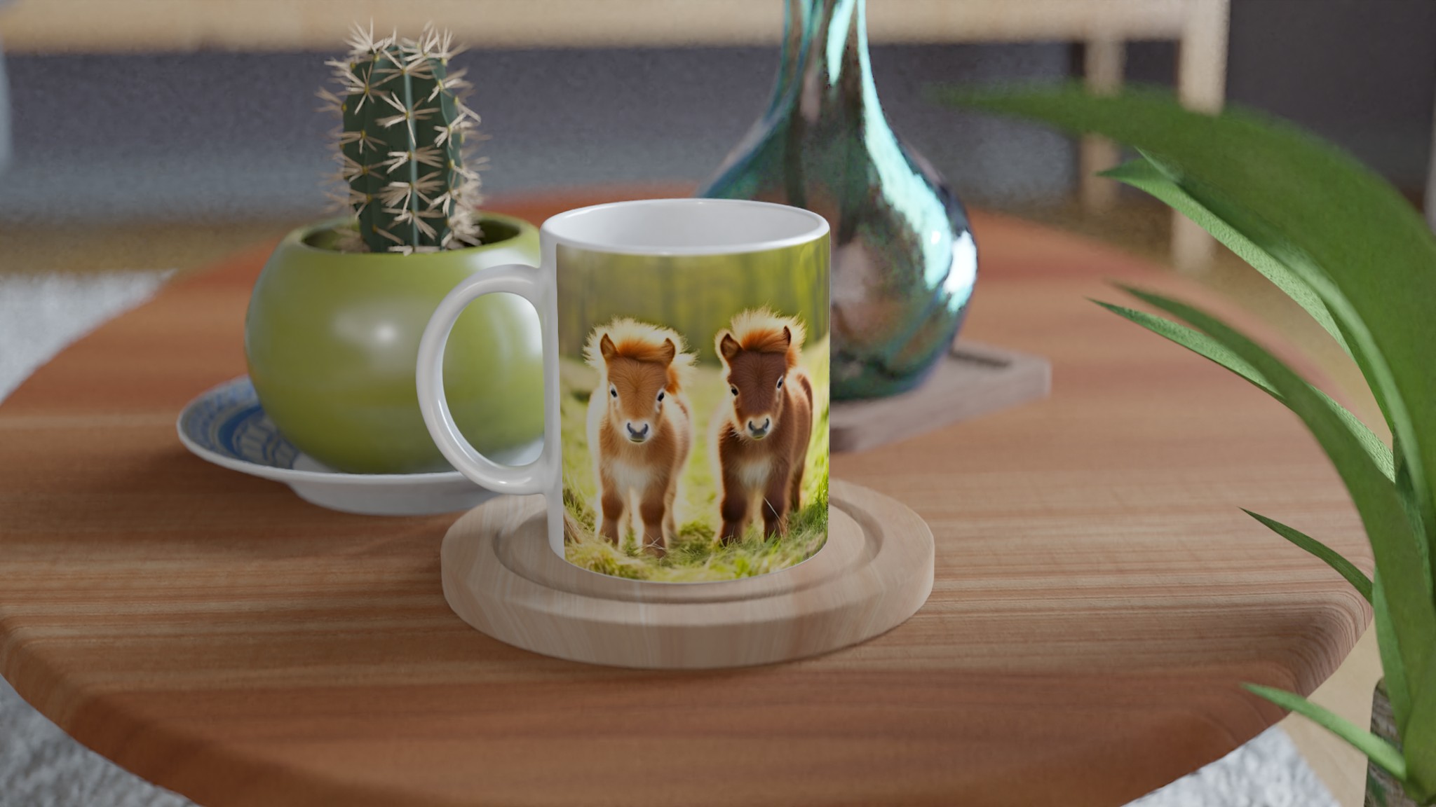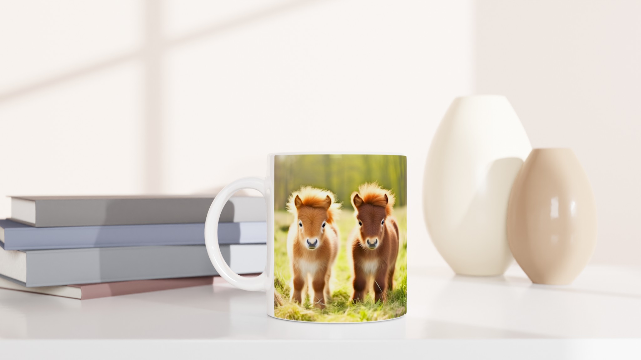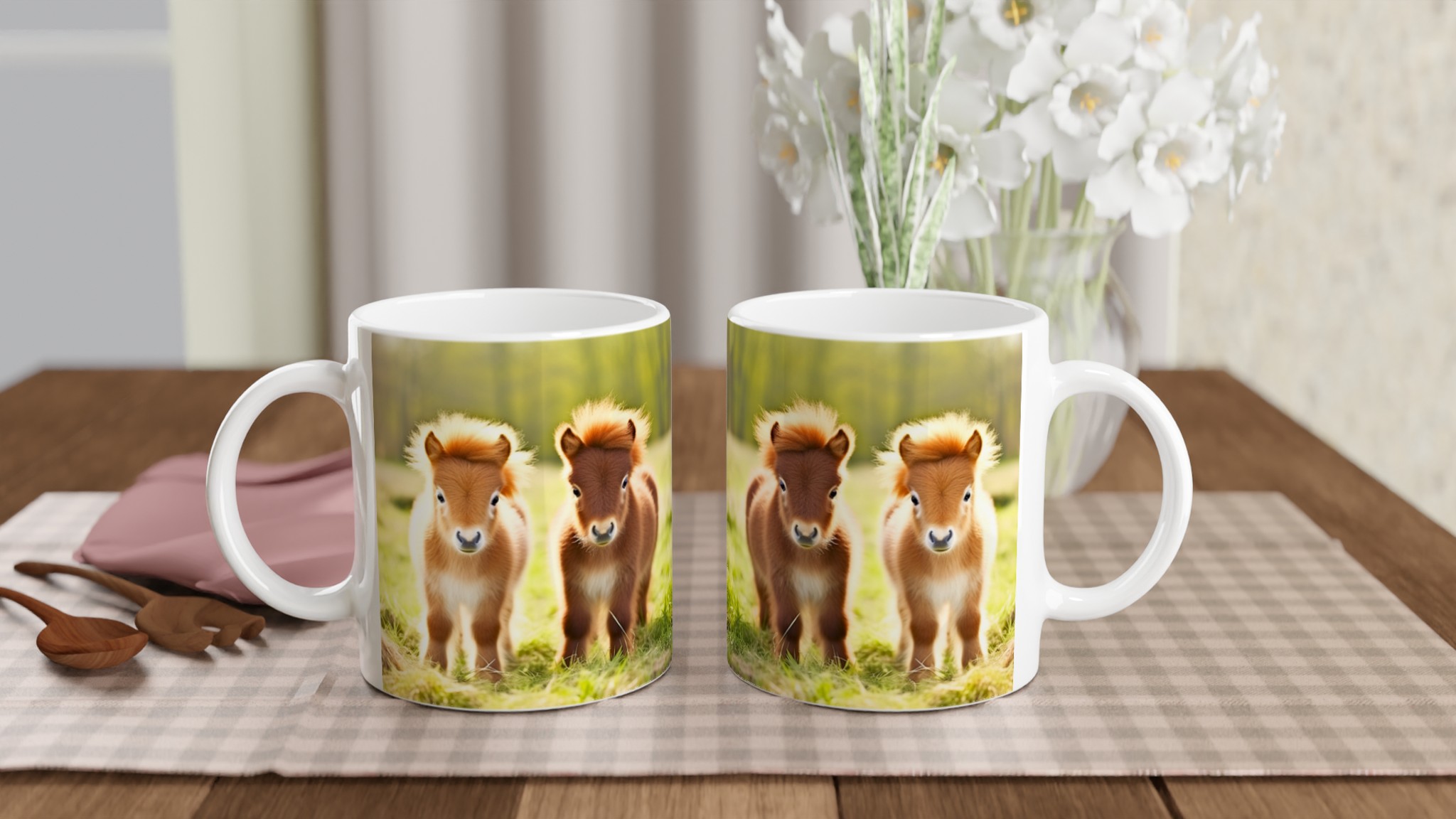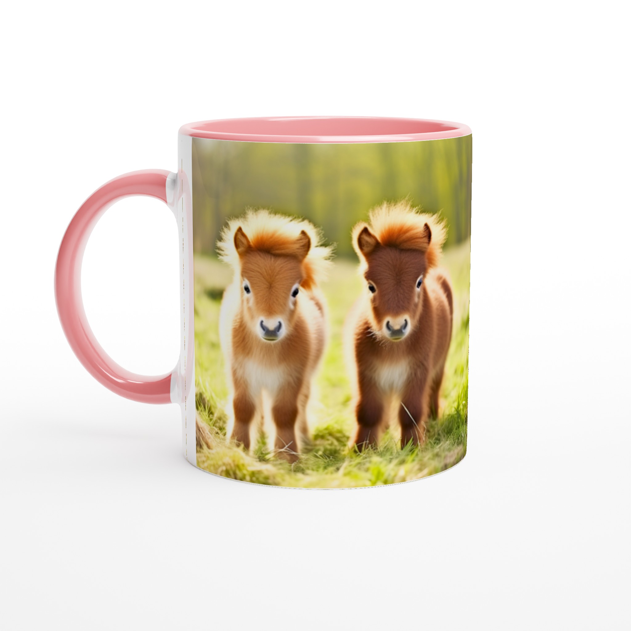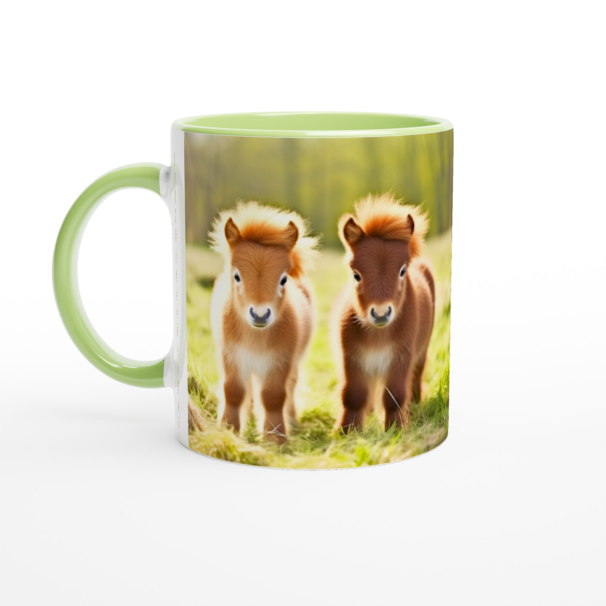 Vakna upp till glädje varje dag med denna oemotståndliga keramiska mugg, prydd med de sötaste små föl som charmar dig med sina fluffiga manar och stora, vänliga ögon. Denna mugg blir snabbt en vardagsfavorit, perfekt för morgonkaffet, kvällens varma choklad eller när du bara vill njuta av en kopp te. Den blanka vita ytan gör att trycken framhävs med klara och levande färger, som håller sig fina även efter många turer i mikron och diskmaskinen.