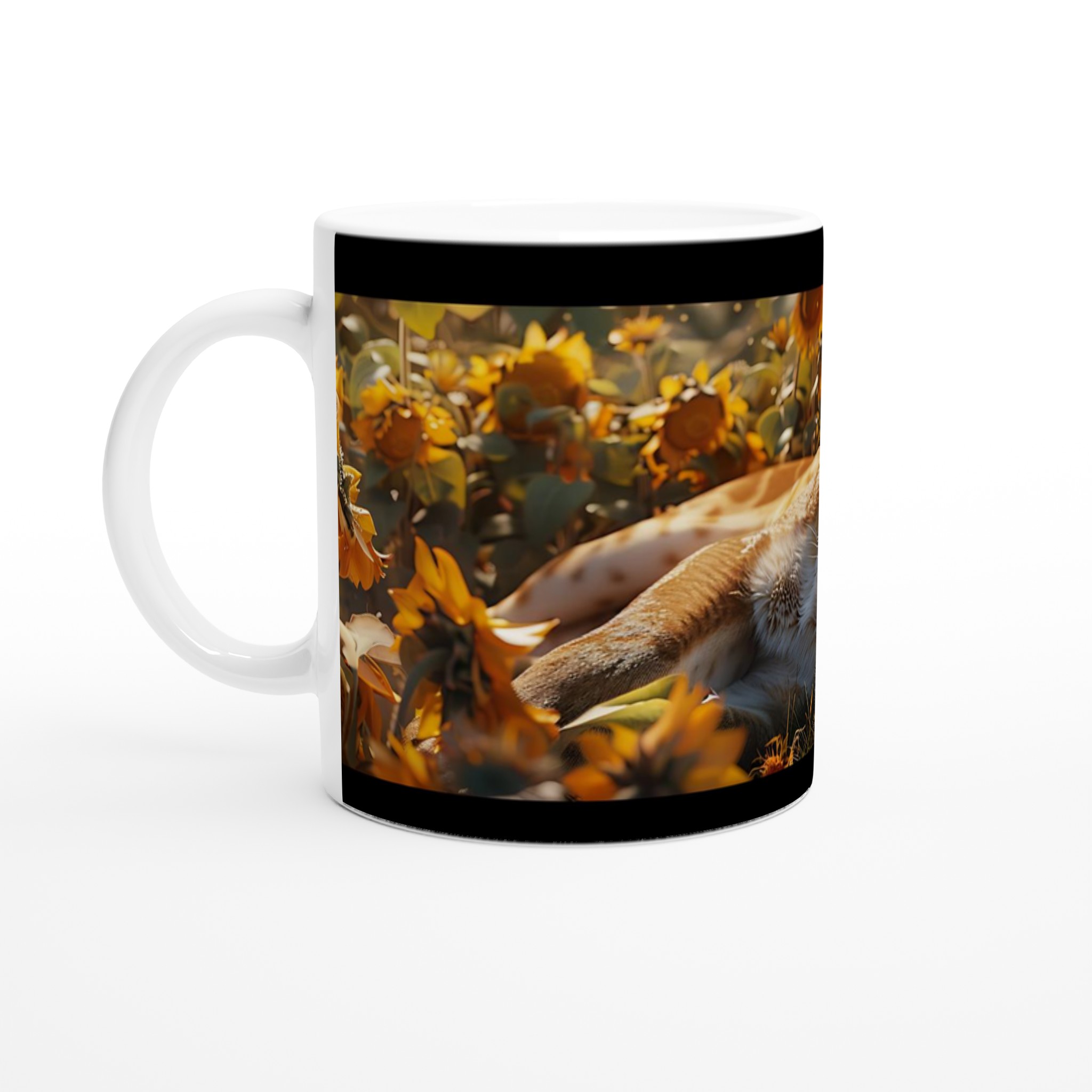 Inspirerad av lugnet hos en sovande lejonunge i ett hav av solrosor, är denna mugg en påminnelse om skönheten i naturen och vikten av avkoppling. Den blanka vita ytan ger ett skarpt och levande tryck som verkligen sticker ut, oavsett om det är en personlig design, ett roligt citat eller en present till någon du tycker om.