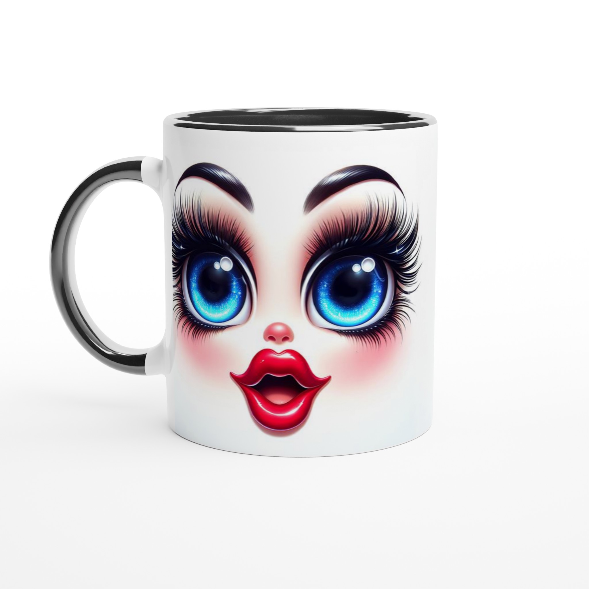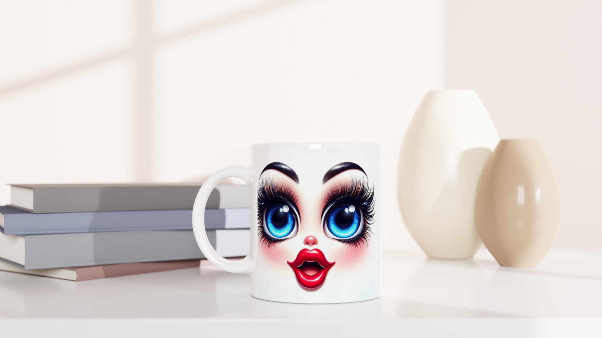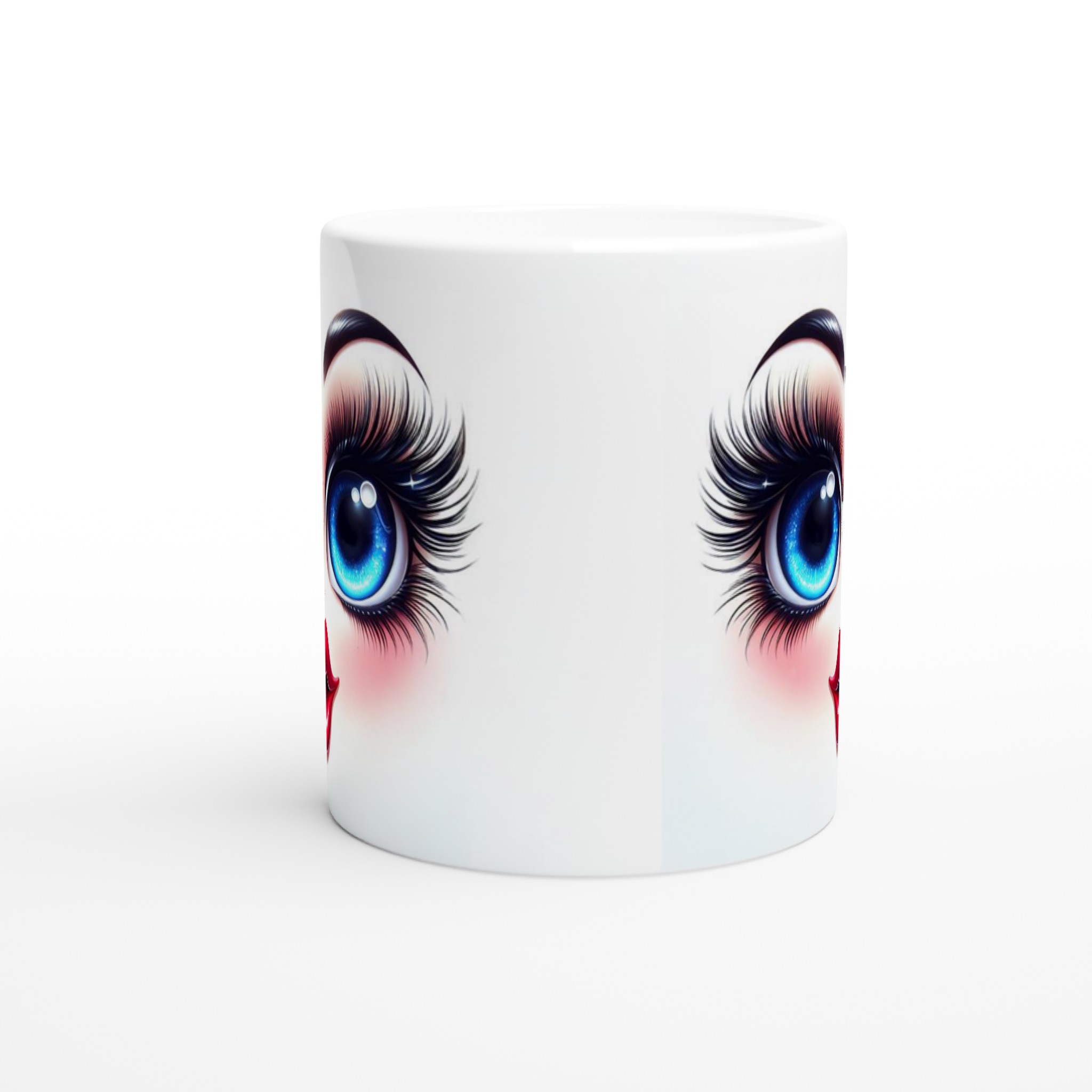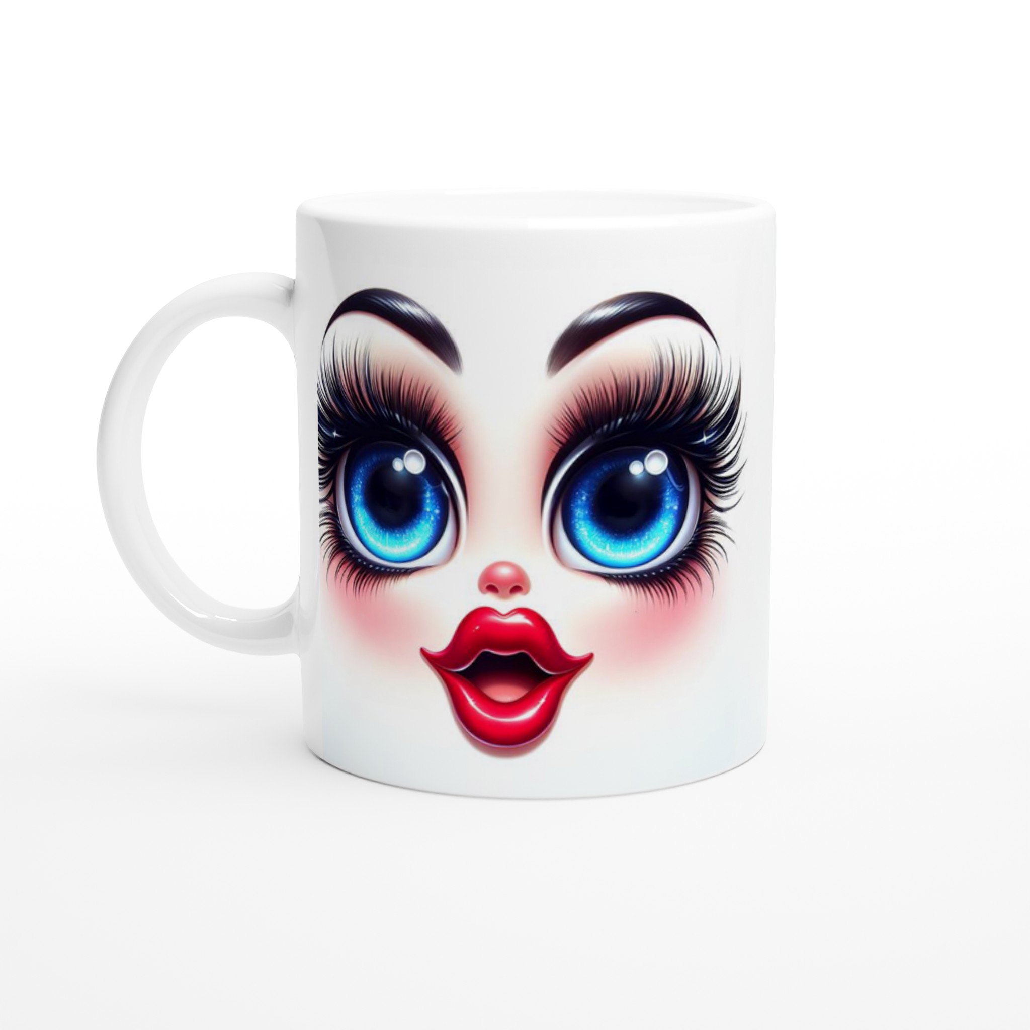 Låt din personlighet stråla med denna bedårande mugg med stora, glittrande blå ögon och lekfulla, röda läppar i en charmig dockstil. Denna unika design fångar blicken och ger varje dryckesstund en touch av fantasi och glädje. Den blanka vita ytan ger ett skarpt och levande tryck som verkligen sticker ut, oavsett om det är en personlig design, ett roligt citat eller en present till någon du tycker om.