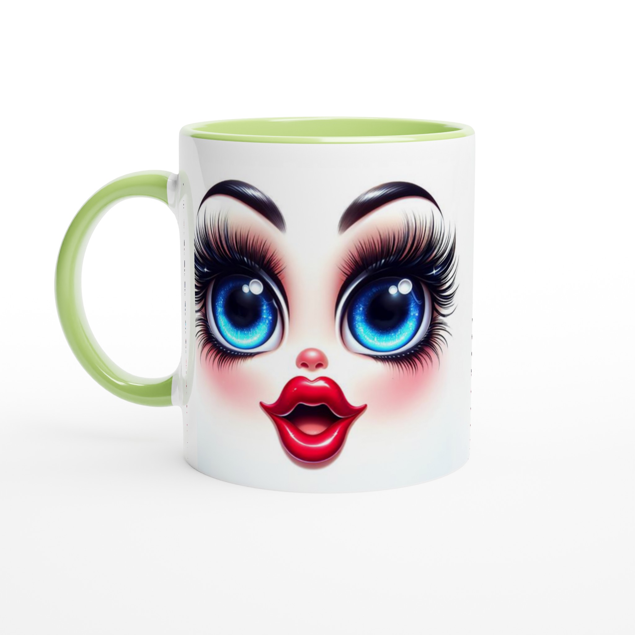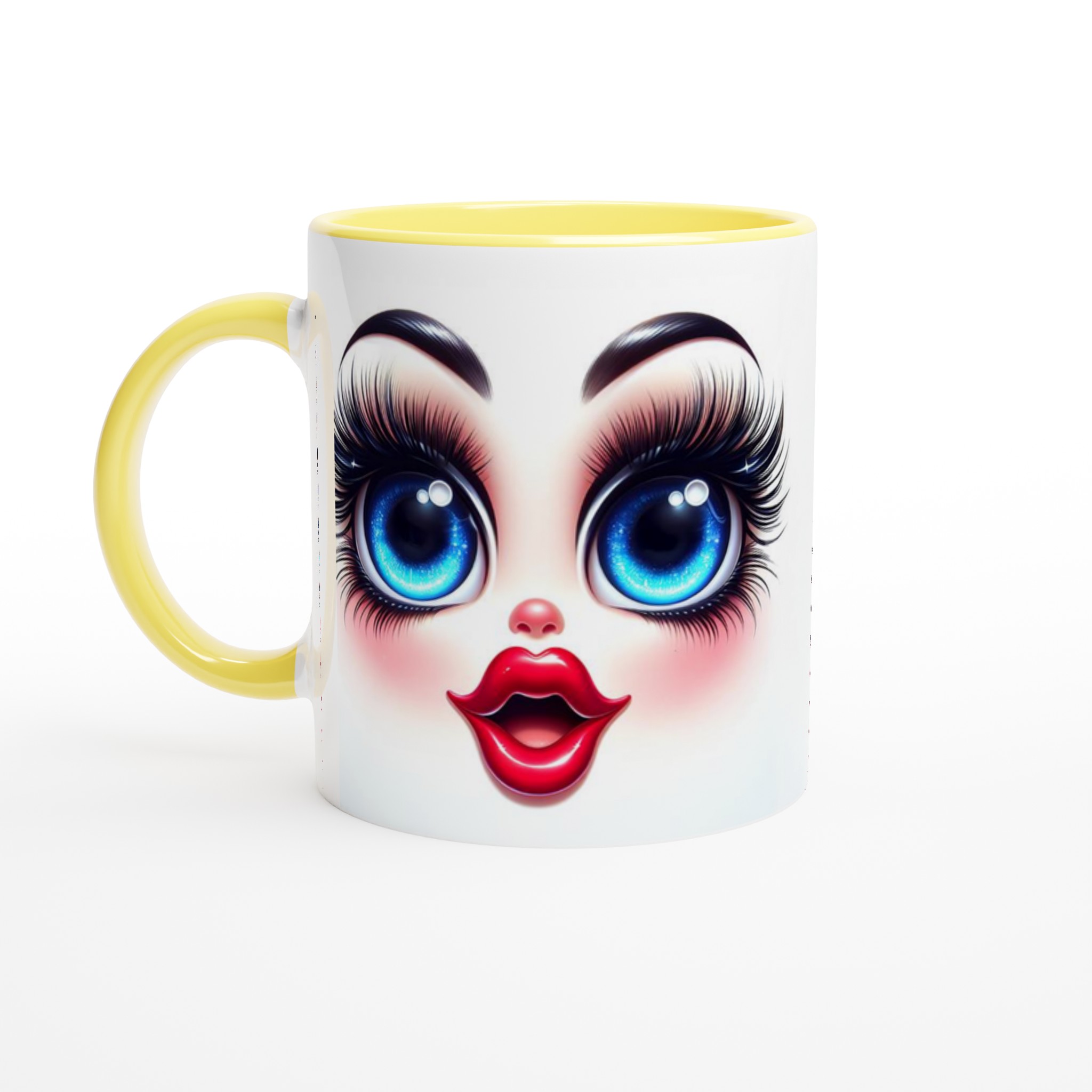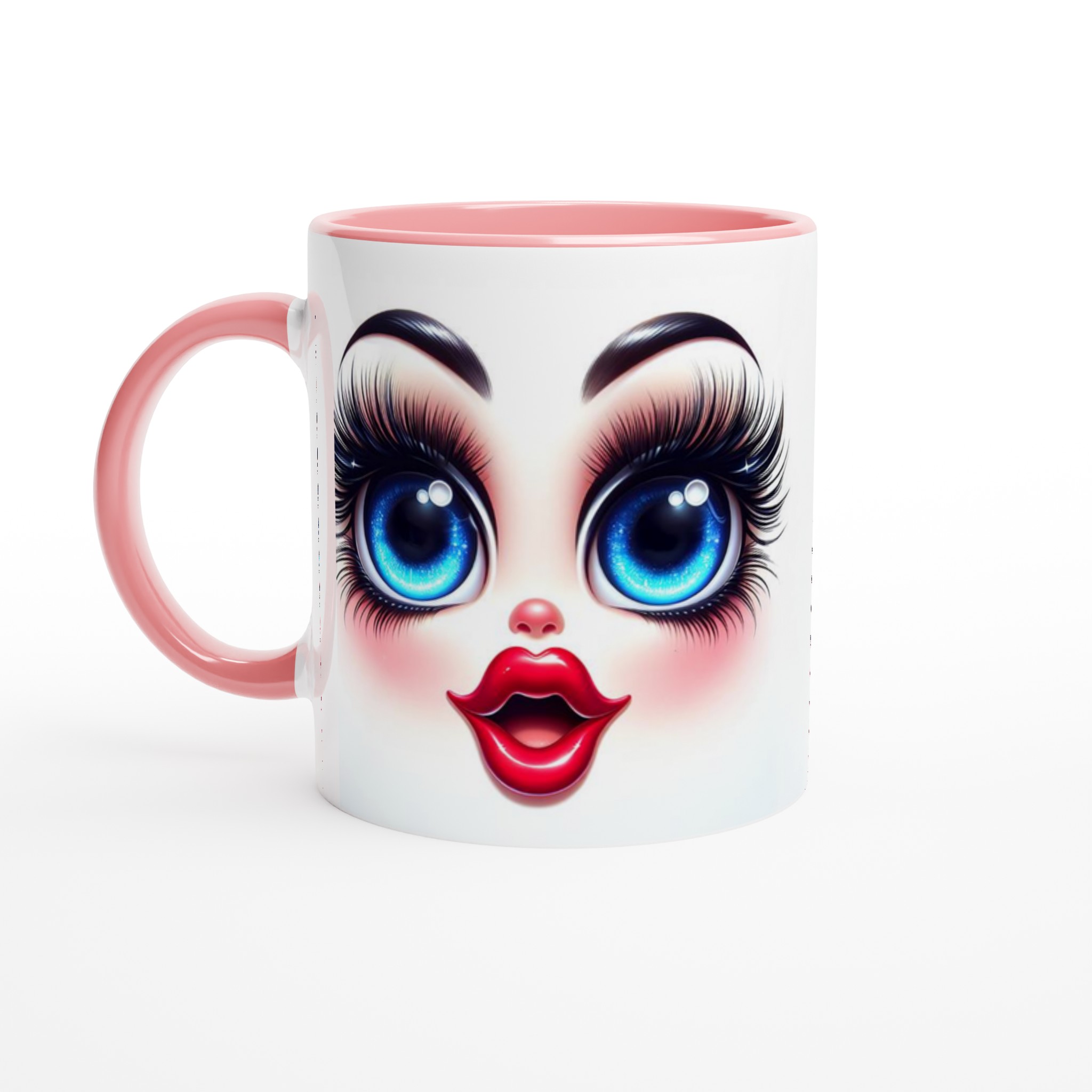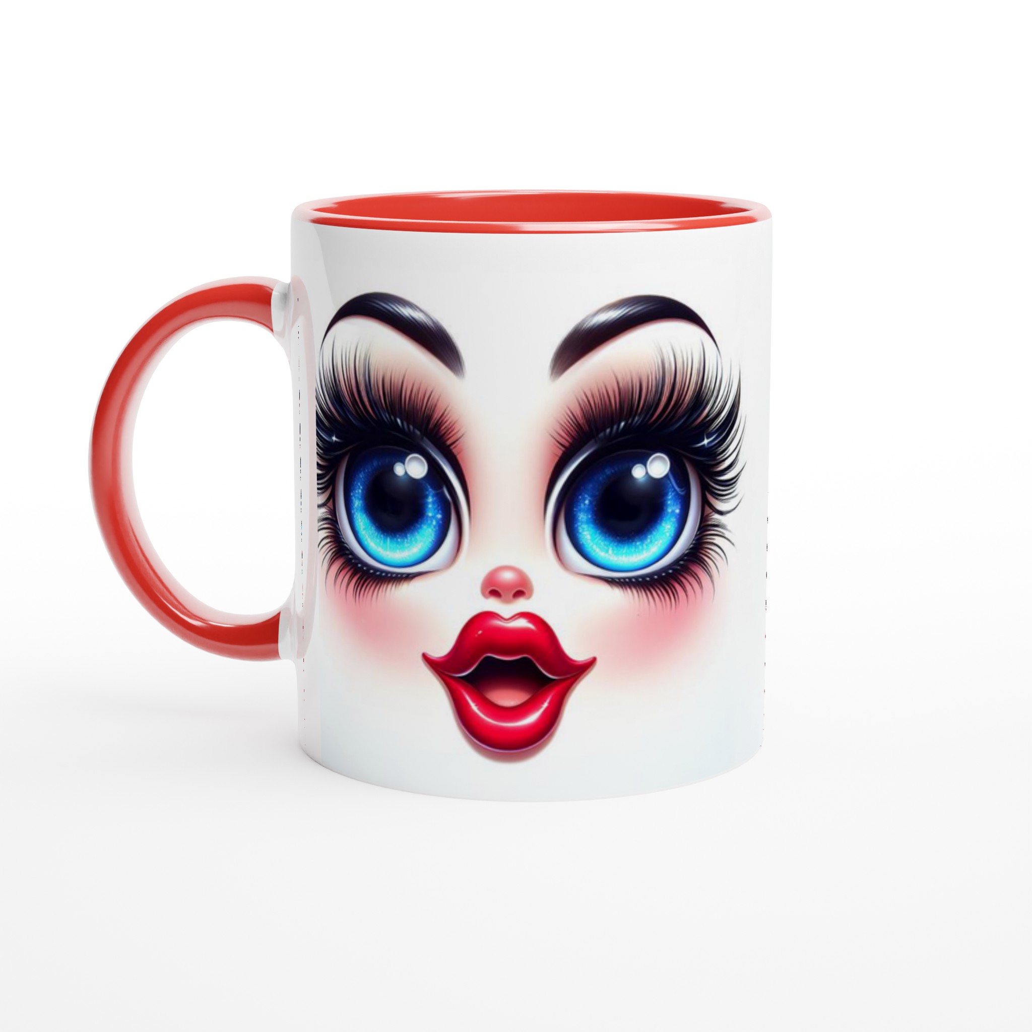 Låt din personlighet stråla med denna bedårande mugg med stora, glittrande blå ögon och lekfulla, röda läppar i en charmig dockstil. Denna unika design fångar blicken och ger varje dryckesstund en touch av fantasi och glädje. Den blanka vita ytan ger ett skarpt och levande tryck som verkligen sticker ut, oavsett om det är en personlig design, ett roligt citat eller en present till någon du tycker om.