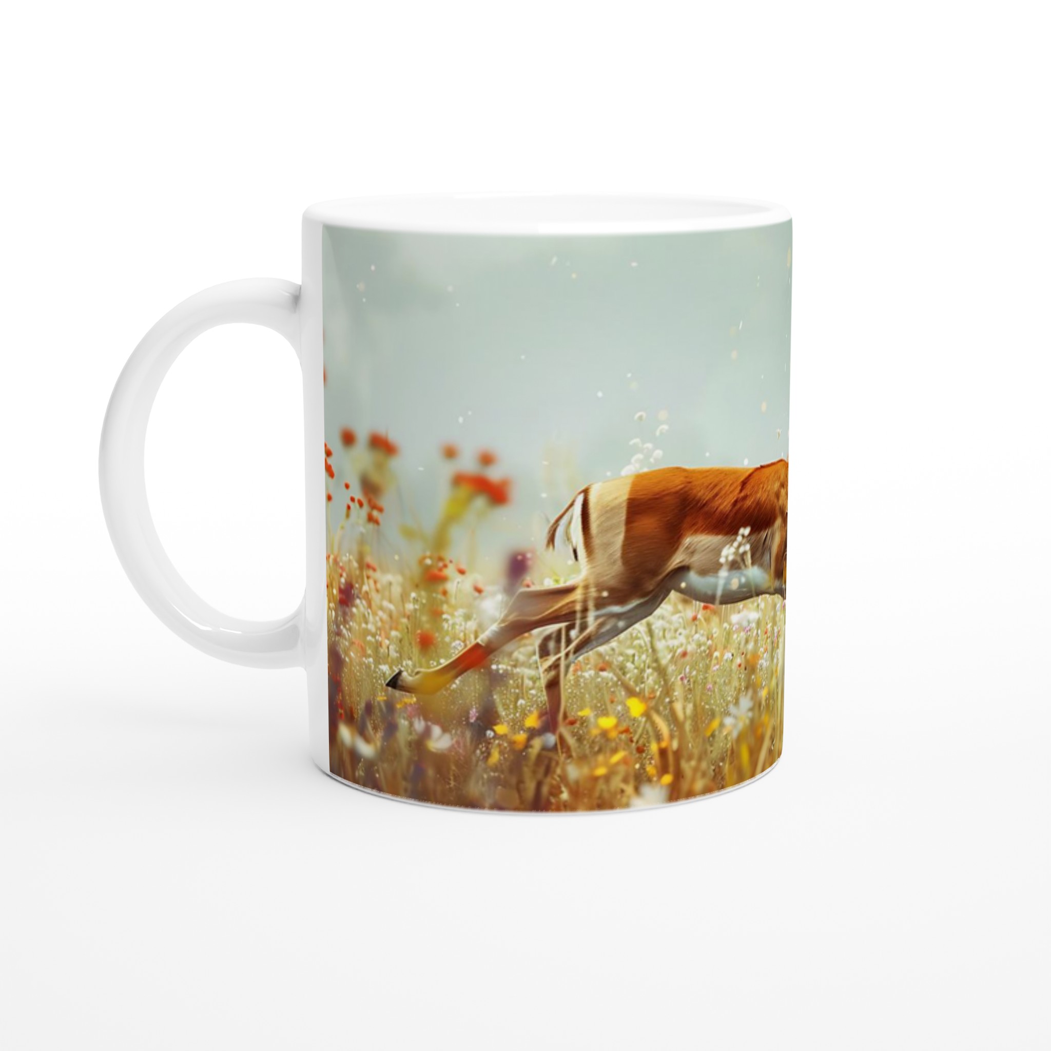 Den blanka vita ytan ger ett skarpt och levande tryck som verkligen sticker ut, oavsett om det är en personlig design, ett roligt citat eller en present till någon du tycker om. Vår Sprudlande Gazell Mugg fångar den livliga elegansen hos en gazell i full fart, omgiven av en blommande ängs frodiga färger och glittrande ljus. Låt denna konstfulla illustration av naturens skönhet och rörelse inspirera din dag, varje gång du tar en klunk.