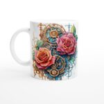 Låt denna charmiga mugg med en fantasifull steampunk-ko, prydd med livfulla blommor, förgylla din fikastund. Varje detalj i designen – från de intrikata kugghjulen till de mjuka blombladen i turkos och orange – skapar en unik visuell upplevelse som blir en samtalsstartare. Perfekt för ditt morgonkaffe, kvällens varma choklad eller när du bara vill njuta av en kopp te med stil.