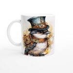 Fånga blickarna med denna unika keramiska mugg, prydd med en fantastisk steampunk-inspirerad blåskrika. De intrikata detaljerna av kugghjul, botaniska element och den majestätiska fågeln i en lugn färgpalett av mjuka blå, persika och neutrala toner skapar en konstnärlig och drömlik känsla. Denna mugg är mer än bara en kopp – det är ett litet konstverk som lyfter din dagliga ritual, perfekt för konstälskare och de som uppskattar en touch av vintage elegans.