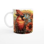 Lyft din dryckesupplevelse med vår unika Keramisk Mugg, en sann vardagsfavorit för alla tillfällen. Prydd med en magnifik steampunk-inspirerad kardinal omgiven av levande solrosor och intrikata mekaniska detaljer, berättar denna mugg en historia med varje klunk. Den rika färgpaletten av varma röda, gyllene gula och lugnande turkos gör varje design till ett konstverk, perfekt för morgonkaffet, kvällens varma choklad eller när du bara vill njuta av en kopp te.
