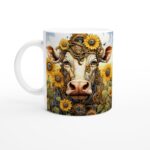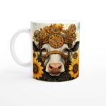 Den här stilrena keramiska muggen, prydd med en fantasifull steampunk-ko, blir snabbt en vardagsfavorit. Perfekt för morgonkaffet, kvällens varma choklad eller när du bara vill njuta av en kopp te. Den blanka vita ytan gör att trycken framhävs med klara och levande färger, som håller sig fina även efter många turer i mikron och diskmaskinen.
