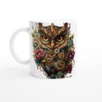 Förvandla din fikastund till en konstupplevelse med denna unika keramiska mugg, prydd med en majestätisk steampunk-uggla. Dess intrikata design, där ugglans fjädrar smälter samman med gyllene kugghjul och livfulla solrosor, skapar en fascinerande blandning av natur och maskineri. Den blå och gula färgpaletten framhävs vackert på den blanka vita ytan, vilket gör varje detalj levande och iögonfallande.